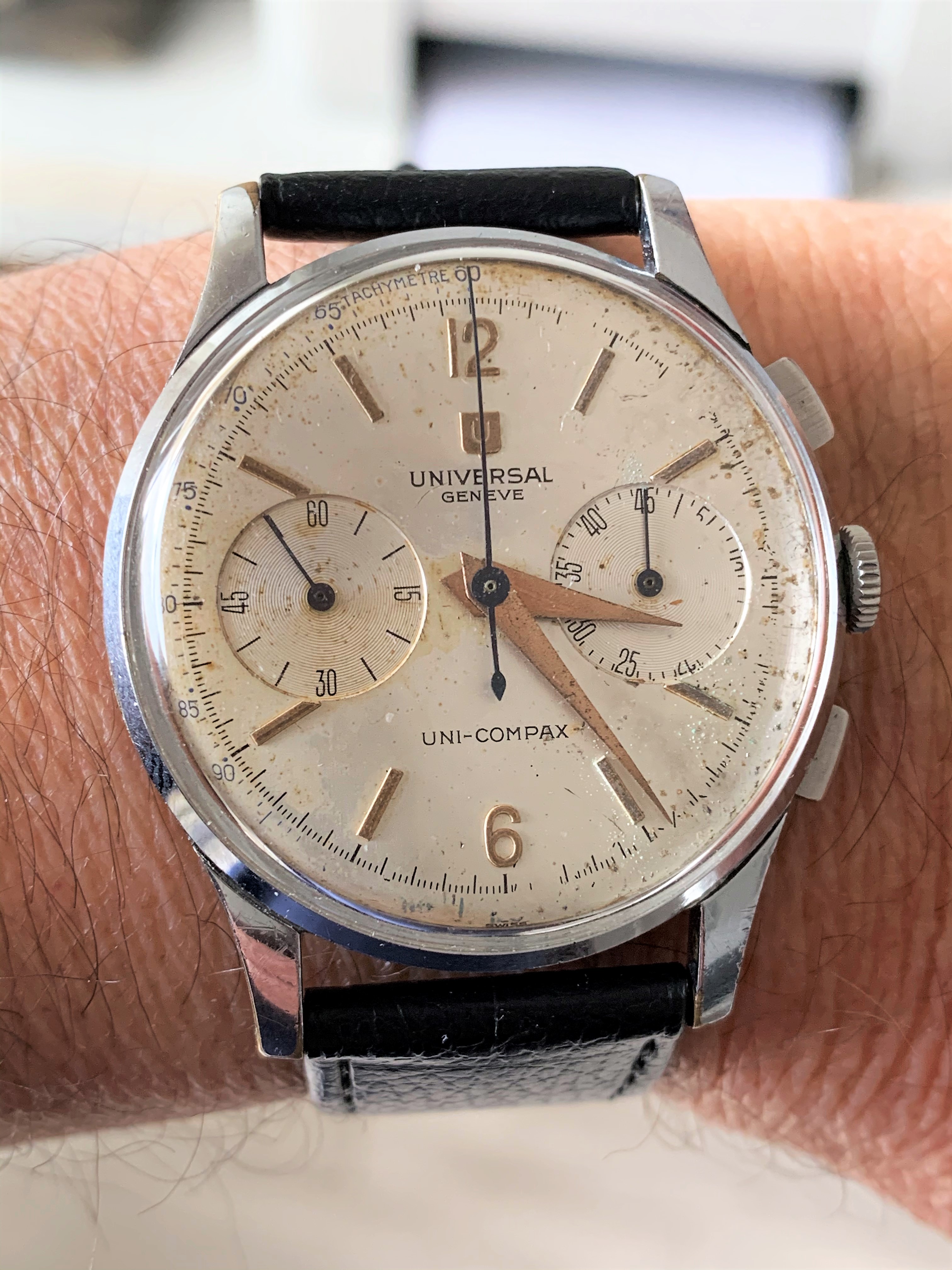 Posts 441 Likes 3,611 zebrespace 路Jan 4, 2023 And tomorrow maybe this Uni Compax Ref.32416-5 Year 1957 37 mm., unfortunately the dial is not in good condition