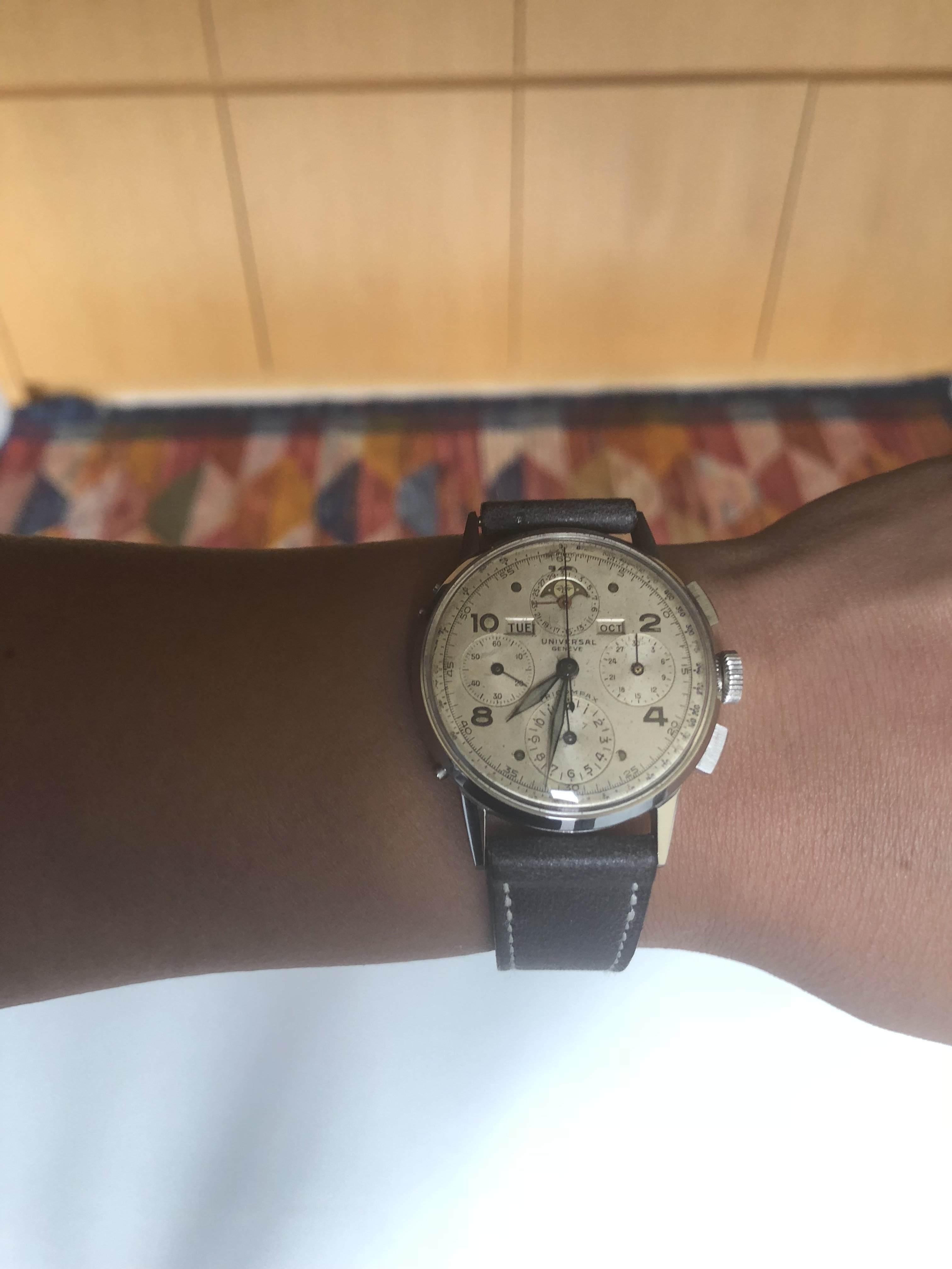 New acquisition, on the smaller side but REALLY cool three hander ! Magnificent lugs, and nice original dial. I think nobody from OF bid too much because of the size. Patek Philippe ref 96 are on the small side and still in 5k range, IMHO this watch by UG is just as elegant. I had a 18k rose gold Vacheron Constantin I sold for $2500 many years ago that measured 31 mm.