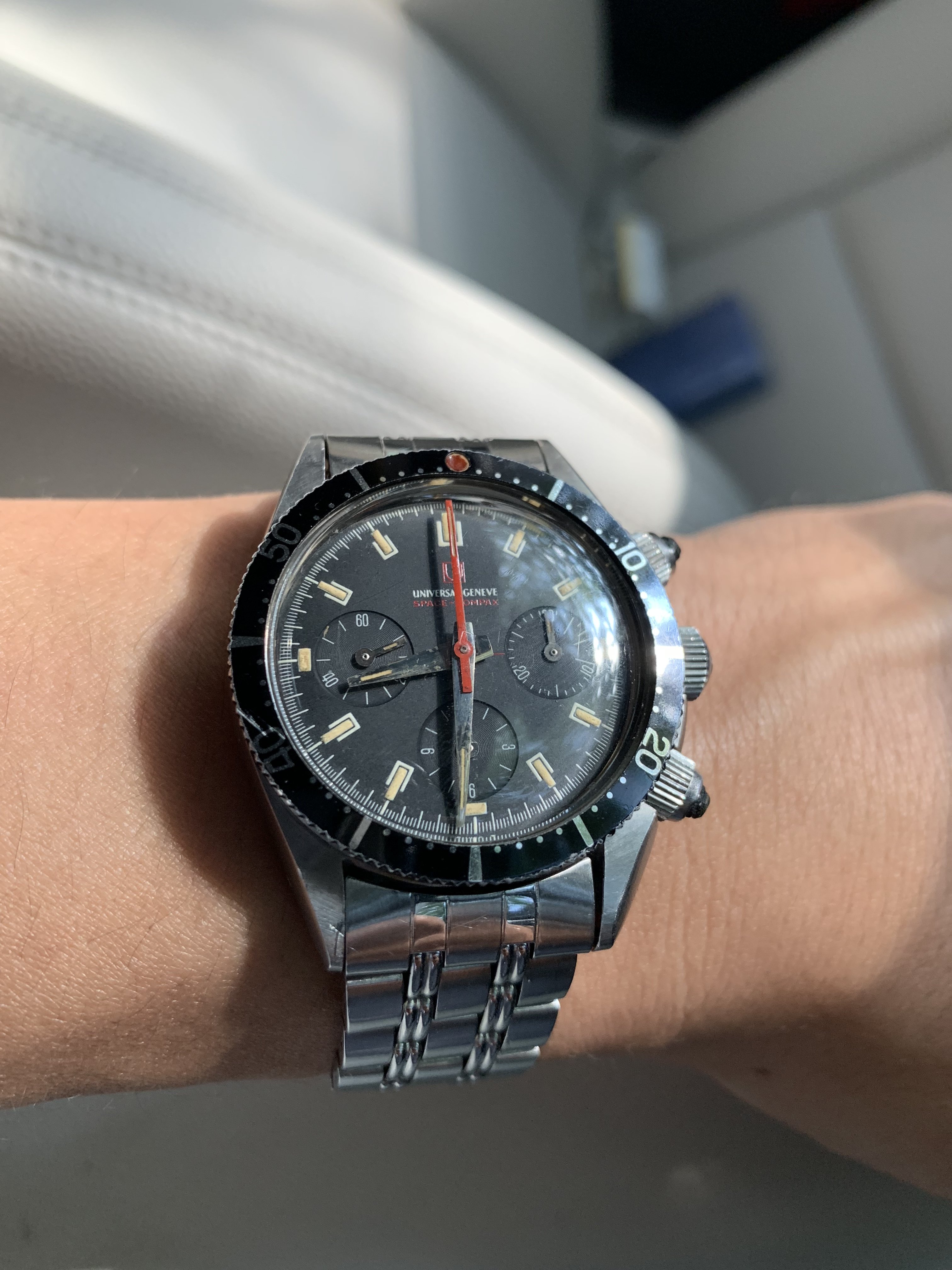 The one I saw on eBay was probably a 18k calatrava 32 mm. Poor dial and it sold for 5k. Aesthetically I really believe that this 32mm steel UG is as elegant as the overpriced steel PP ref 96 that I've actually seen in person. The finish is obviously better on the PP movement, but the overall look is pretty plain, nice markers, but does it warrant 50 times the value ? I think not at this point in my collecting. It comes down to PP history and the fact very few stainless steel ones were produced. The one my father gave me is actually a small SS tank with 9-90. movement. Do vintage collectors even look very much at three hander PP anymore ? I have several, wish there was more interest in them. They sit on eBay and I doubt very many are sold ? Chronographs are where it's at in vintage watch collecting IMHO ! I passed on many UG Nina, and Eric CLapton Tri-Compax looking at dress PP that were boring old school 18k watches your dad and mine wore.