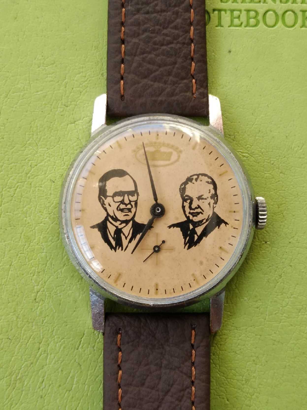 The communists ran the joint from 1917 until the concept went bust, but their mentality didn't change overnight. In fact Putin considers the fall of the USSR to be one of the great disasters of the 20th century. The watch in question is along the lines of other such watches made in the USSR over the years, usually with Soviet figures (cosmonauts, Olympic heroes, politicians and the like). Who knows, maybe they made a watch of Khrushchev banging his shoe at the UN.