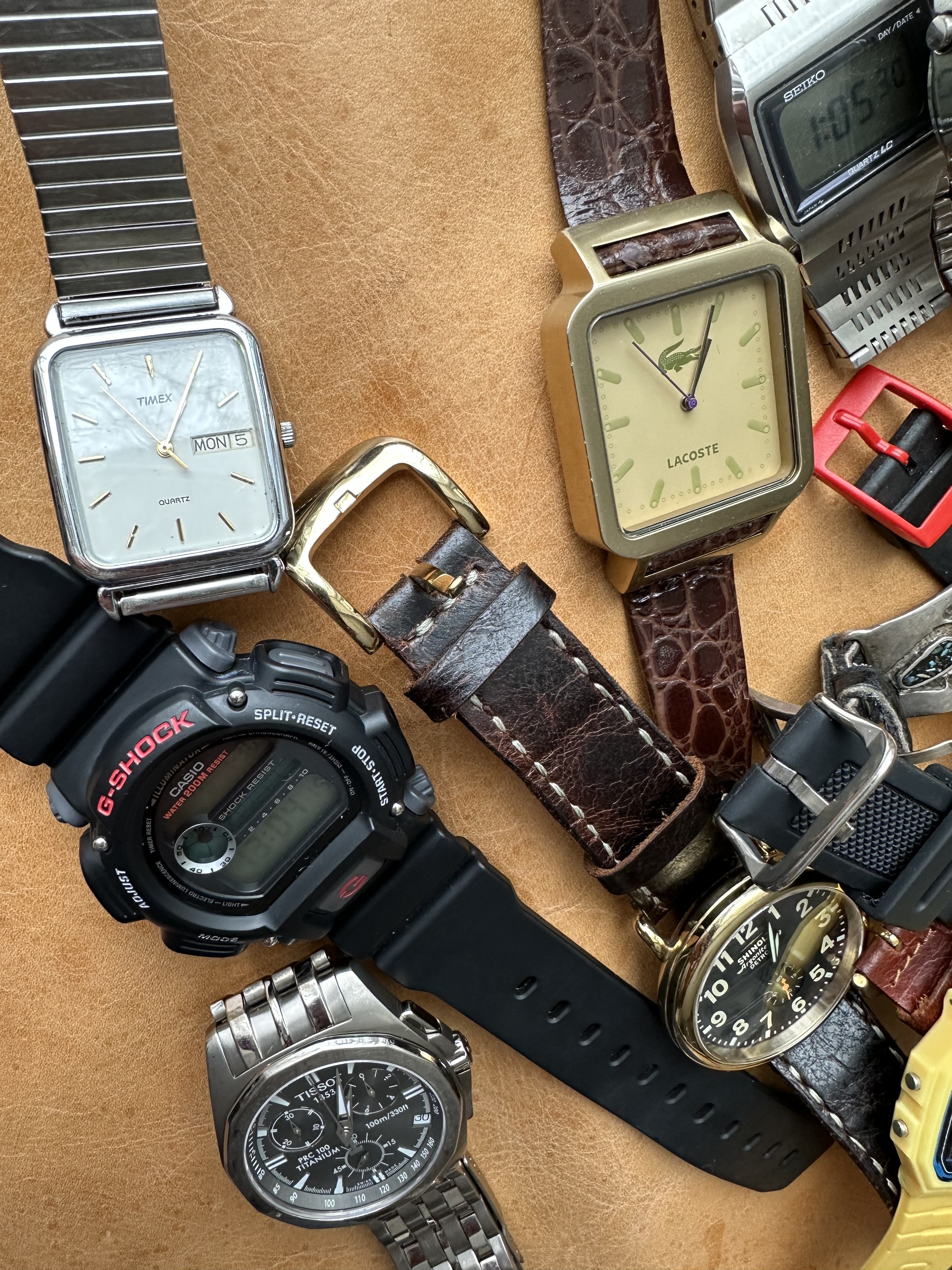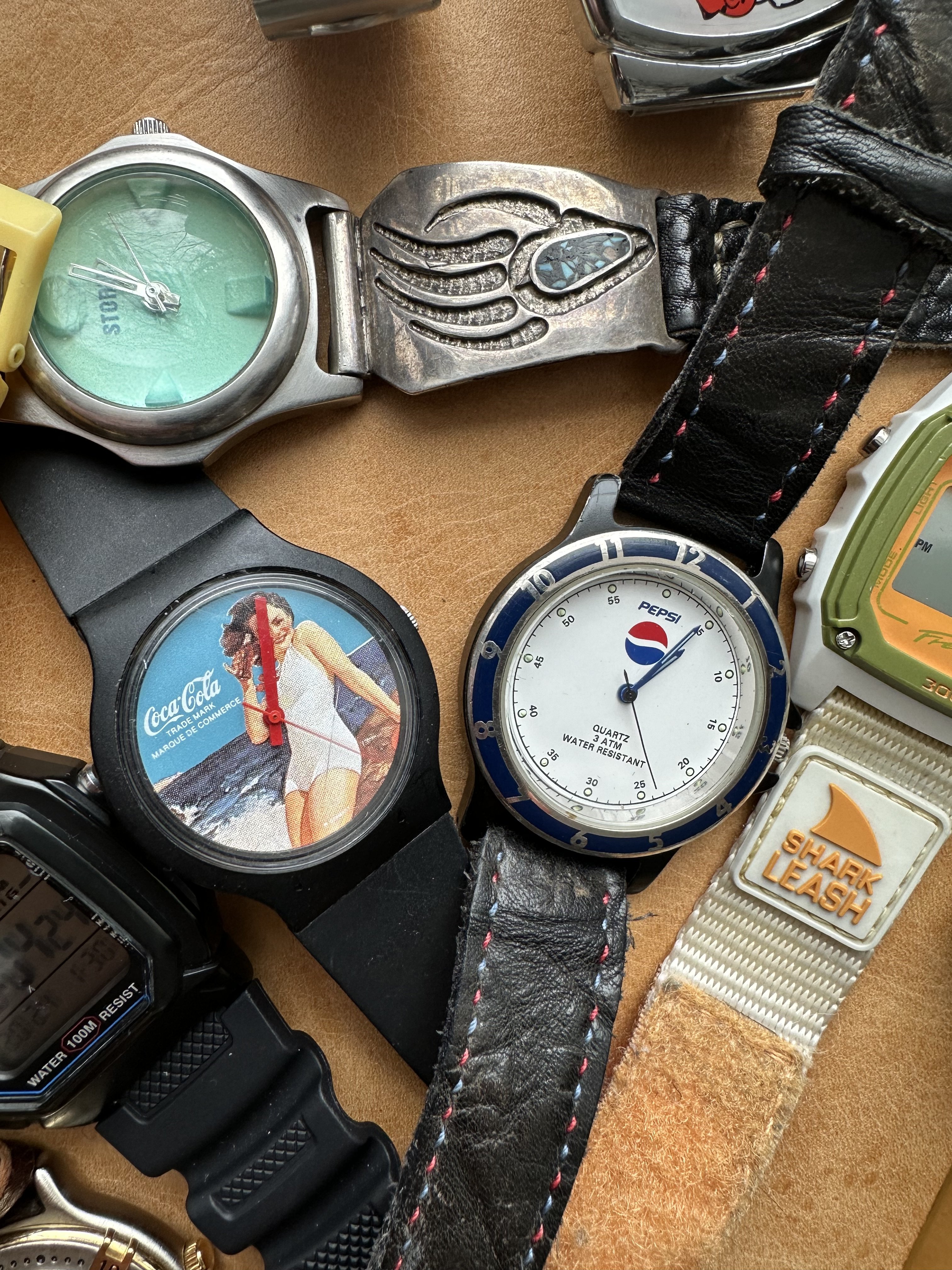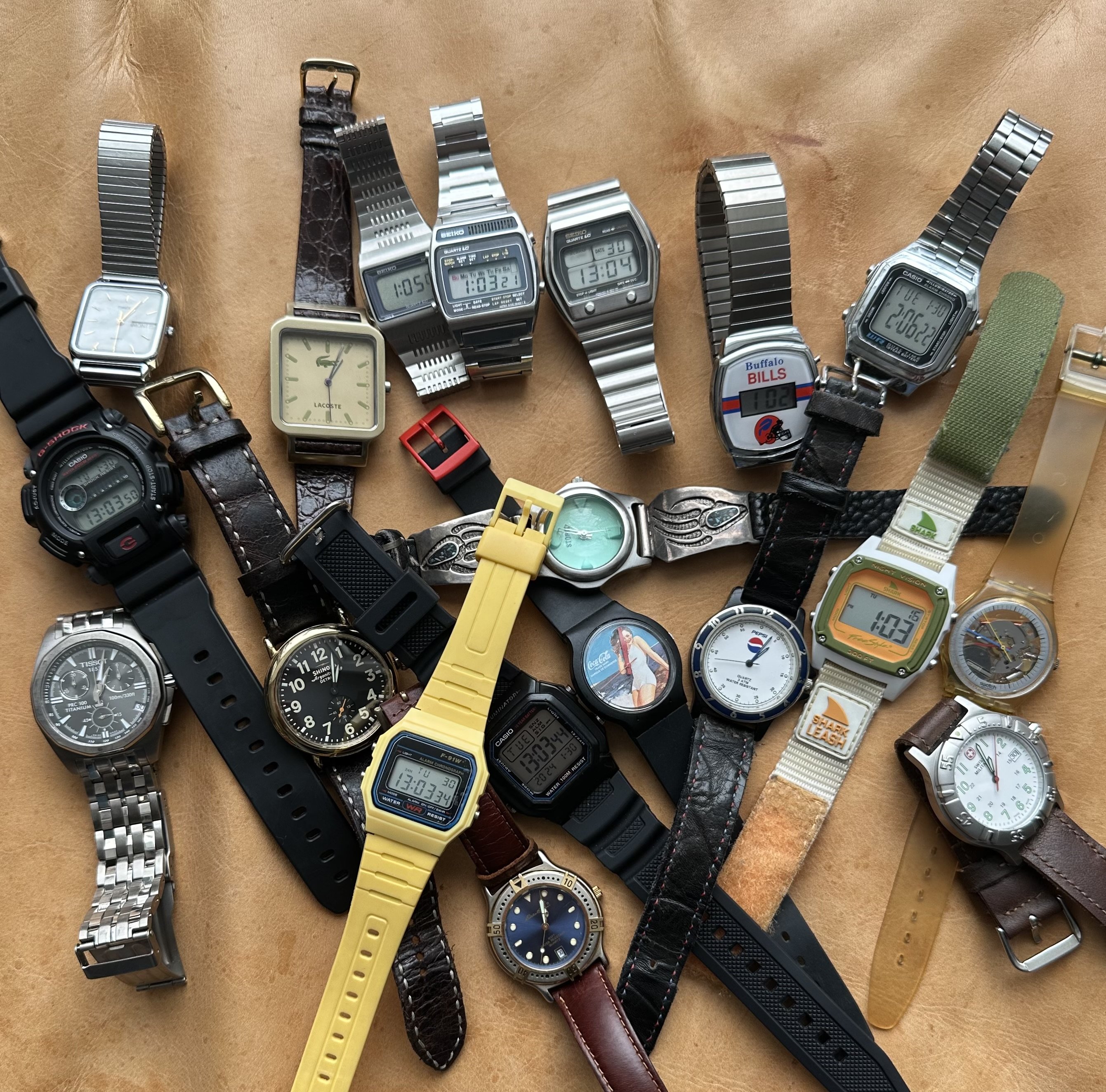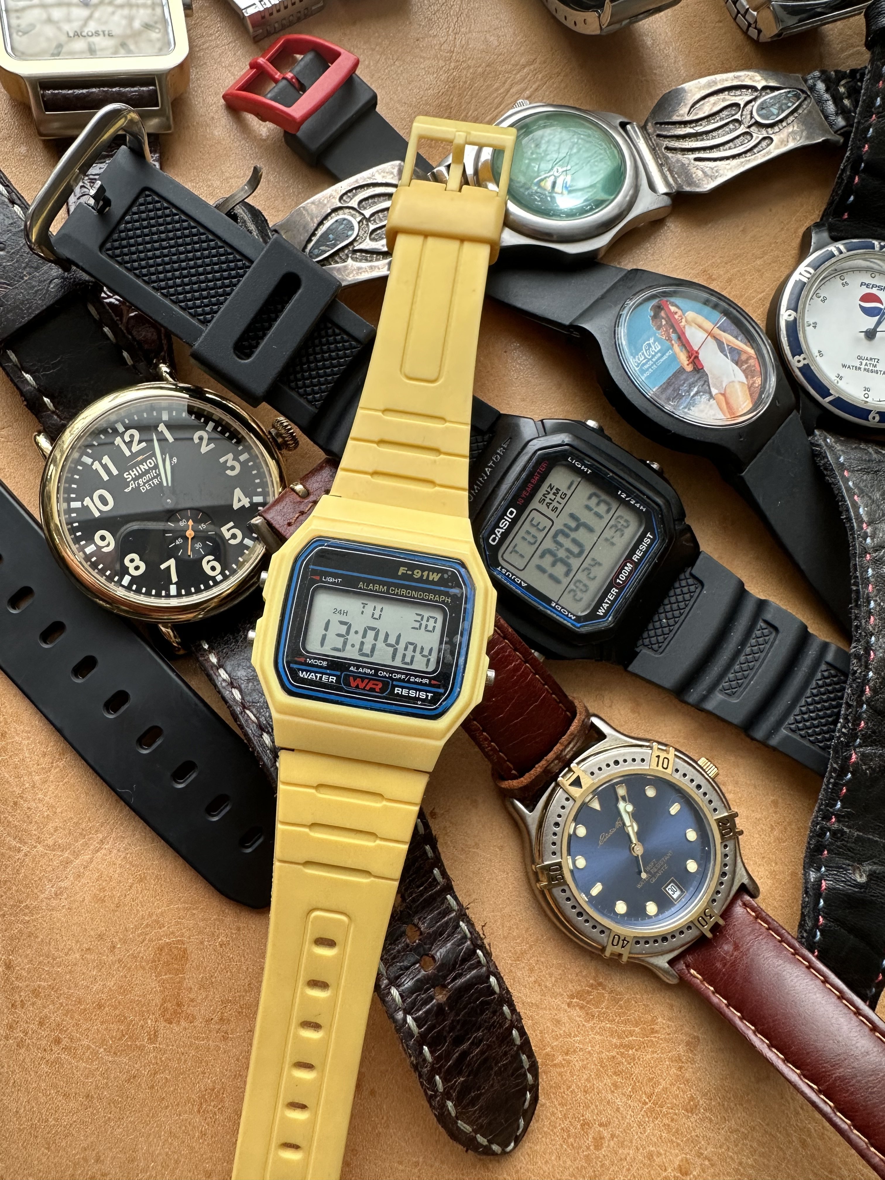 The Shinola was a gift from my wife on my first day of retirement. We are also big fans of Detroit as a city. It gets a bad rap and is always trying to overcome it. The Timex has a nice white dial. The Lacoste is one of the many here used by my wife. The yellow Casio is also used mostly by my wife. I have never worn the other Casio but could not let it sit at the store for $5.99. The blue dial watch is marked Eddy Bauer and screams 90s. The Coke and Pepsi cost about the same as a personal size bottle at 7-Eleven. Not that I would ever choose Pepsi over Coke… The Storm reminds me of that early 60s deep water Rolex with the exaggerated crystal. I added the sterling silver olongapo. The Seikos are solid. The one with the front pushers was bought here on OF. The others for only a few dollars. I have a fourth, a Bond Seiko that works but is being (hoping) repaired due to a non functioning pusher. The Freestyle looks like the Casios. I like the strap on that one. These were used by surfers in the 80s. I suspect that this one is only a few years old. Nice colour. And the Bills watch? High and left. The Swiss Military came with a metal bracelet and was with the Titanium Tissot. It was NOS. The bracelet is huge and would be loose even on @Bill Sohne . I don’t know how to shorten it so I am using this one piece strap that I made. The Swatch is unusual enough that I removed the battery.
