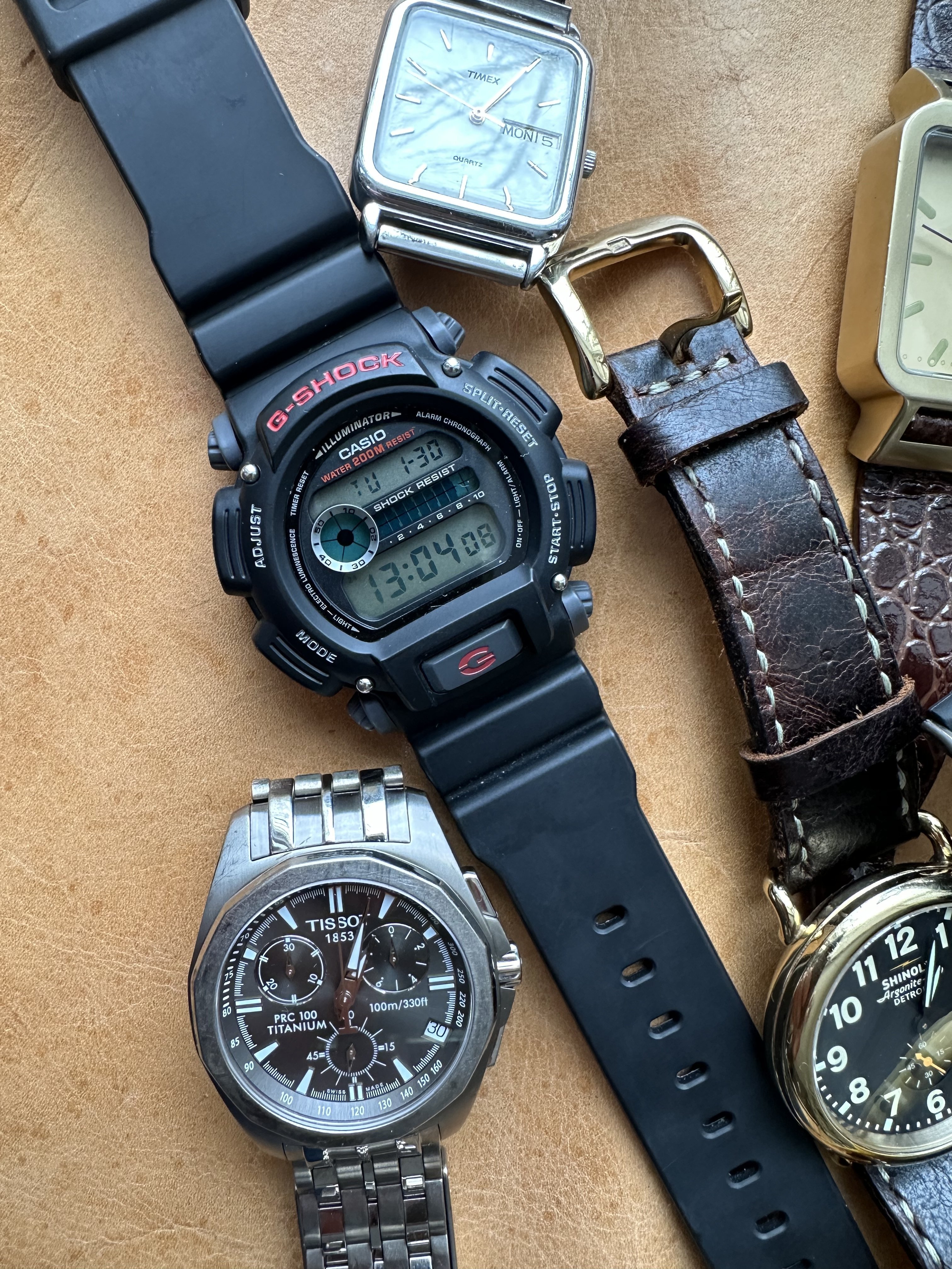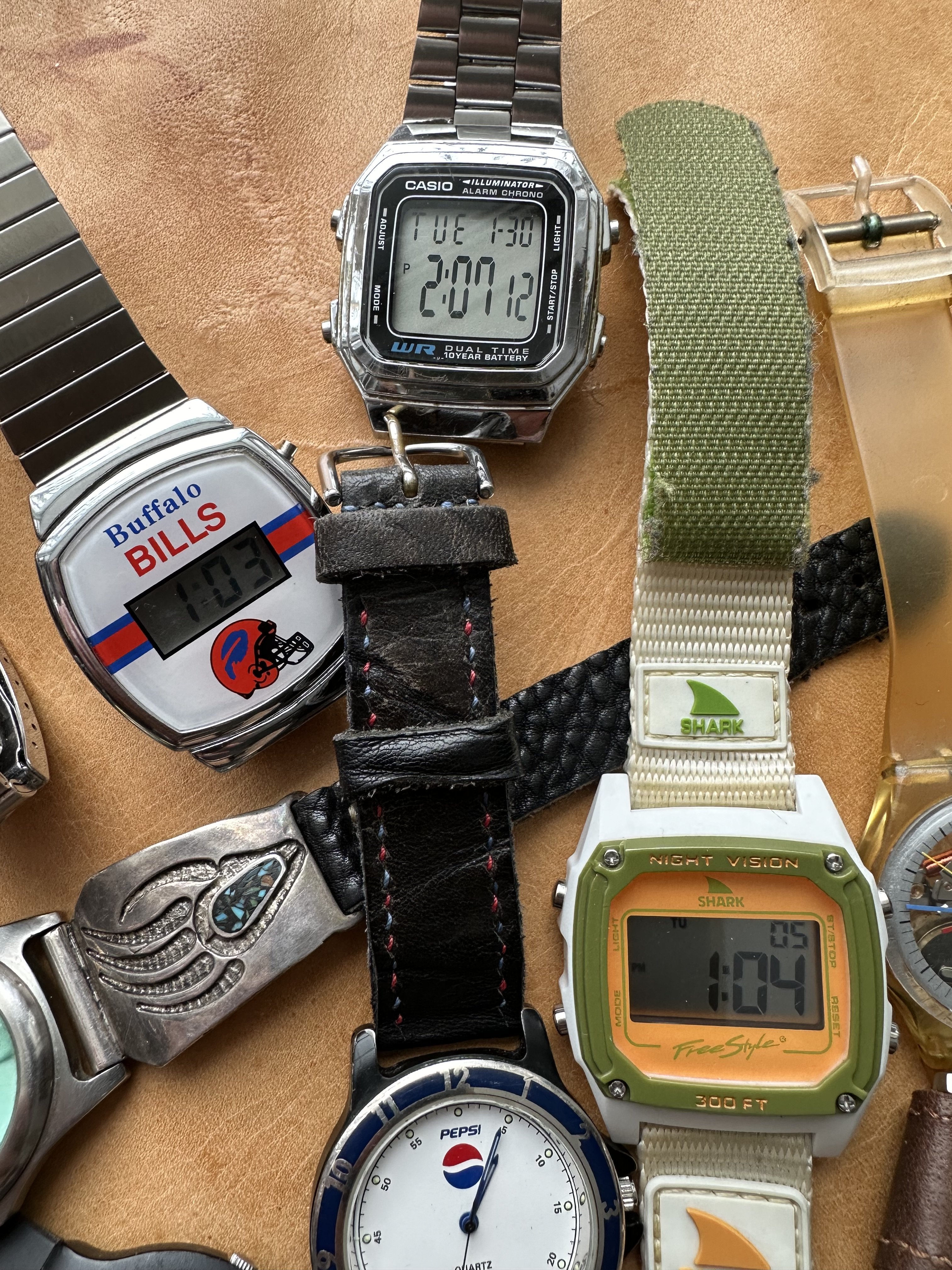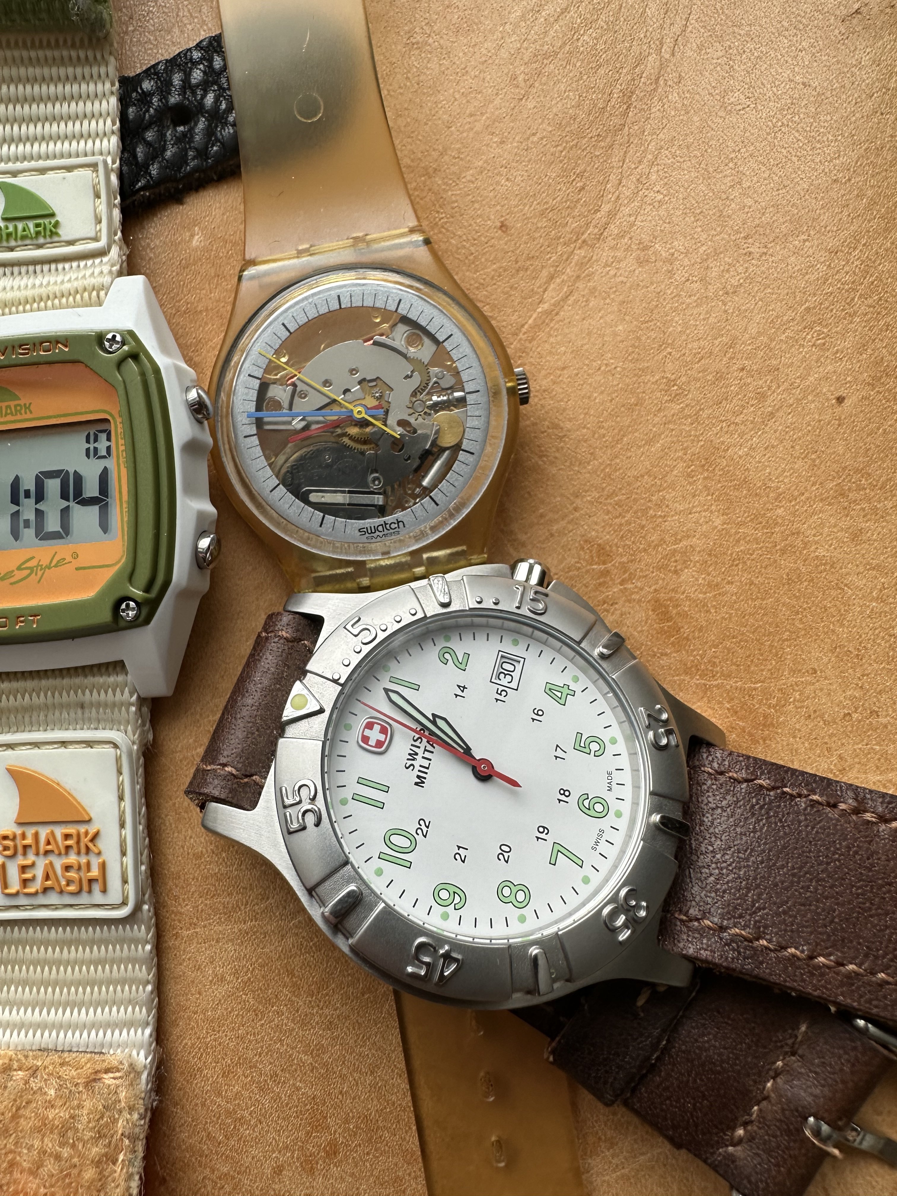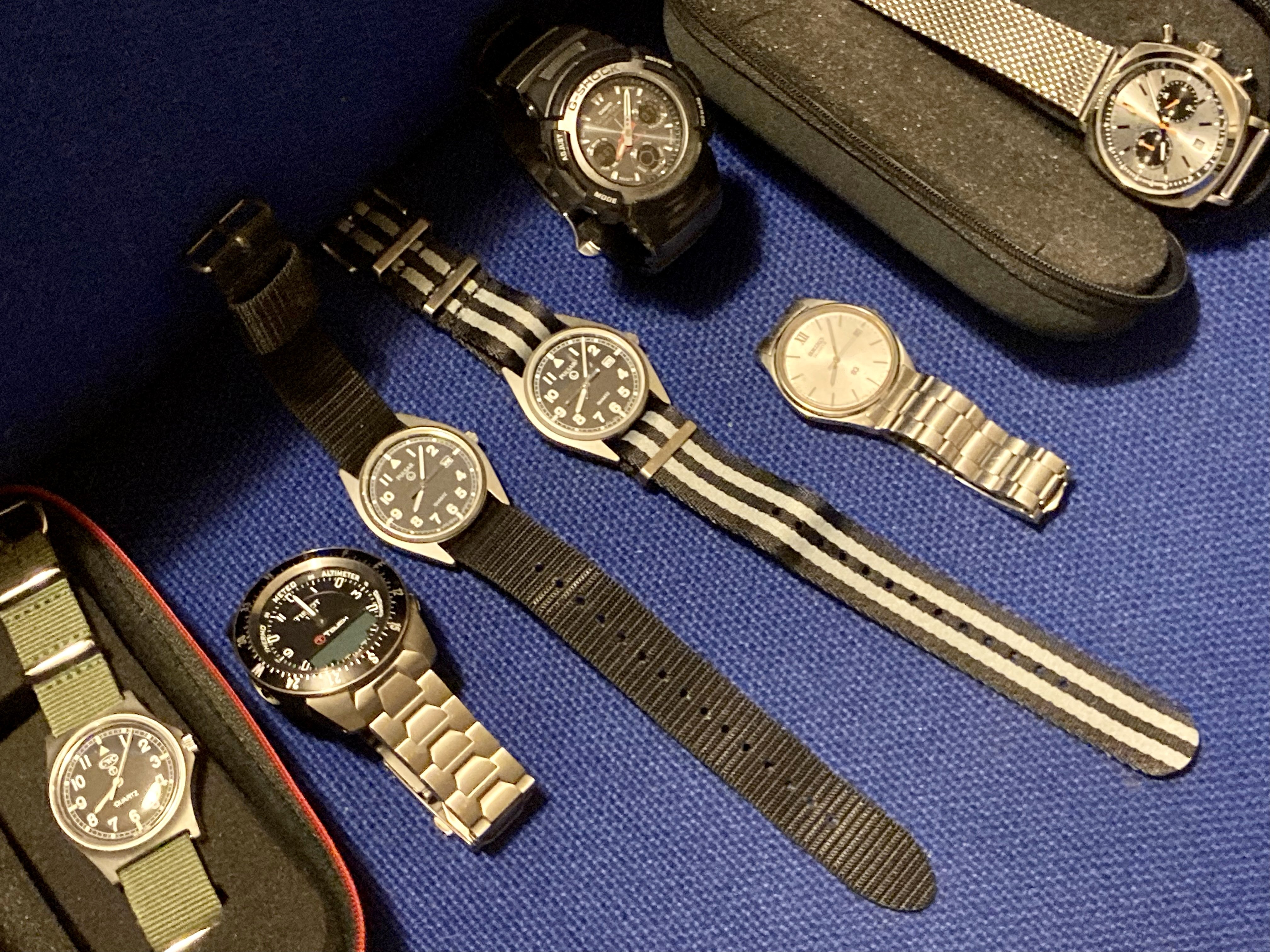 The Shinola was a gift from my wife on my first day of retirement. We are also big fans of Detroit as a city. It gets a bad rap and is always trying to overcome it. The Timex has a nice white dial. The Lacoste is one of the many here used by my wife. The yellow Casio is also used mostly by my wife. I have never worn the other Casio but could not let it sit at the store for $5.99. The blue dial watch is marked Eddy Bauer and screams 90s. The Coke and Pepsi cost about the same as a personal size bottle at 7-Eleven. Not that I would ever choose Pepsi over Coke… The Storm reminds me of that early 60s deep water Rolex with the exaggerated crystal. I added the sterling silver olongapo. The Seikos are solid. The one with the front pushers was bought here on OF. The others for only a few dollars. I have a fourth, a Bond Seiko that works but is being (hoping) repaired due to a non functioning pusher. The Freestyle looks like the Casios. I like the strap on that one. These were used by surfers in the 80s. I suspect that this one is only a few years old. Nice colour. And the Bills watch? High and left. The Swiss Military came with a metal bracelet and was with the Titanium Tissot. It was NOS. The bracelet is huge and would be loose even on @Bill Sohne . I don’t know how to shorten it so I am using this one piece strap that I made. The Swatch is unusual enough that I removed the battery.