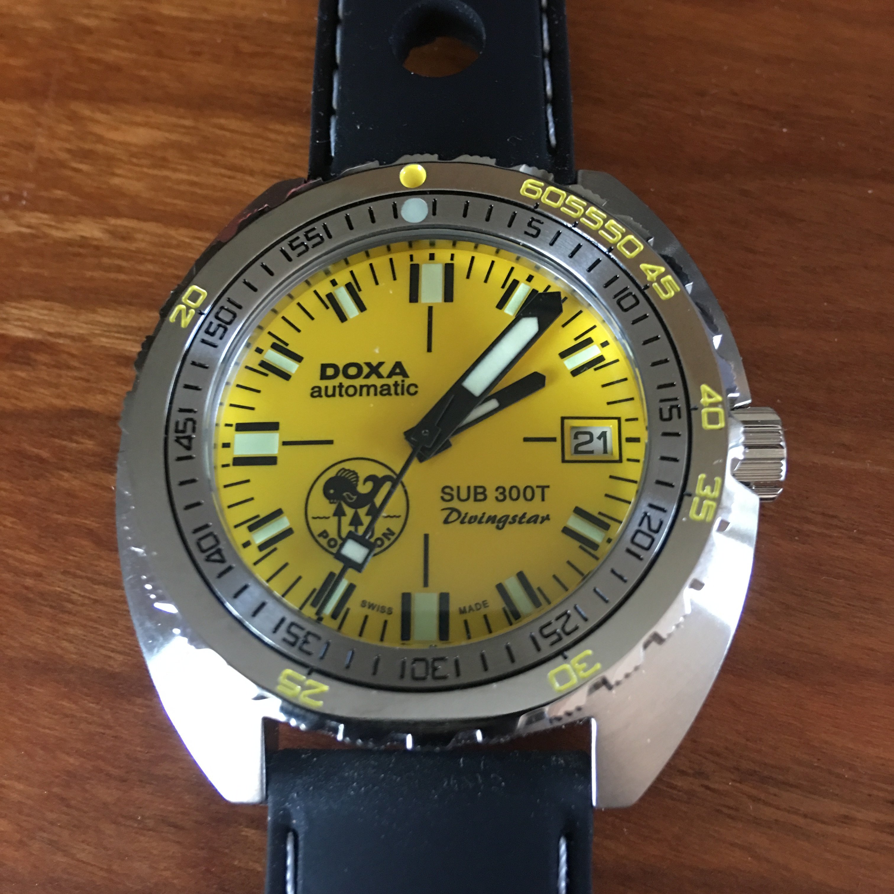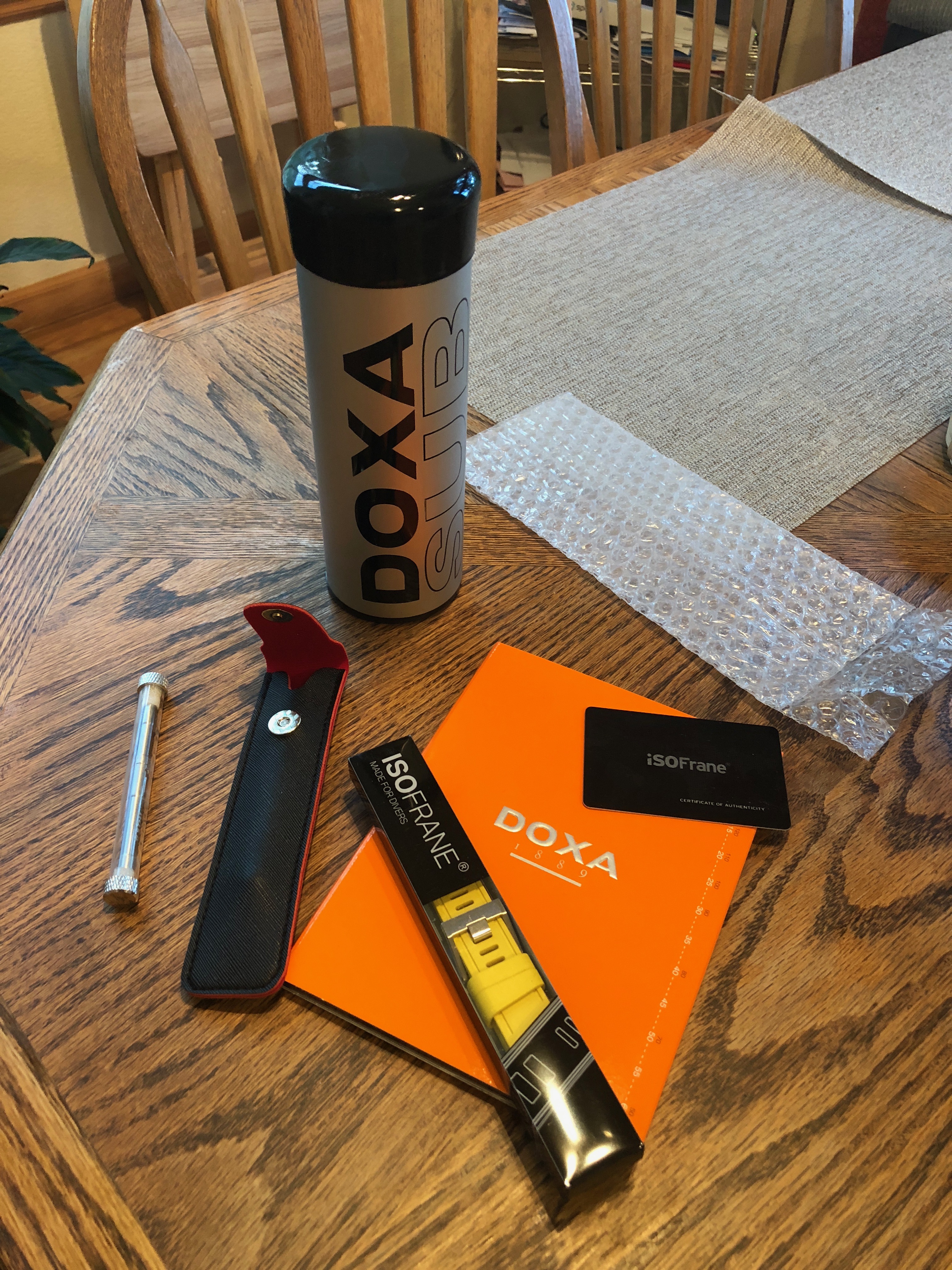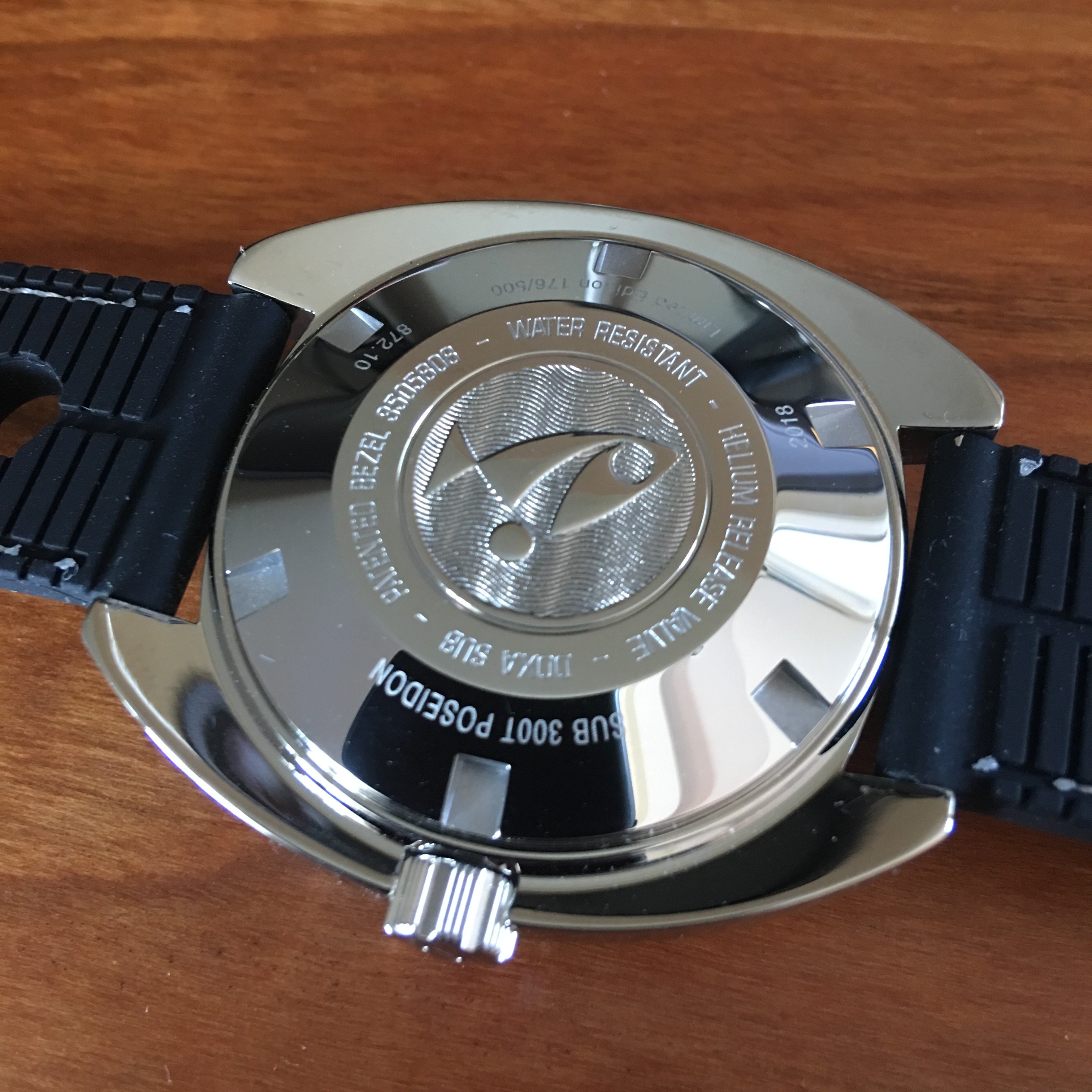 The scuba tank case is nice, weighty, and solid, but not quite as cool looking or as functional as the lighter plastic scuba tank case from my Citizen Promaster Dive Watch, which slides open to access the watch and looks more like a scuba tank at the top. The rubber cap on the top of the DOXA tank/tube seals the DOXA case so well that the pressure inside the case makes it hard to remove and replace the cap. You could use it to bury cash and jewels in the backyard, to keep them safe.