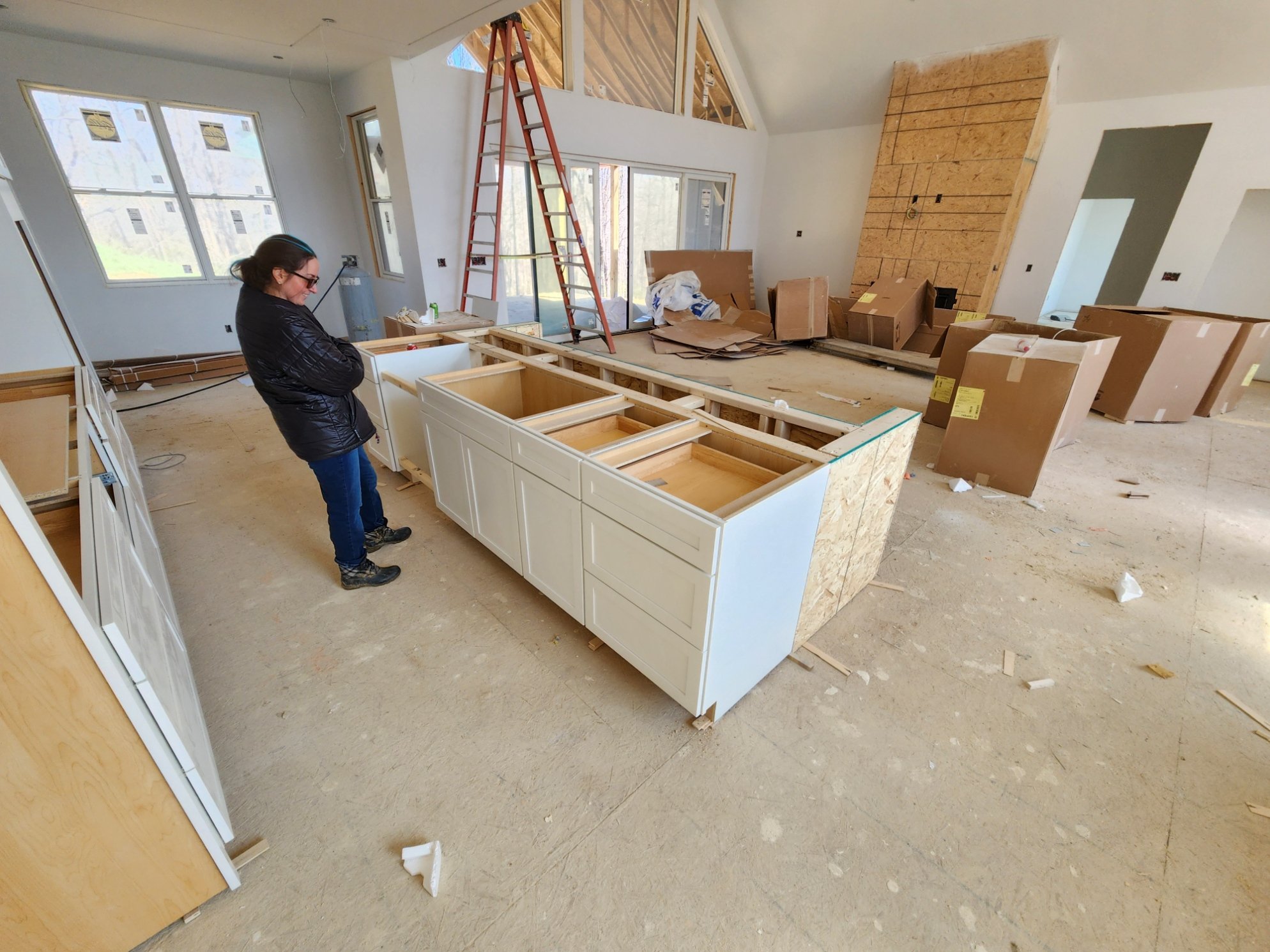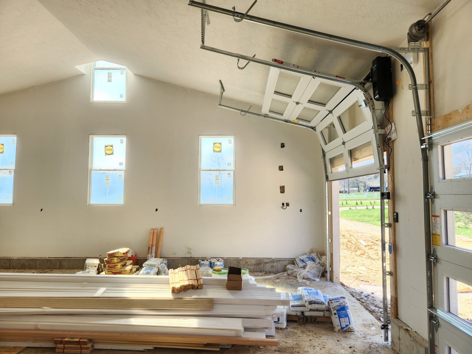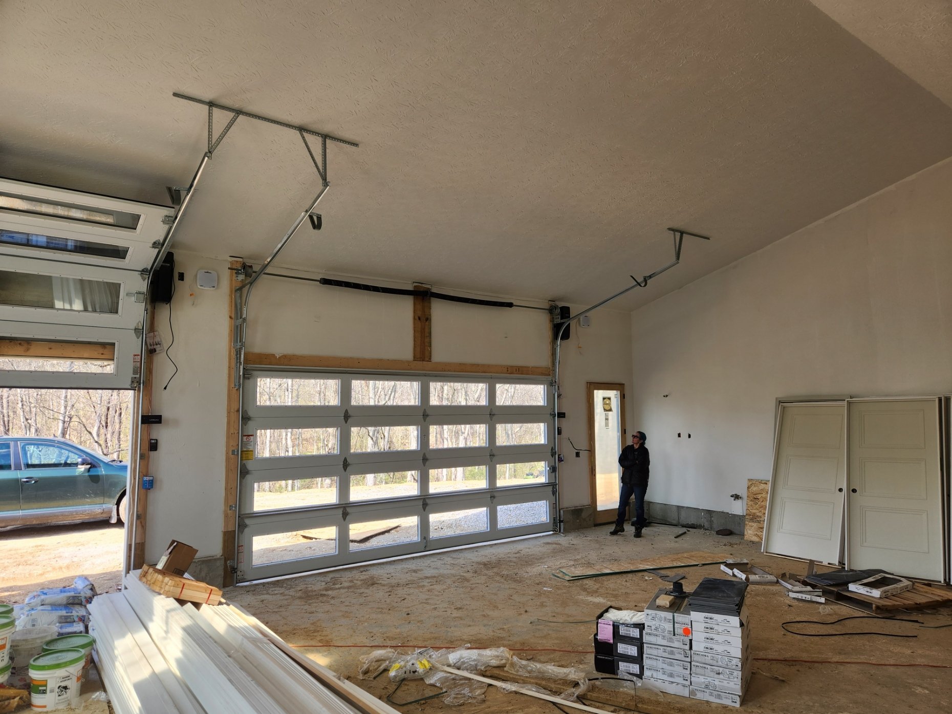 Doors have shown up, cabinnets are getting installed, some painting is happening. Finnaly got my garage doors installed on jackshafts. garage doors are 16x8 and 9x8. Have quotes out right now for a 2-post and 4-post car lift. Also trying to source a Acorn platens 5x5' table for the garage.