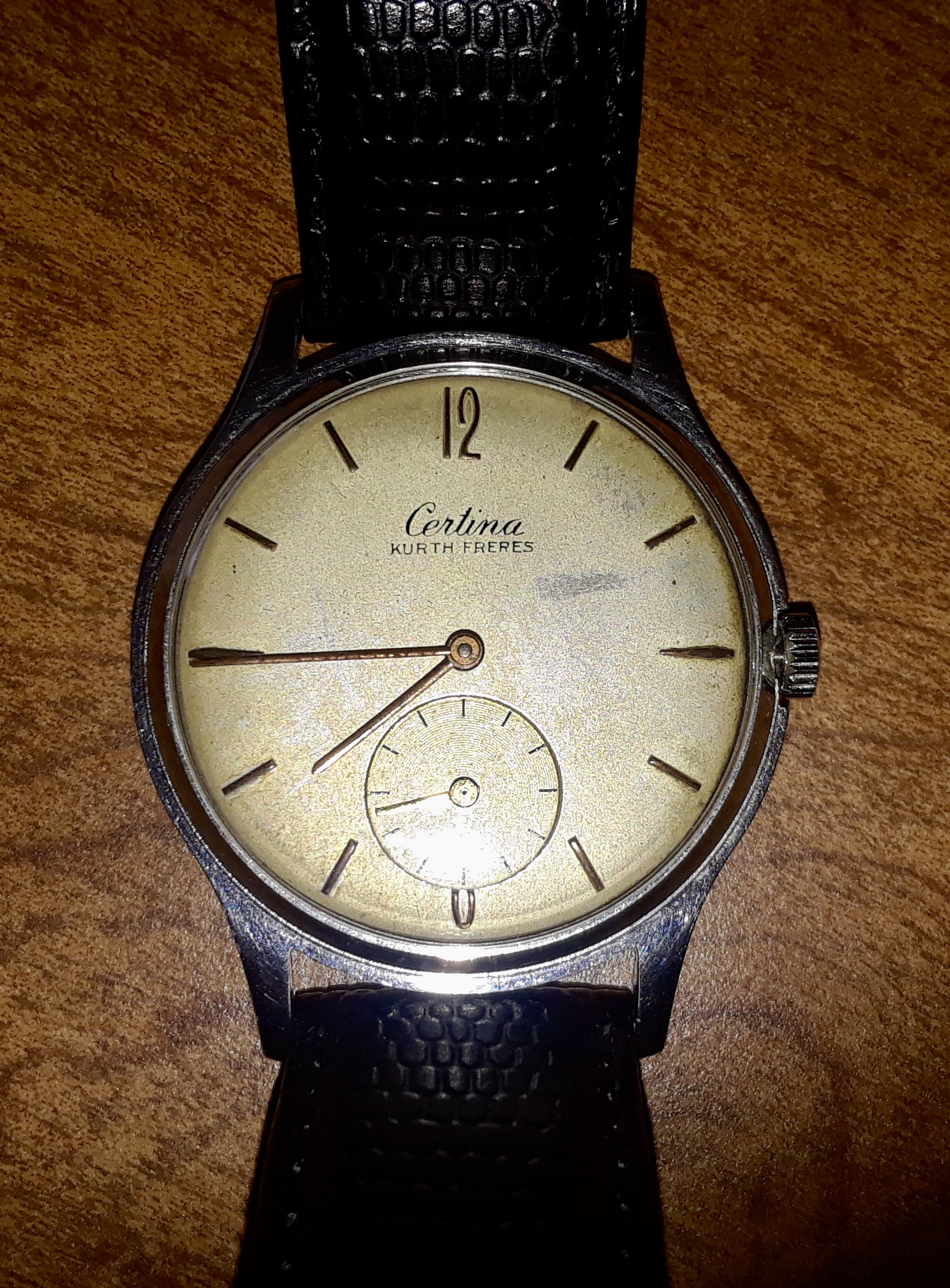My one and only Certina, and interesting dress watch, with many mysteries. I purchased it last year for around $25 at a flea market. It needed pretty extensive work; a new crystal as the old one was cracked, a new stainless steel crown, a routine service, a new second hand, and a new pivot for the center seconds wheel, which somehow had been damaged (maybe it got damaged when someone tried to pull the seconds hand off). Unfortunately, the finish on the dial flaked off a bit with cleaning, but the text is still intact. It was a fun project for me and my watchmaker, and I had only put around $200 in it when all was said and done. Personally, I was very pleased with how it turned out. Originally, I bought it because I liked the case design. It is super thin, even for a dress watch, and the diameter is quite large for a vintage watch, around 37-38mm. I don't know much about Certina or this watch, but I did know that Certina was a quality, mid-tier watch company that made its own movements. I'm assuming it's from the 1950s or early 60s, and it features a manual wind 17 jewel, in-house cal. 321 movement. It's odd because I haven't seen another cal. 321 with 17 jewels. All the others seem to have 16 jewels. Perhaps someone can shed some light on that.
