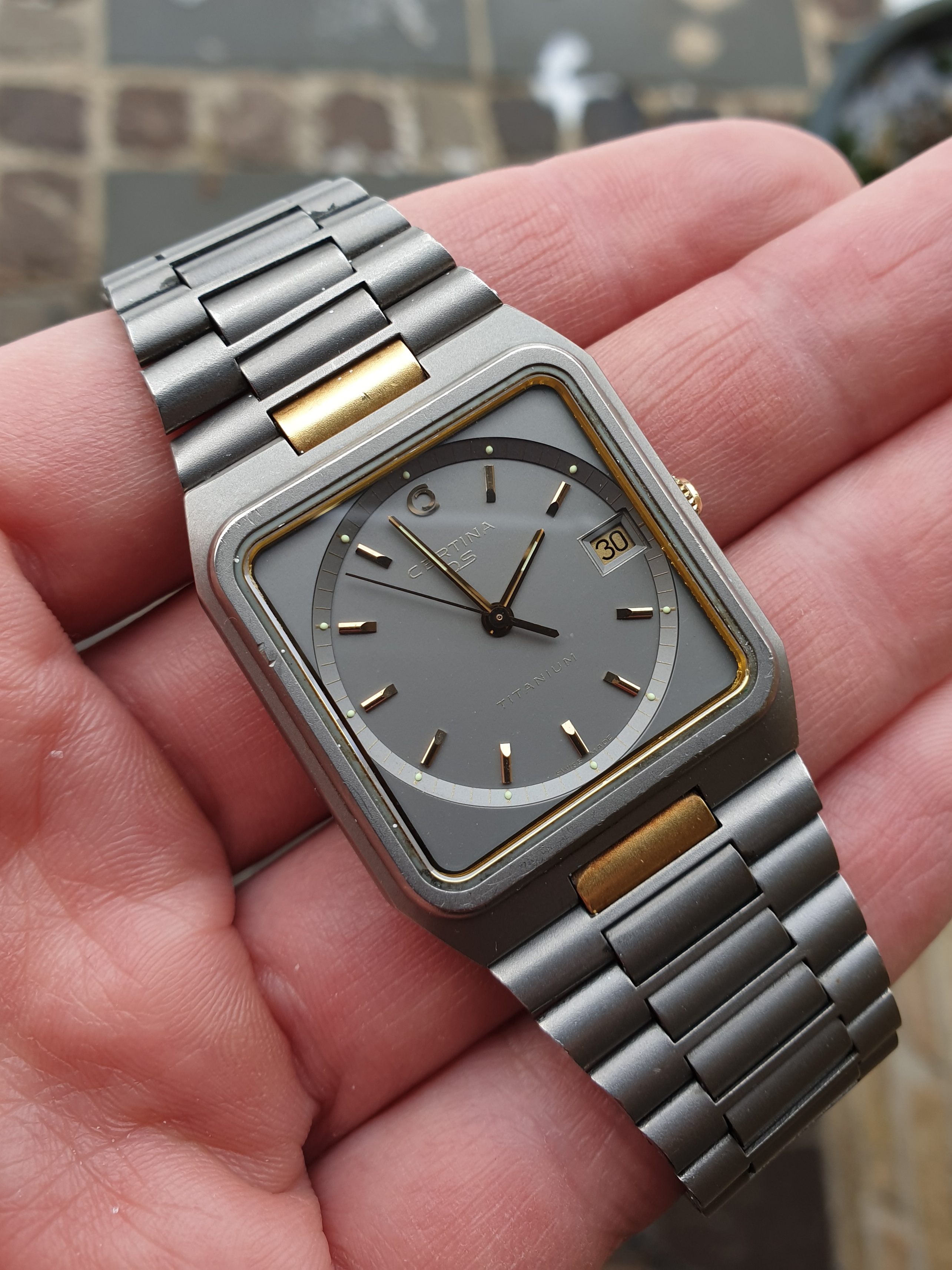 The Certronic was a $35 gamble that turned out to need only a fresh battery and it is now humming away on my wrist. The DS Titanium was a surprise succes as it too was pretty inexpensive and is actually a fairly accomplished watch. Titanium case and integrated bracelet with gold details in great condition, accurate and carefree quartz movement topped with a sapphire crystal. Slim on the wrist and troublefree - really taken with this one.