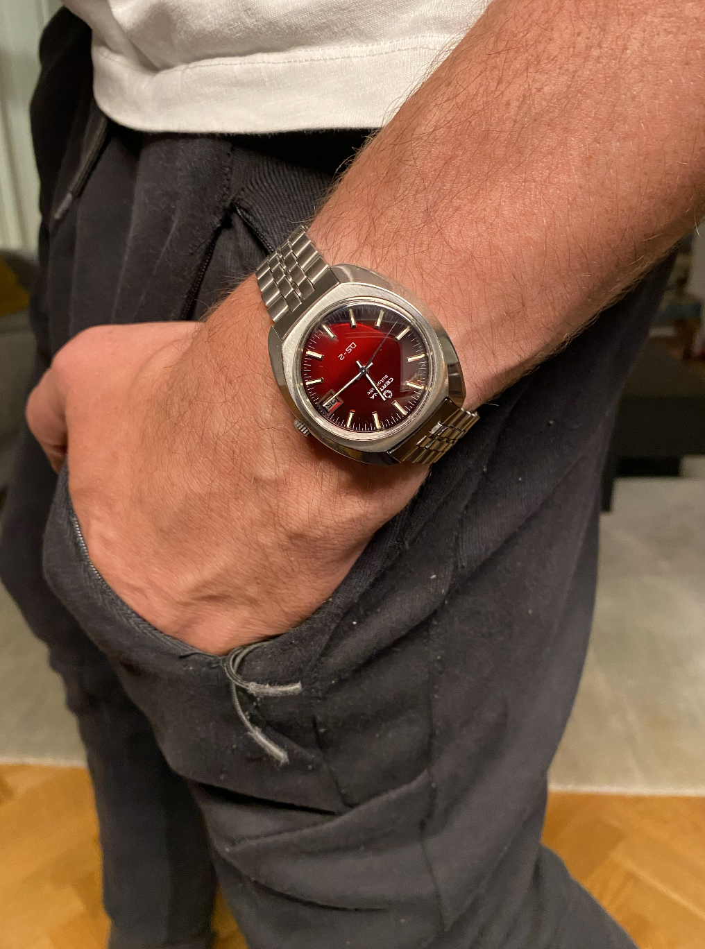 ··Sunburst dial fanYou can bend the end links a little tighter so that there's no gap between the case and the strap.