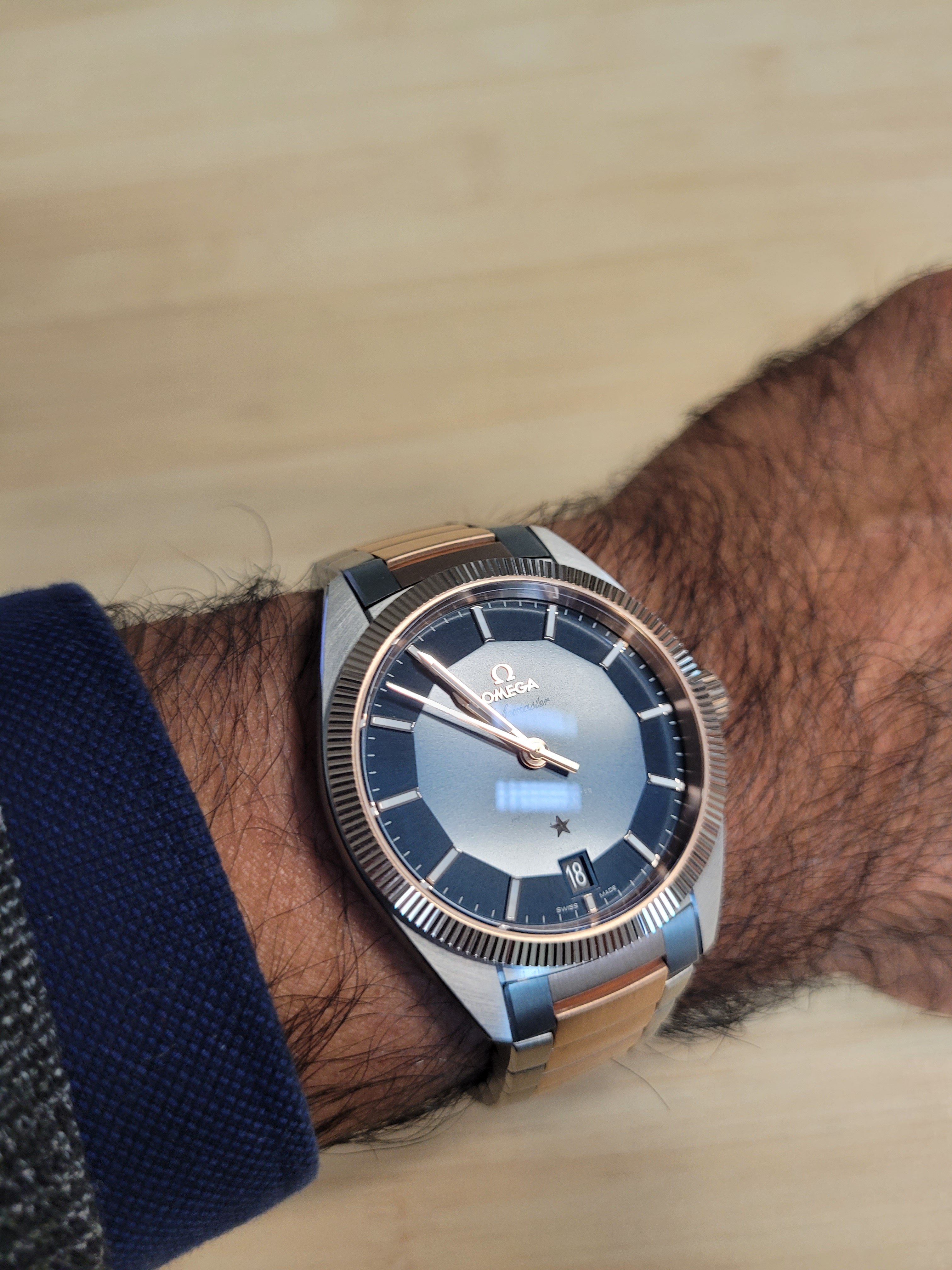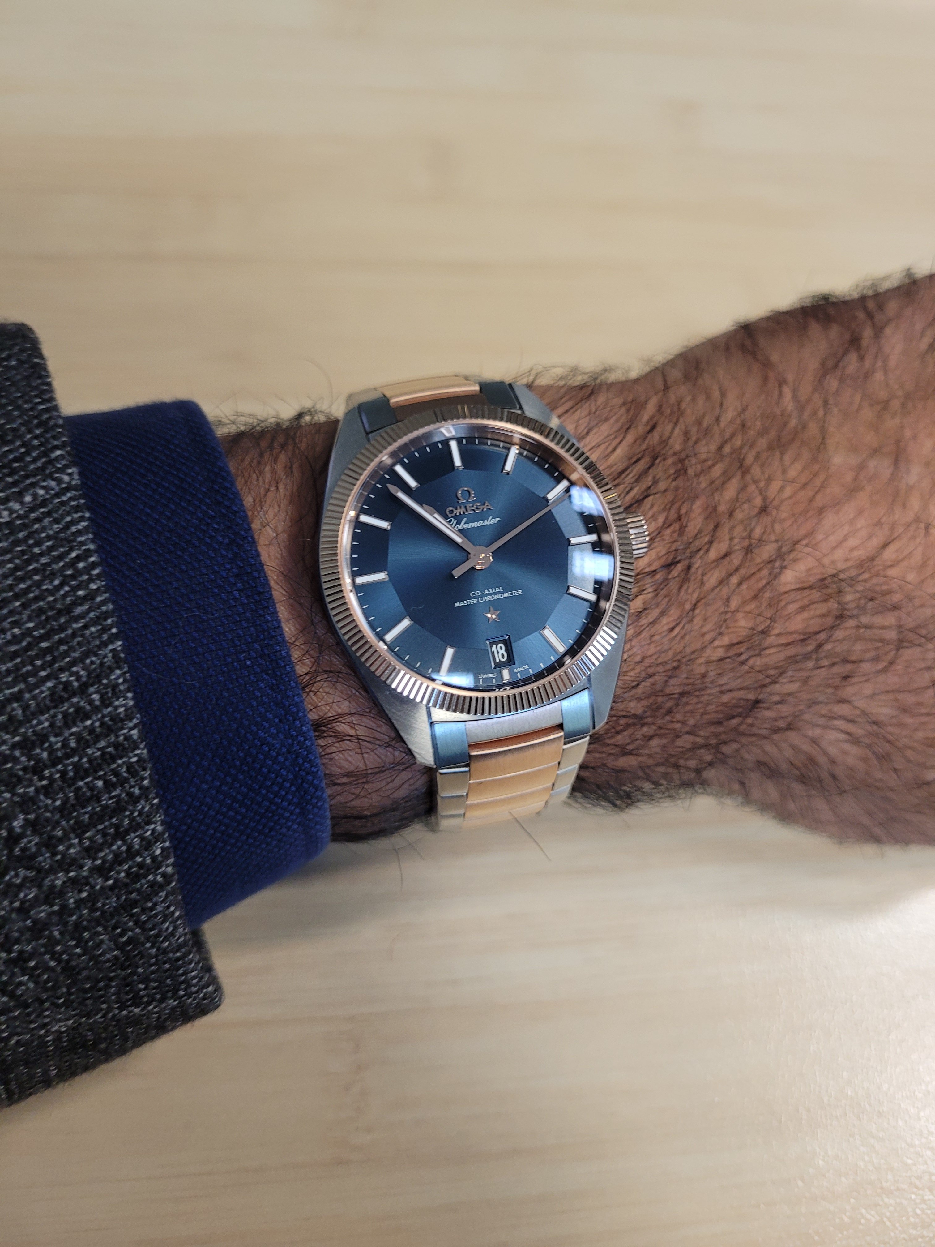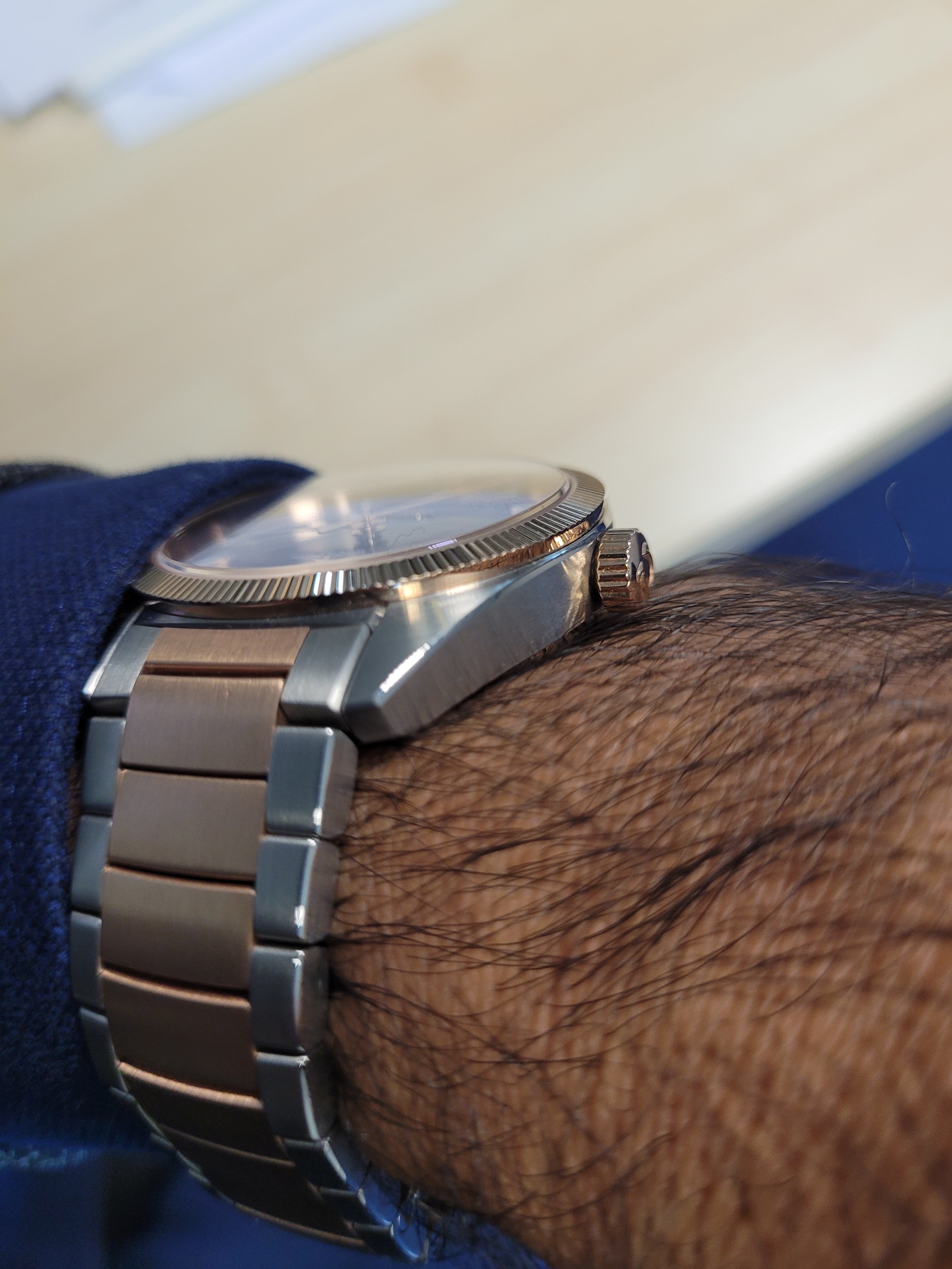 @gbesq Its true that it isn't one of Omega's best bracelet executions. I would have liked to see better finishing in the areas between the individual links and the addition of a micro adjustment clasp. However, I do like the design. Its substantial and balances the weight of the watch (especially with the gold center links). I also like that the center links are large and slightly curved to follow the case shape. The shape of the links is quite well thought out ergonomically (they are trapezoid shaped being smaller at the bottom allowing them to flex around the wrist with tighter tolerances on the top). All the links are independent and I prefer it to Oyster bracelets (which I also own). Its a clean design and I find it comfortable to wear.