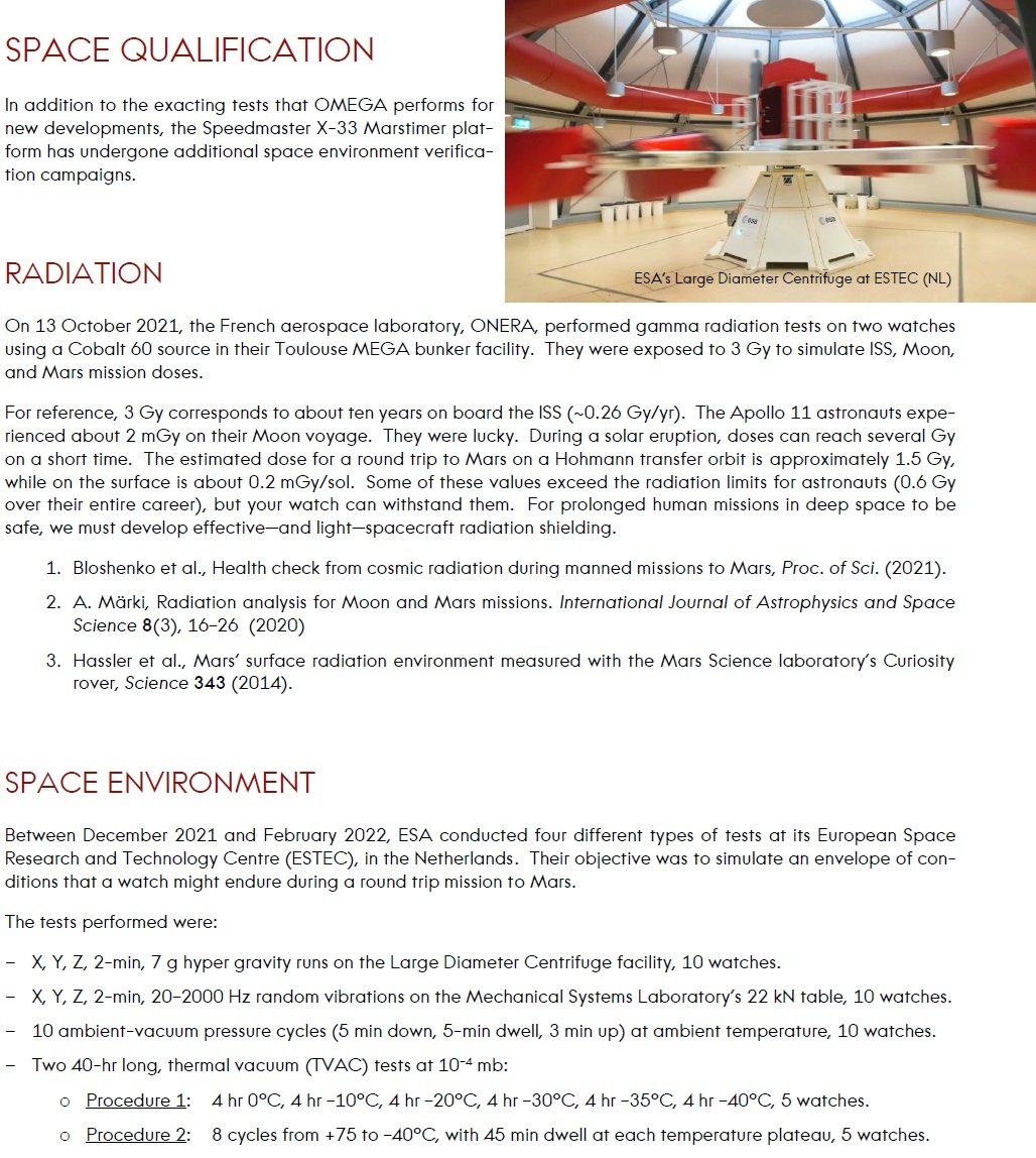 While we may acknowledge that the horological world may advance at a glacial pace, contrary to the nth iteration of the SMP, space exploration didn't simply stop in 1969. The X-33 is today's SMP in that all current American/European astronauts are issued the watch prior to a launch. This family of instruments are what is currently on the wrists of men and women that are currently overhead, traveling at over 28,000 km/h, pushing the envelope that Neil and Buzz so captivated the world with over half a century ago. More specifically, the Marstimer was purpose built as an instrument to enable space professionals to (remotely) explore a even further world. In this generation, that new world happens to one, possess a different day cycle than earth, and two, has no magnetic field to provide a directional bearing. The former is important because every one of our remote explorers rely on the sun, whether it's power or electro-optical sensors to monitor and collect pictures. And with your sun-rise/set times changing every day, keeping track with 24-hr watches becomes a daily chore. With the latter, it's my opinion that the inclusion is because timing and direction enable one of the first principles of exploration; dead reckoning. It's in this spirit, I think, that Omega used the equation of time to calculate true North based solely on the sun, and your lat/long. If that's not enough to convince you of the bona fides of this watch, check out the flight qualifications on pg49 at the end of the extended manual.