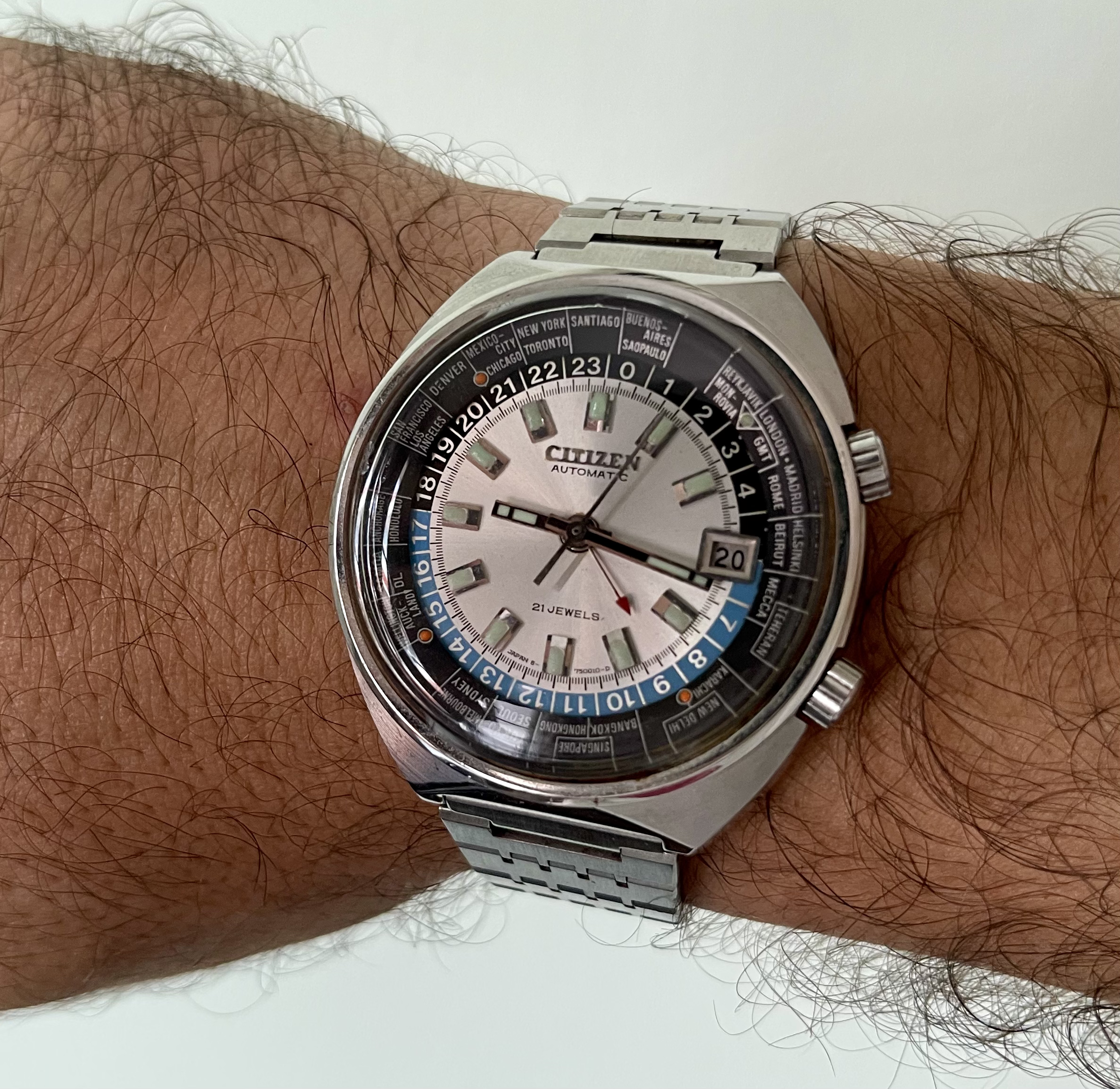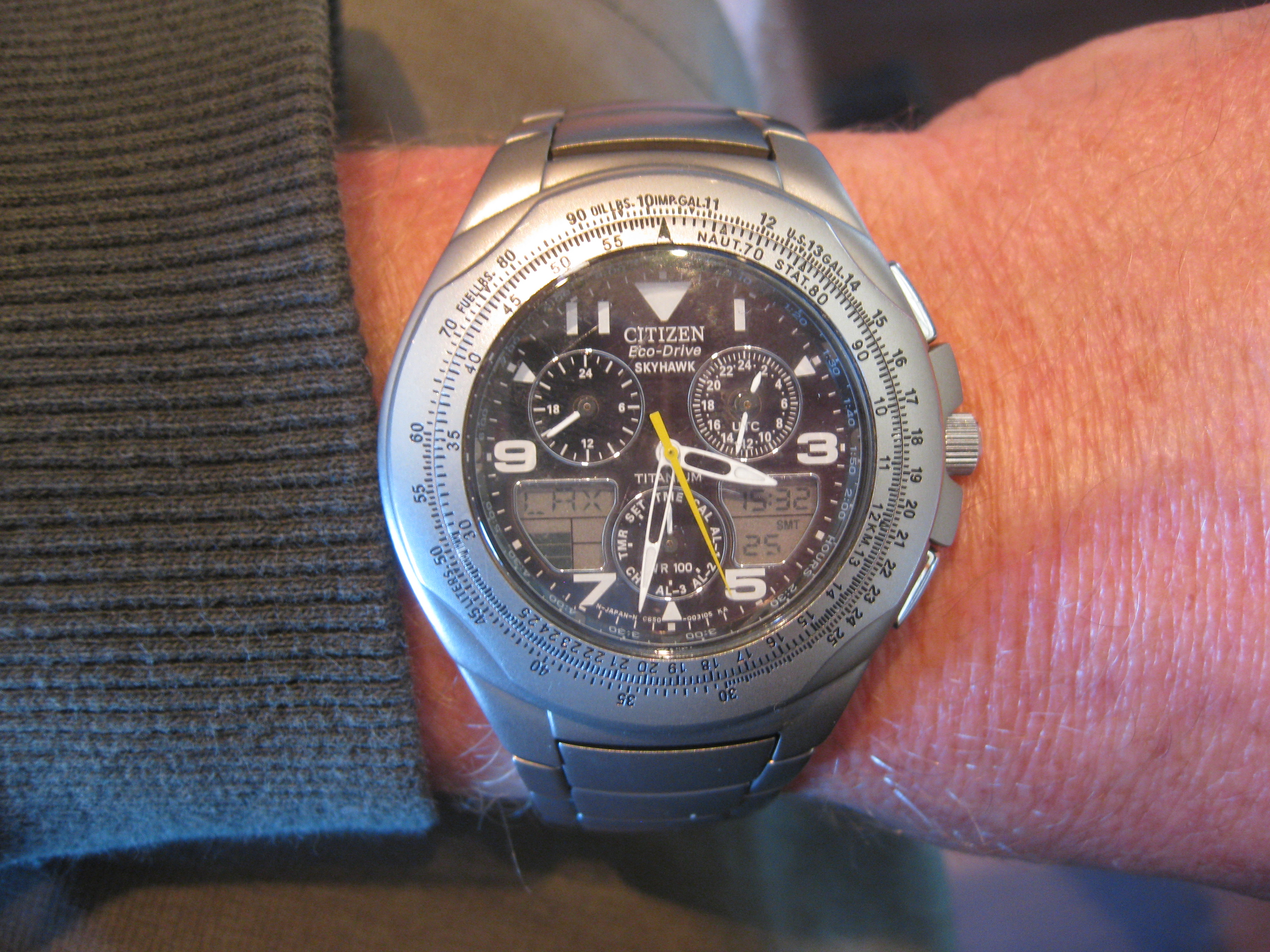 Years later in 2003 my job as a mechanical design engineer in the medical device industry put me on the search for a swiss screw machine that would meet my needs for the design & manufacture of dental instruments. One of the screw machine companies I evaluated was Marubeni Citizen-Cincom. I was very impressed with the quality and repeatability of their machines. I learned that when the Citizen watch company determined that they were not satisfied with the quality they could get of off the screw machines made in Switzerland, they decided to design and manufacture their own screw machines. I also love their Eco-Drive technology. So I decided to buy a titanium SkyHawk because I really liked the look and the "whiz-wheel" bezel (which at the time I still knew how to use). One unique thing I also thought was really cool about that model is that it only has the odd numbers displayed on the face, and it has all of the odd numbers displayed. That watch still ran within 3 seconds per month accurate when it was 17 years old, until the capacitor finally wore out, which I had replaced earlier this year and it's running again.