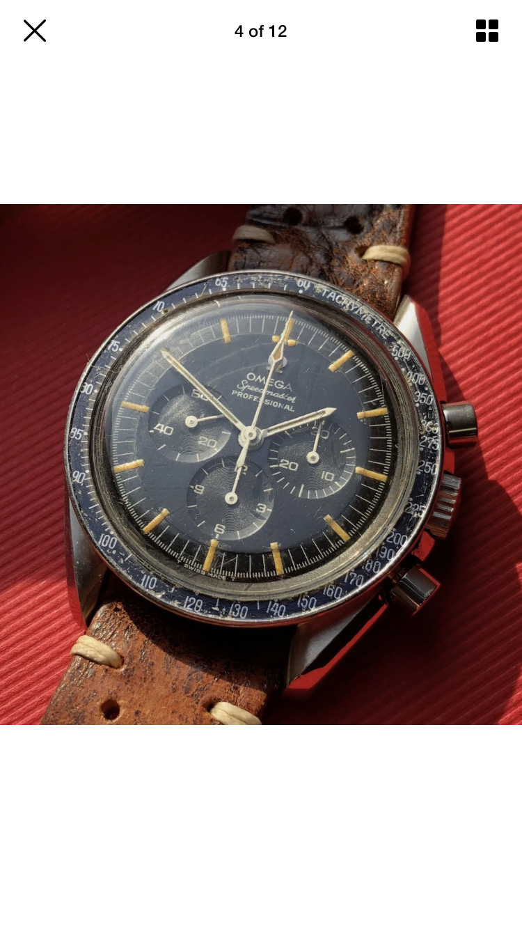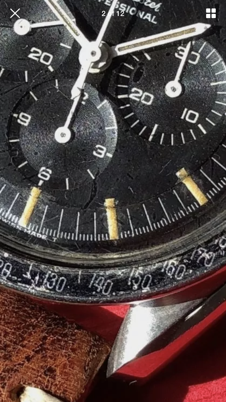 This 145.012-67 is reaching dizzy heights, yet the seller (semi) admits the lume has been redone, the dial has significant scratches around the hour markers, presumably from when the old lume was poorly removed, the crown is wrong and the bezel is average at best.