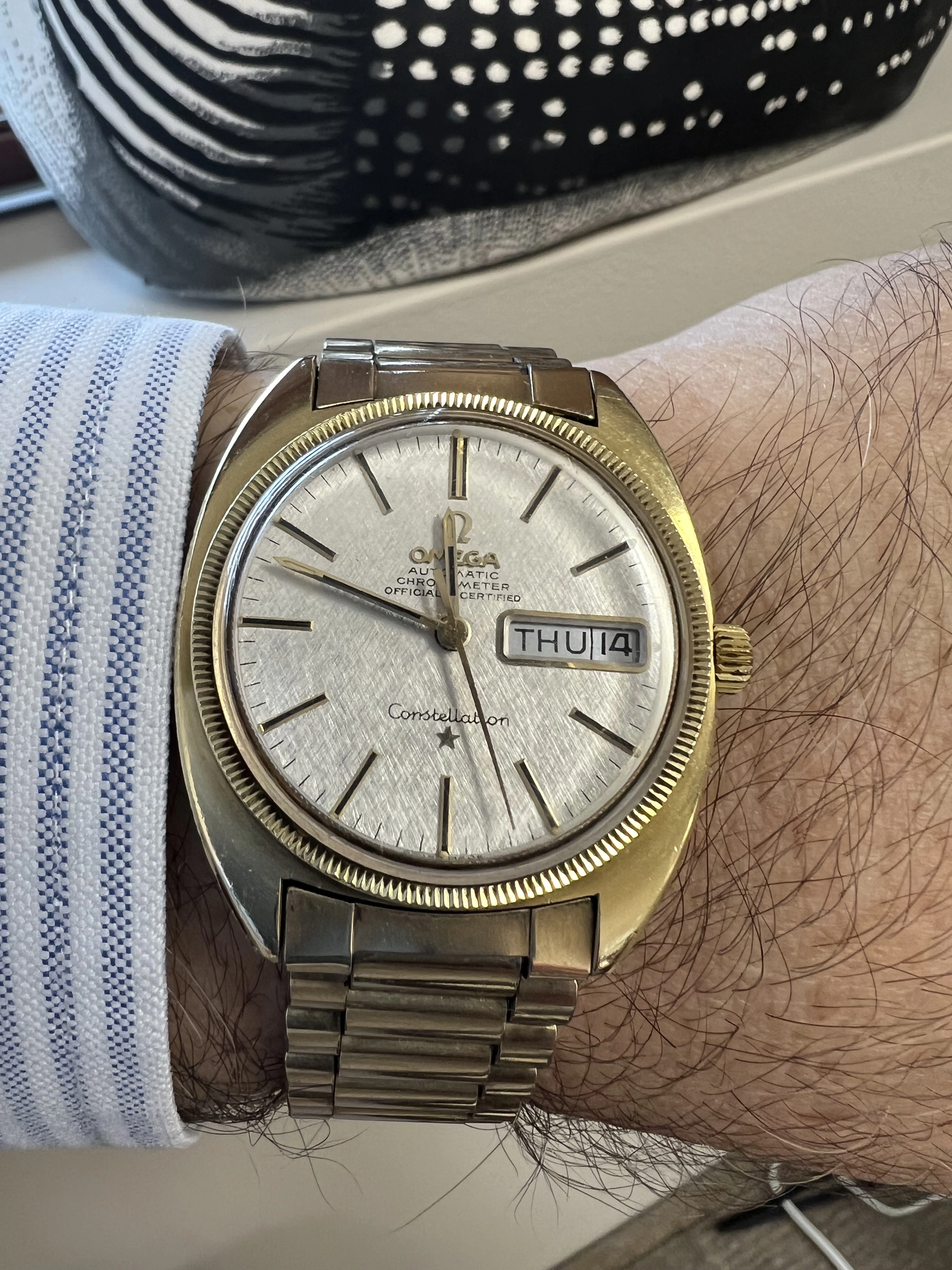 I wanted to ask the community about their thoughts on a good choice for a watch for my wife. I gave her a Rolex Oyster (purchased here) which she loves. 34mm, with an oyster bracelet. She now has mentioned a gold watch, and I have begun the search. Below is a picture of a bumper I gave my daughter, which is similar in style to what I think my wife would like (but gold).