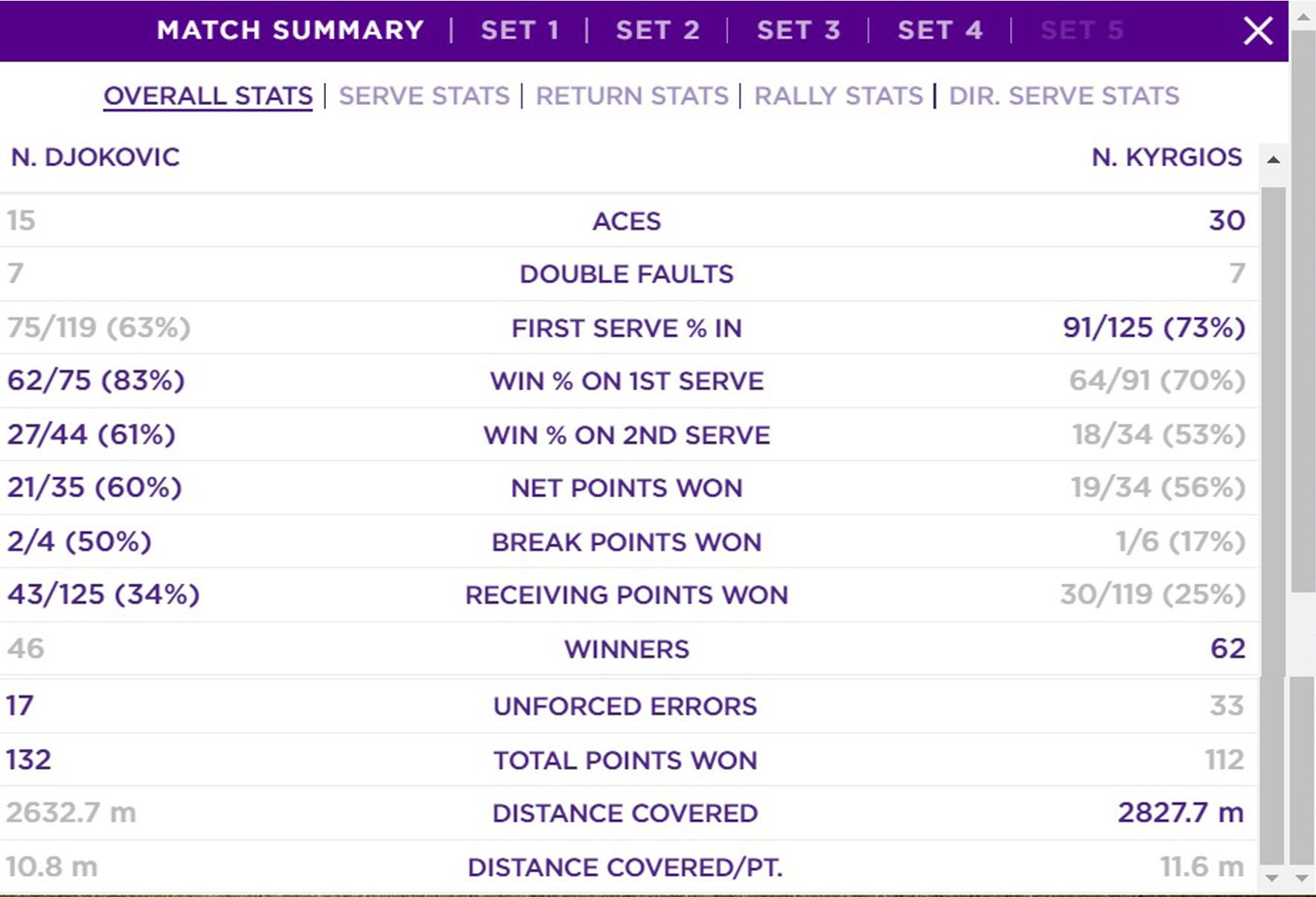 It's easy to get distracted from the tennis when NK plays, but the stats don't really agree that it was terribly one sided. Set 2 was very competitive (NK generated 4 break point chances), and set 3 and 4 were where Nick's unforced error counts really jumped up. Winners outpaced unforced errors for both players in all sets, and overall by very wide margins - that's high quality tennis. There were only 3 breaks of serve in the entire match.
