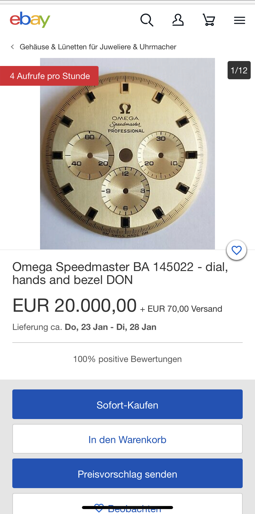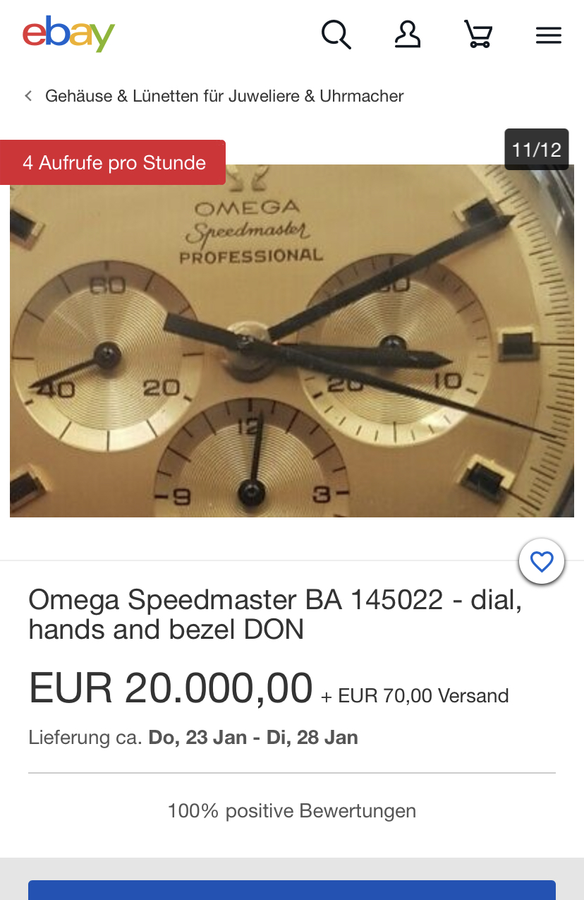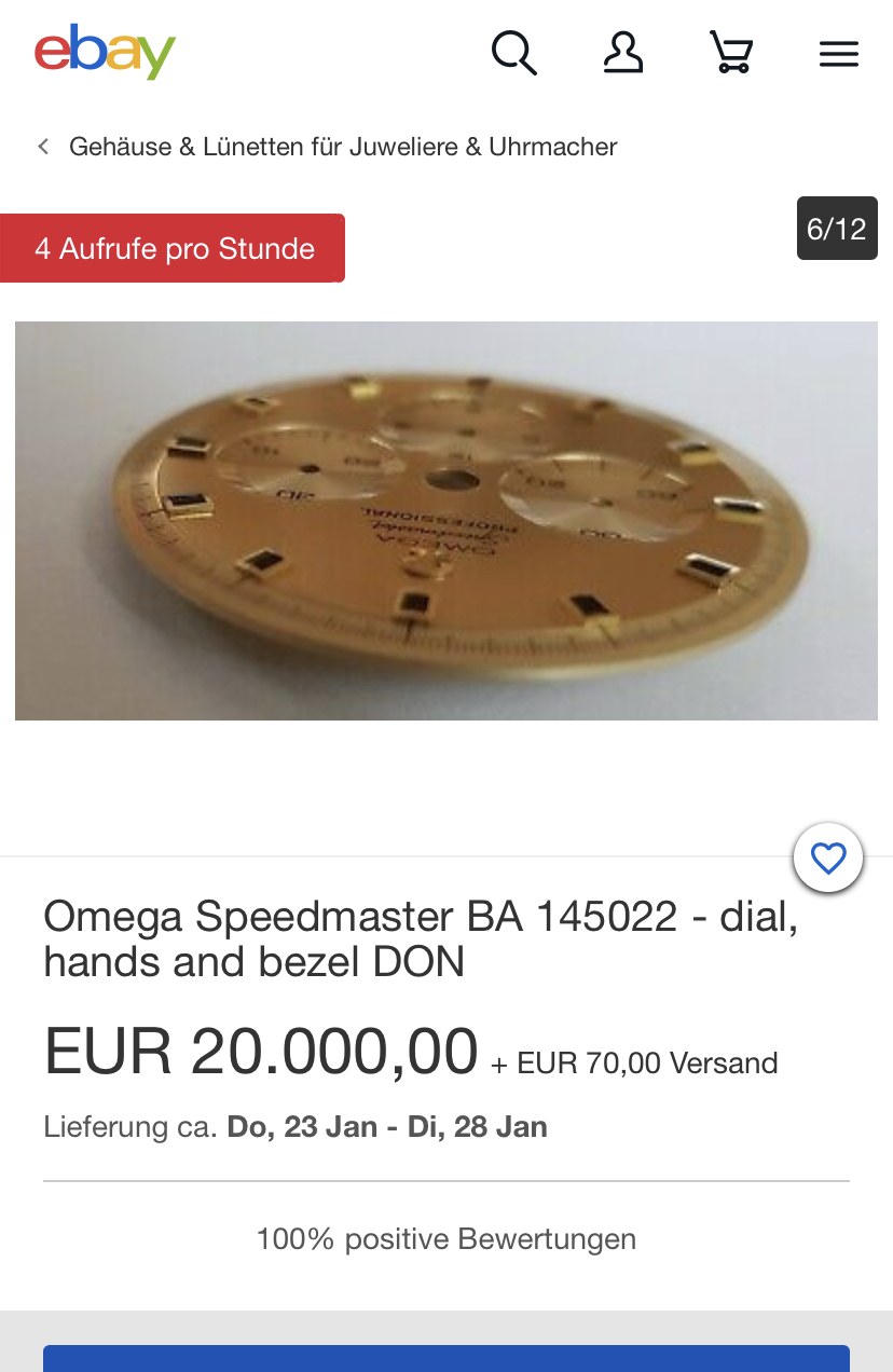 Here's my situation. When I had my watch restored, I had the original movement (caliber 861, reference ST145.022-76, serial number 399266XX) put in a complete new case with new bezel, crystal and dial. I also added a new Omega Speedmaster bracelet, and had the movement serviced. The hands are still original. So, my current Moonwatch looks brand new. I just ran it for two days, and amazingly, it was still accurate within 2 seconds, which is better than you should expect from a mechanical watch, at least a Moonwatch. I still have the original case with bezel and crystal, and the original dial. My original case, crystal and dial are in much better condition than the ones in the Listing I showed above. They case has scratches, but everything was cleaned and the crystal was polished by the person servicing my watch. Unfortunately, I can't find the original watch boxes, owner's manual, and the original bracelet. I know I didn't throw them away. I've made an initial search of my house, looking in the usual places, without success. They may well be in a box up in my attic or in a storage space under a staircase, which is blocked by a wall unit. So, that's my situation. I can list my restored Moonwatch for sale without the boxes and owner's manual and original bracelet and offer to include the original parts I do have, or I could sell the original parts separately, or I could just forget about it and keep my watch, which is currently more accurate than a new Omega Seamaster watch I purchased and a new Bremont Boeing F-15 watch I purchased. Can anyone please give me their advice/suggestions? I'd also like to know your views on the best way to sell a vintage watch, if you could. Any assistance will be greatly appreciated. If this is the wrong place to post this message, I sure apologize. Regards, Marc