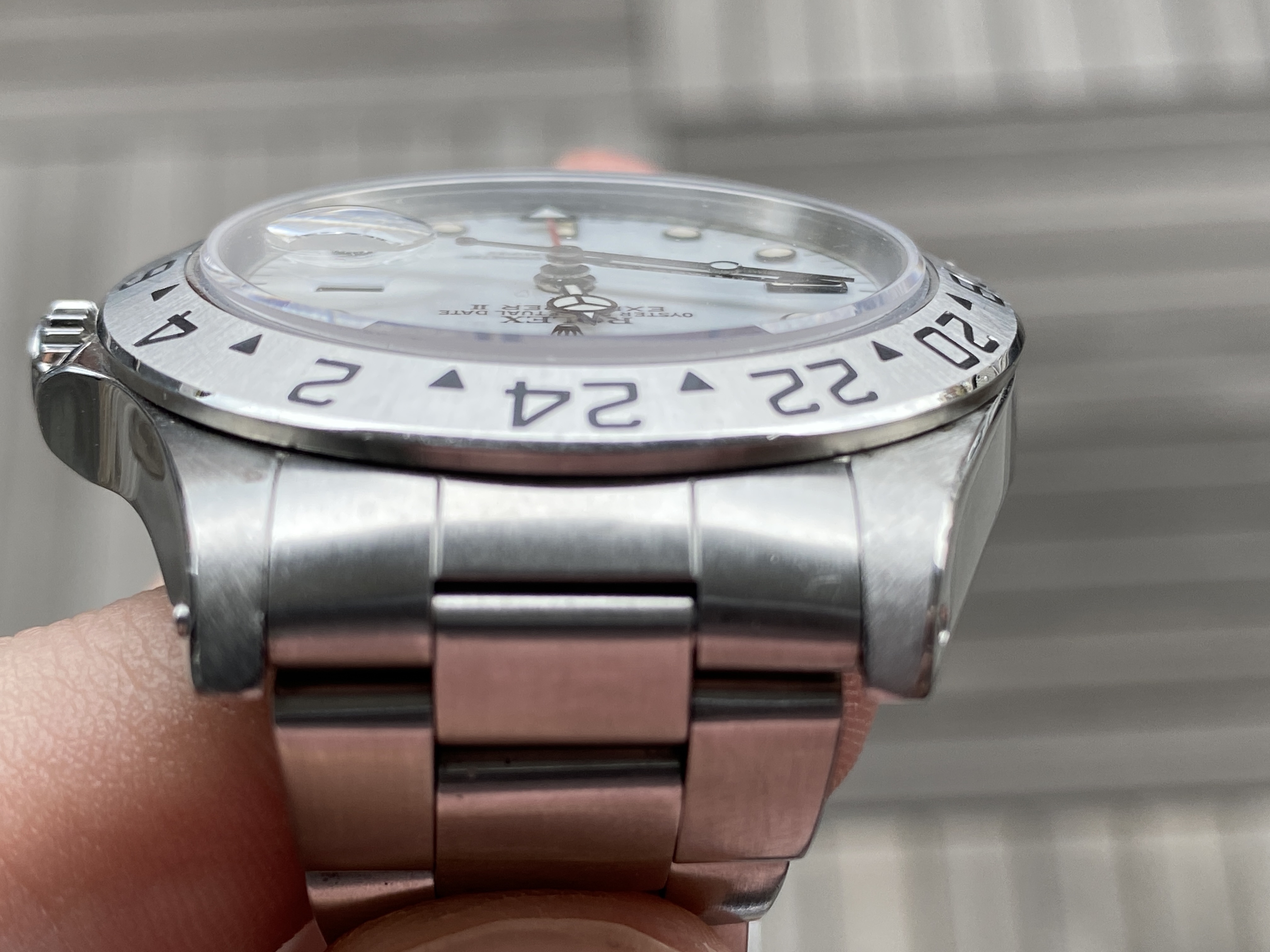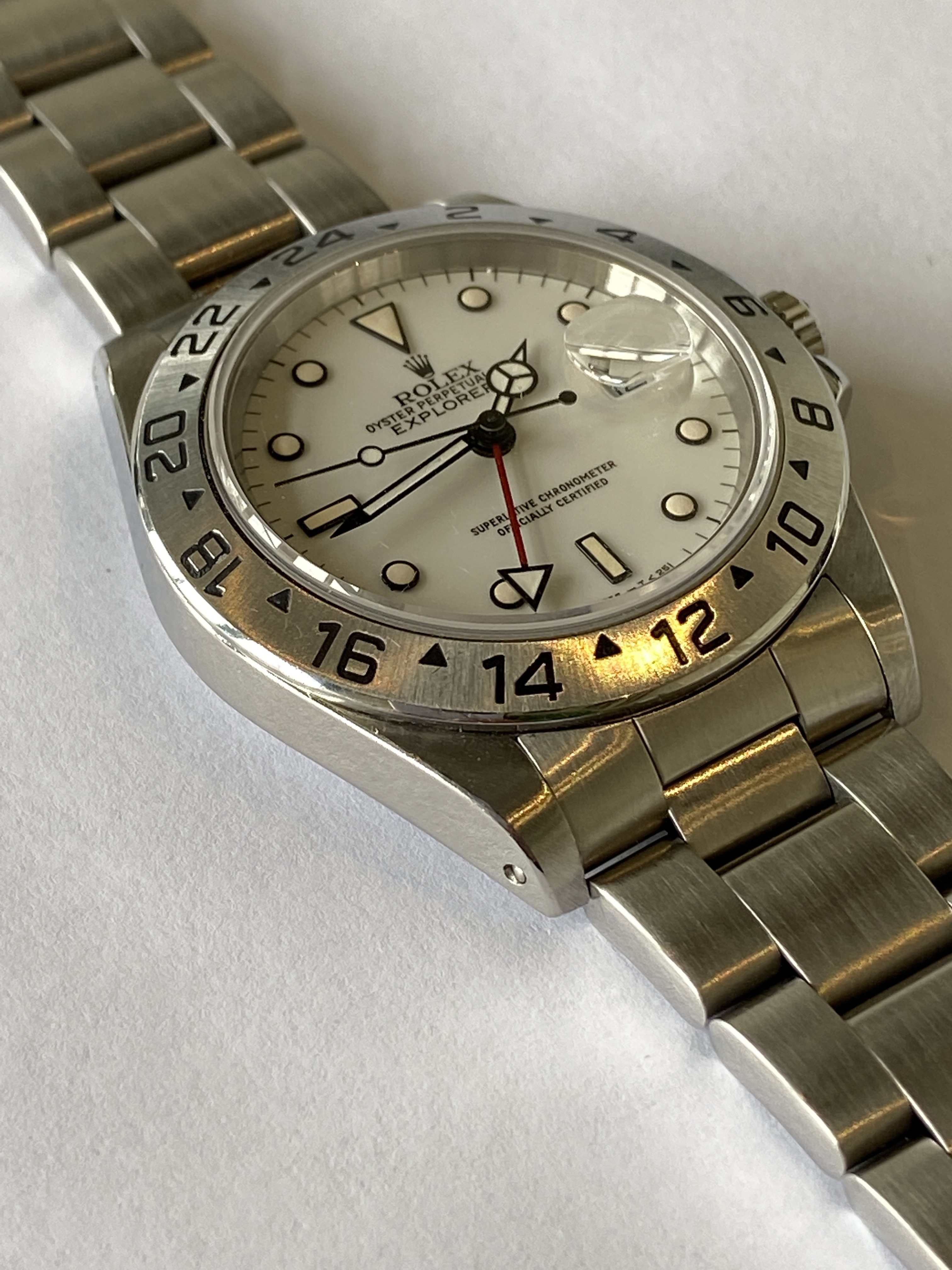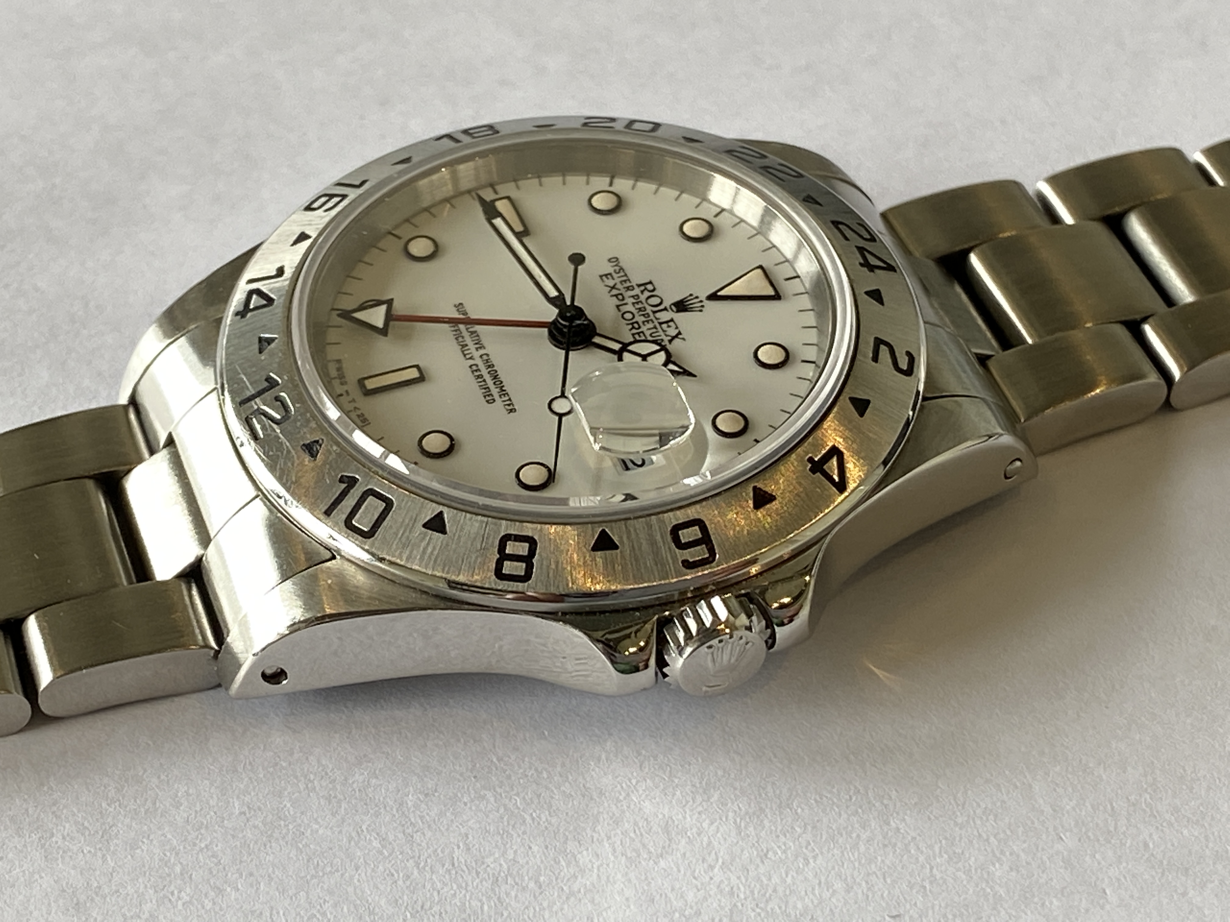 The dial is the earlier version of the Explorer II with the porcelain effect and beautiful eggshell patina.