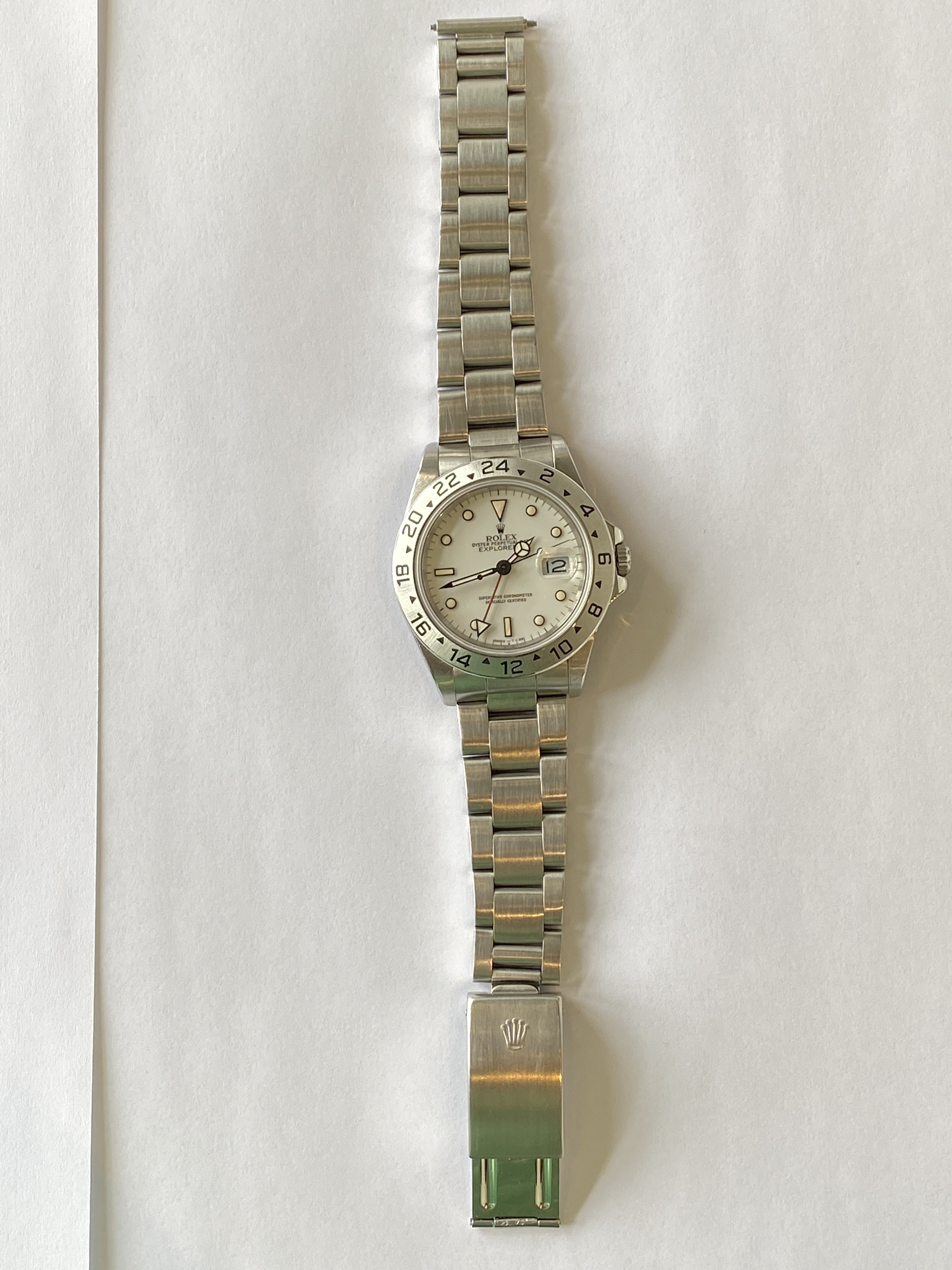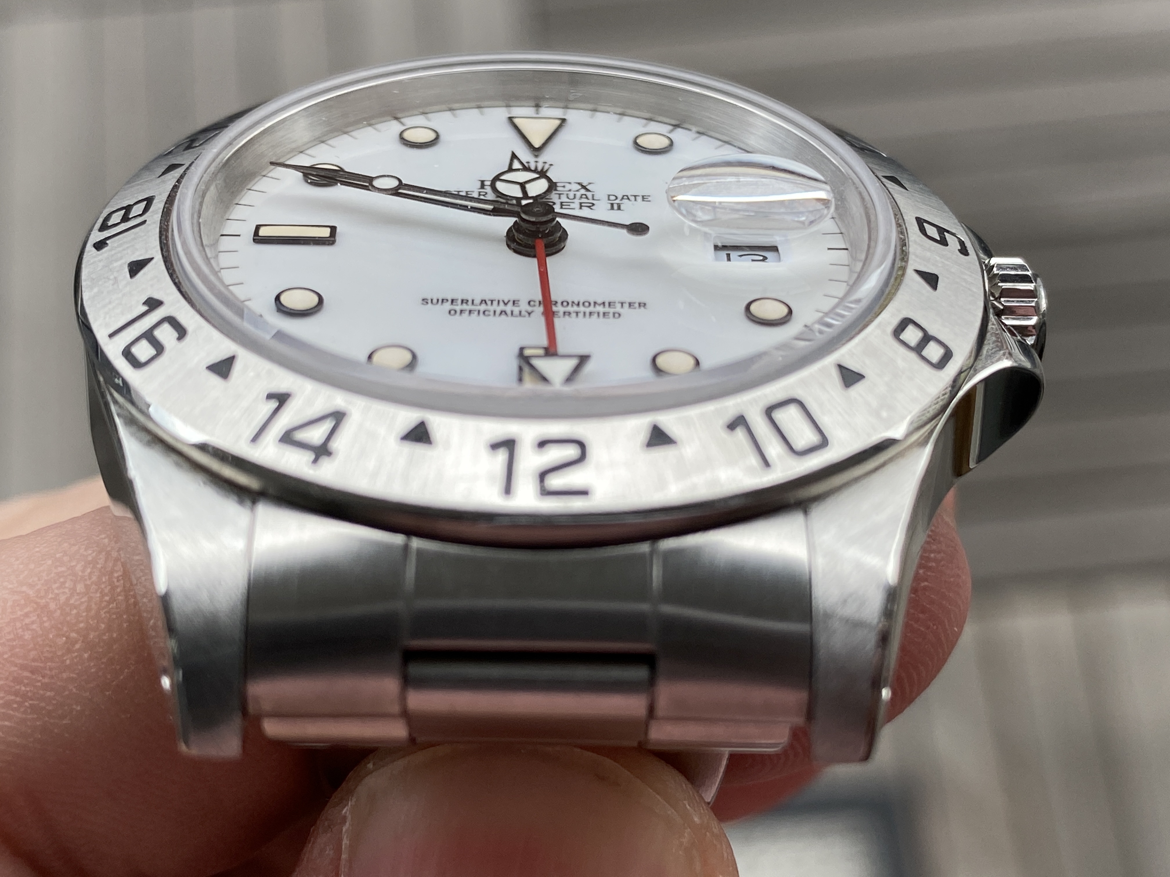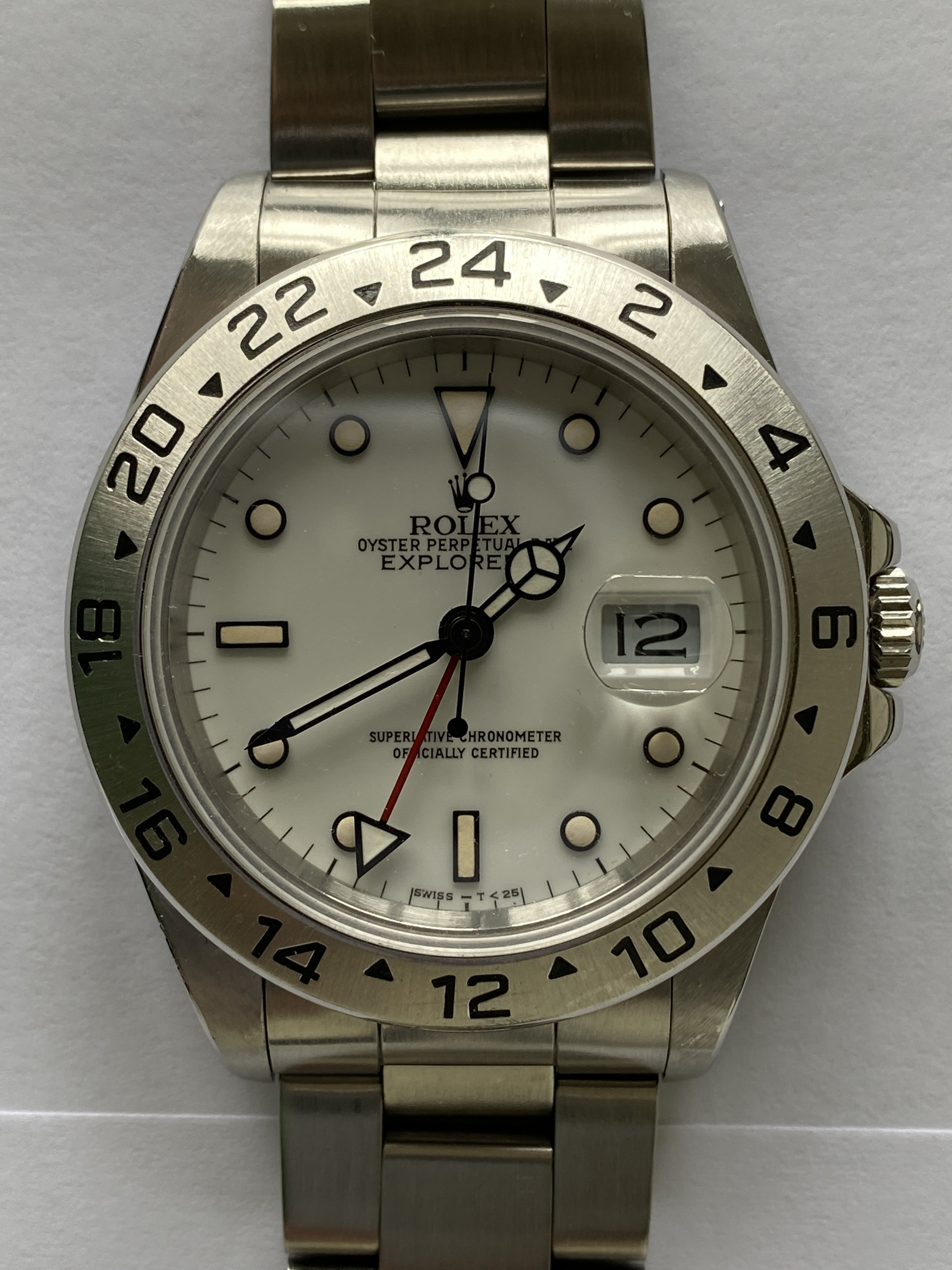 The dial is the earlier version of the Explorer II with the porcelain effect and beautiful eggshell patina.