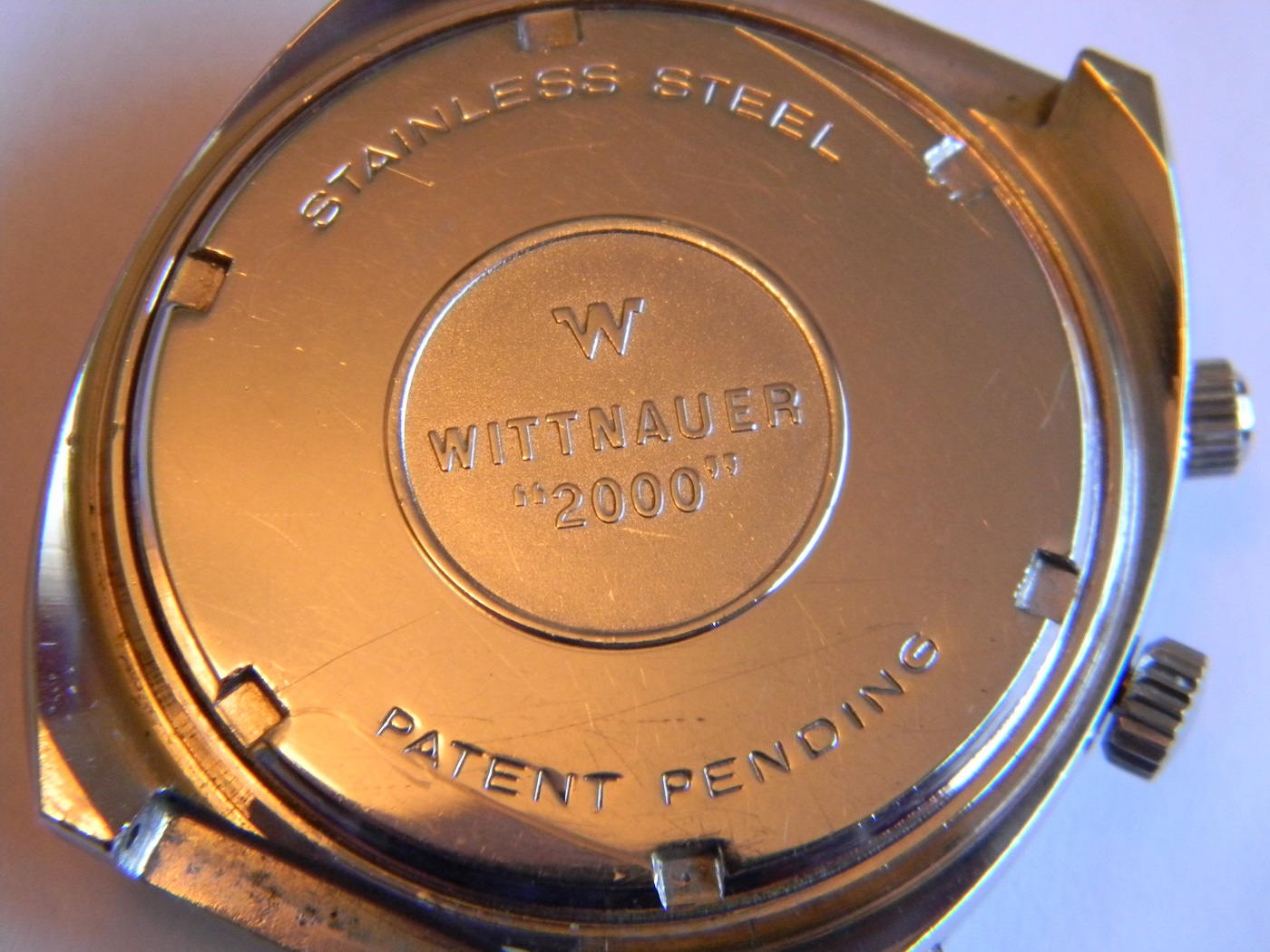 First generation model with Patent Pending case back and movement number at the 6 o'clock