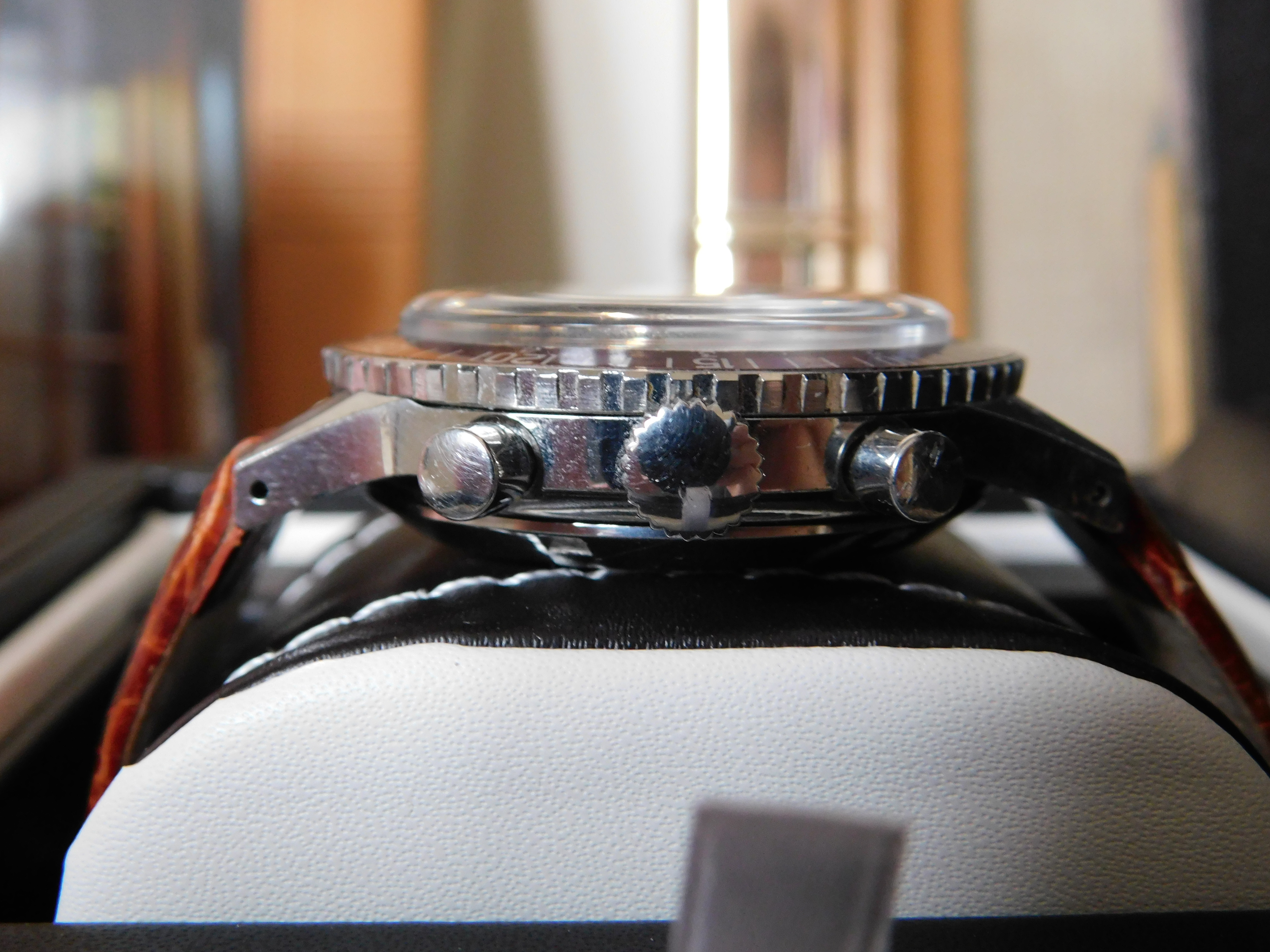 ·Another sacrifice to cover two new acquisitions. On offer is an iconic Wittnauer 7004a Professional, one of the quintessential sports chronographs of the late 1960s and early 1970s. The deep black dial is complemented by arrow batons with a broad-arrow minute hand, indicating this piece is the second iteration. Minute subdial has regatta countdown. The big burgundy bezel that has made this watch so desirable is bright and sharp. No dings or visible wear to outer edge.