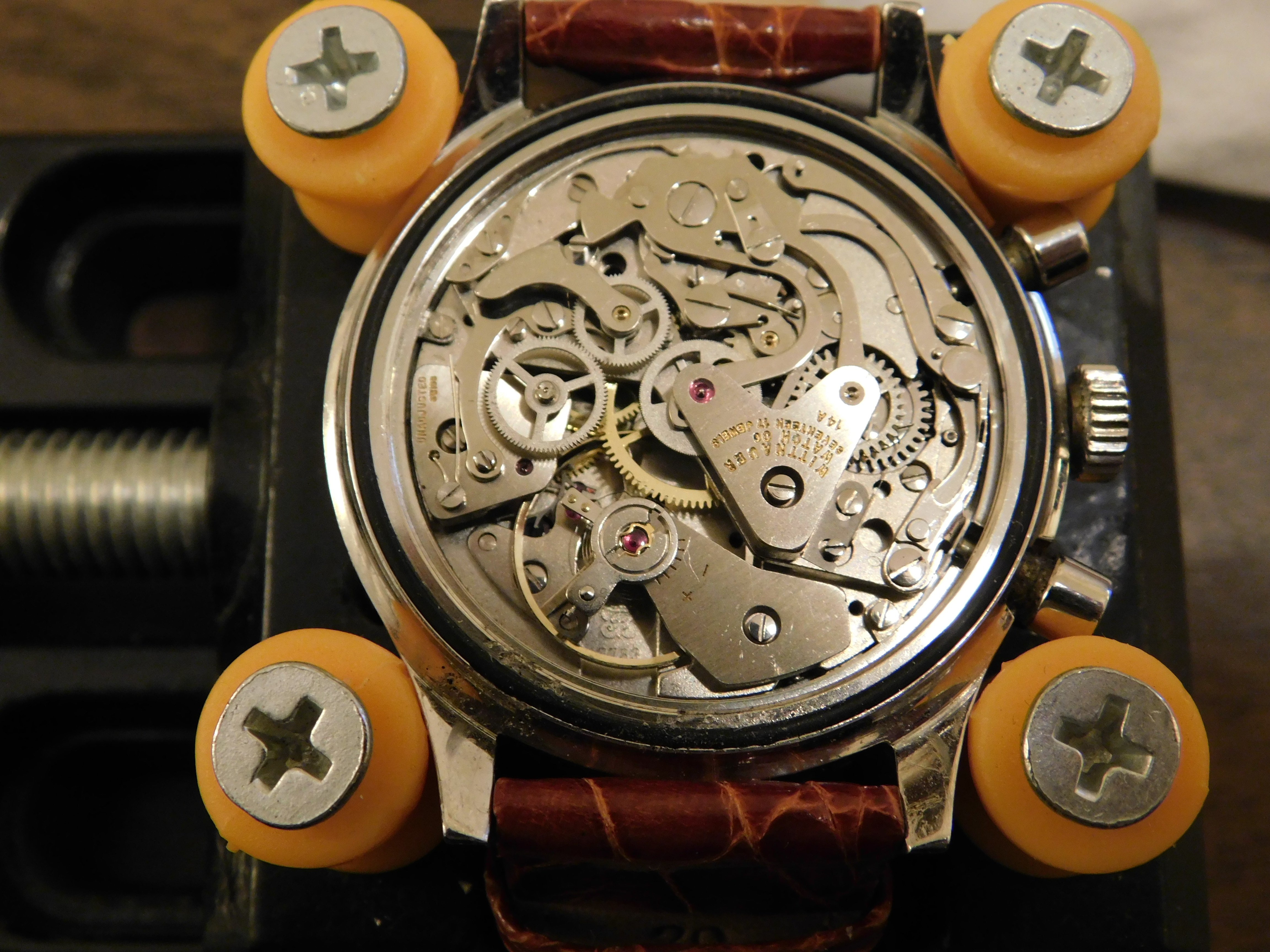 Movement: workhorse Valjoux 7733. Running strong and keeping good time. All chronograph functions work perfectly and reset exactly to zero.