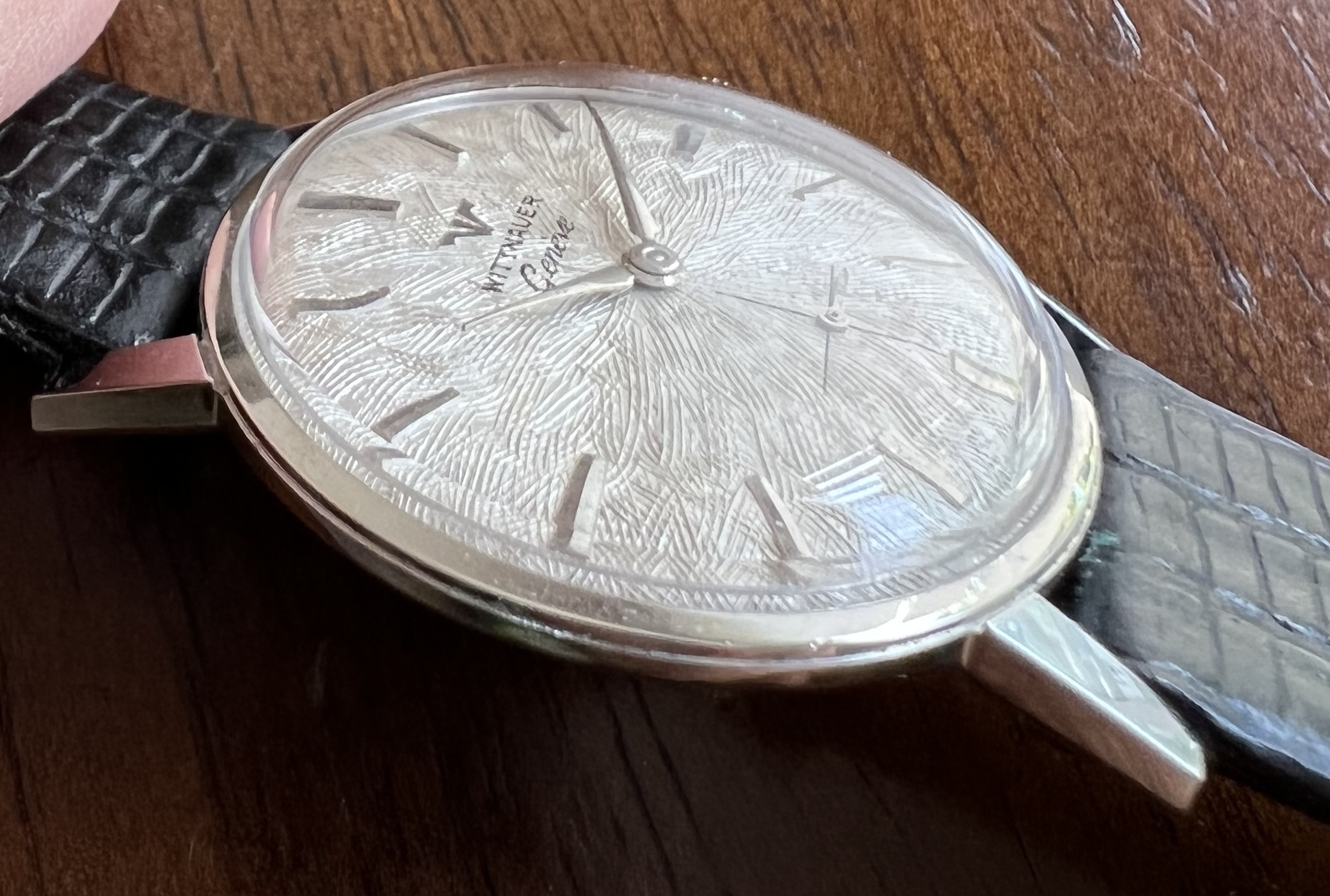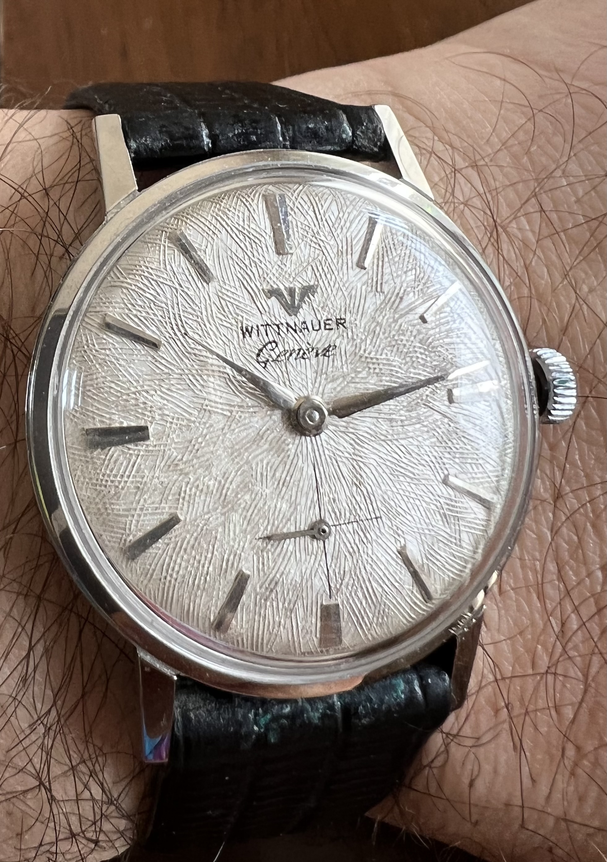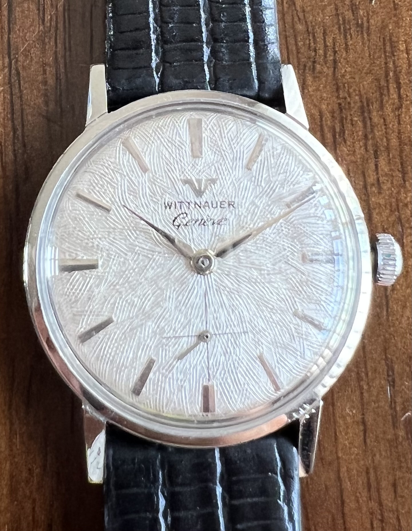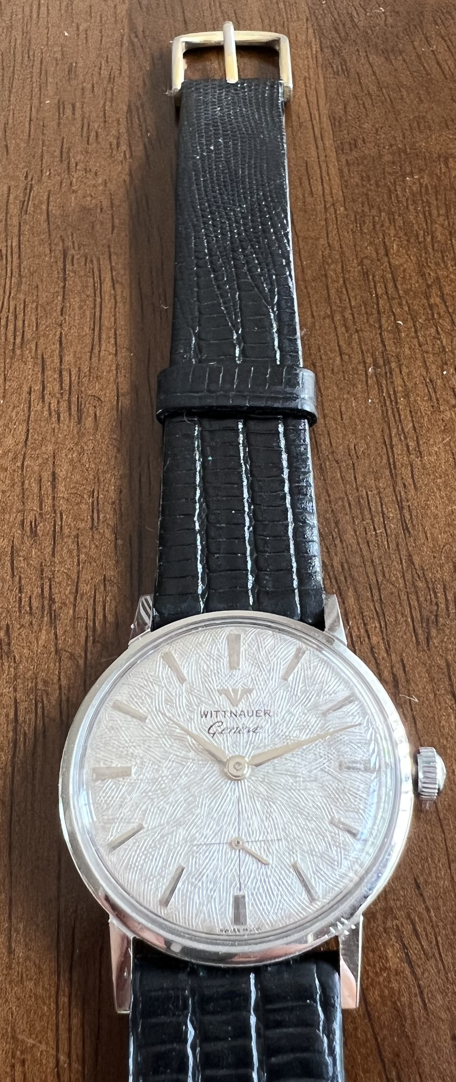 ·Selling an attractive manual wind Wittnauer dress watch with an unusual guilloche patterned dial. Stainless steel cased front loader approximately 33 mm in diameter excluding crown though wears larger. Service history is unknown but watch operates flawlessly. I am unsure if crown is original. On a Speidel lizard strap with plenty of life left though note the buckle is gold toned. $250 net to me with free USPS shipping within CONUS. International buyers to discuss shipping.