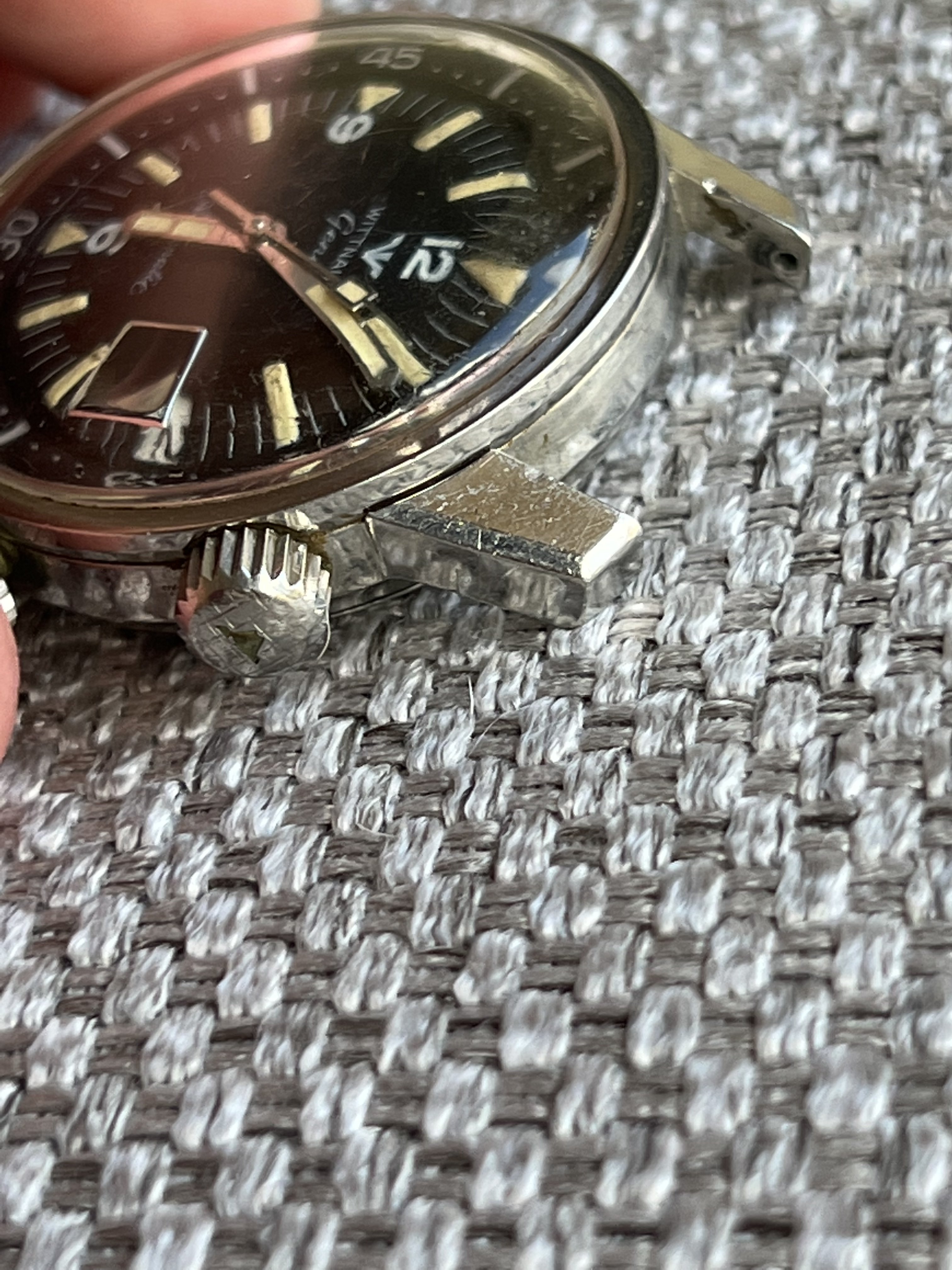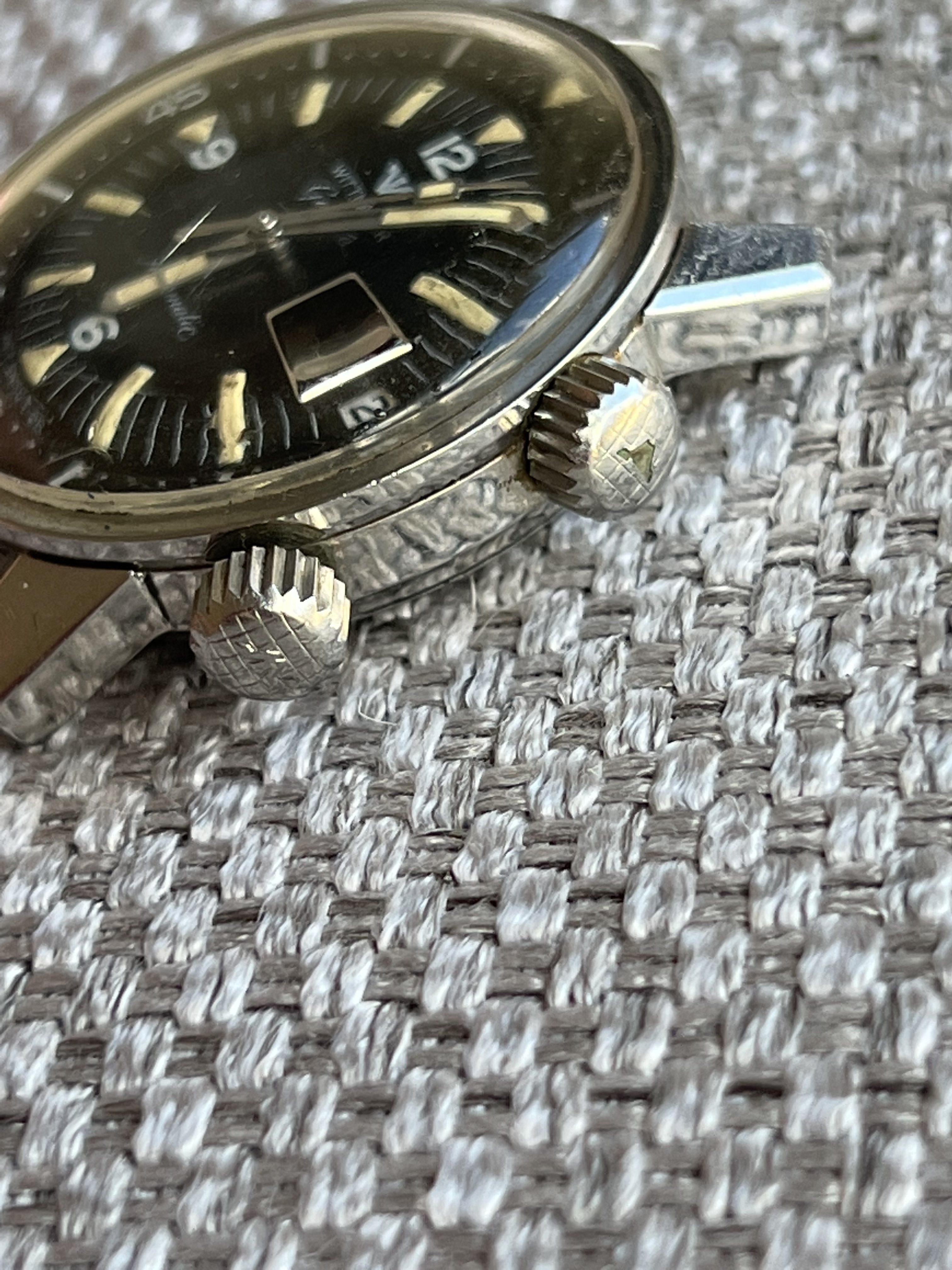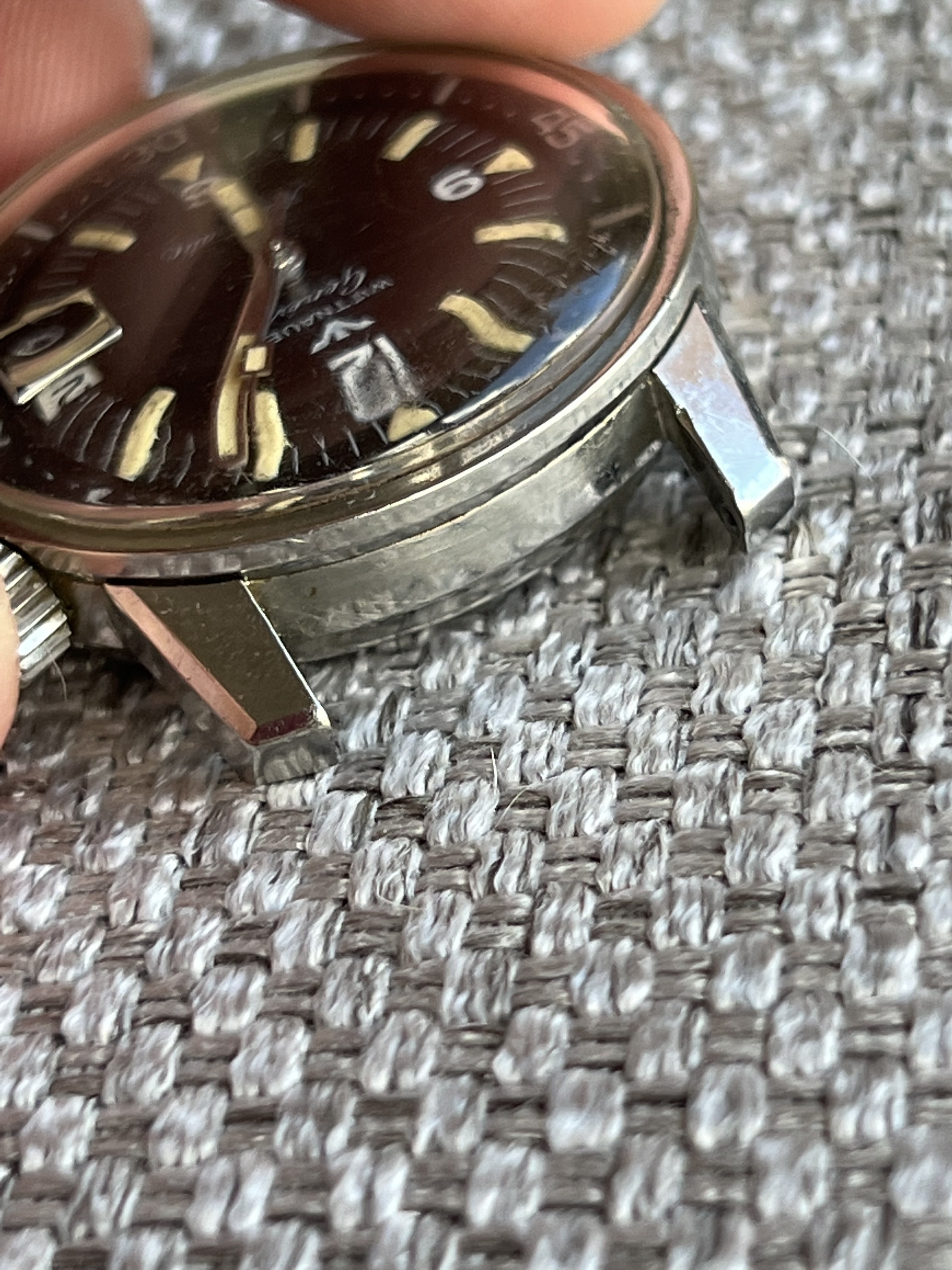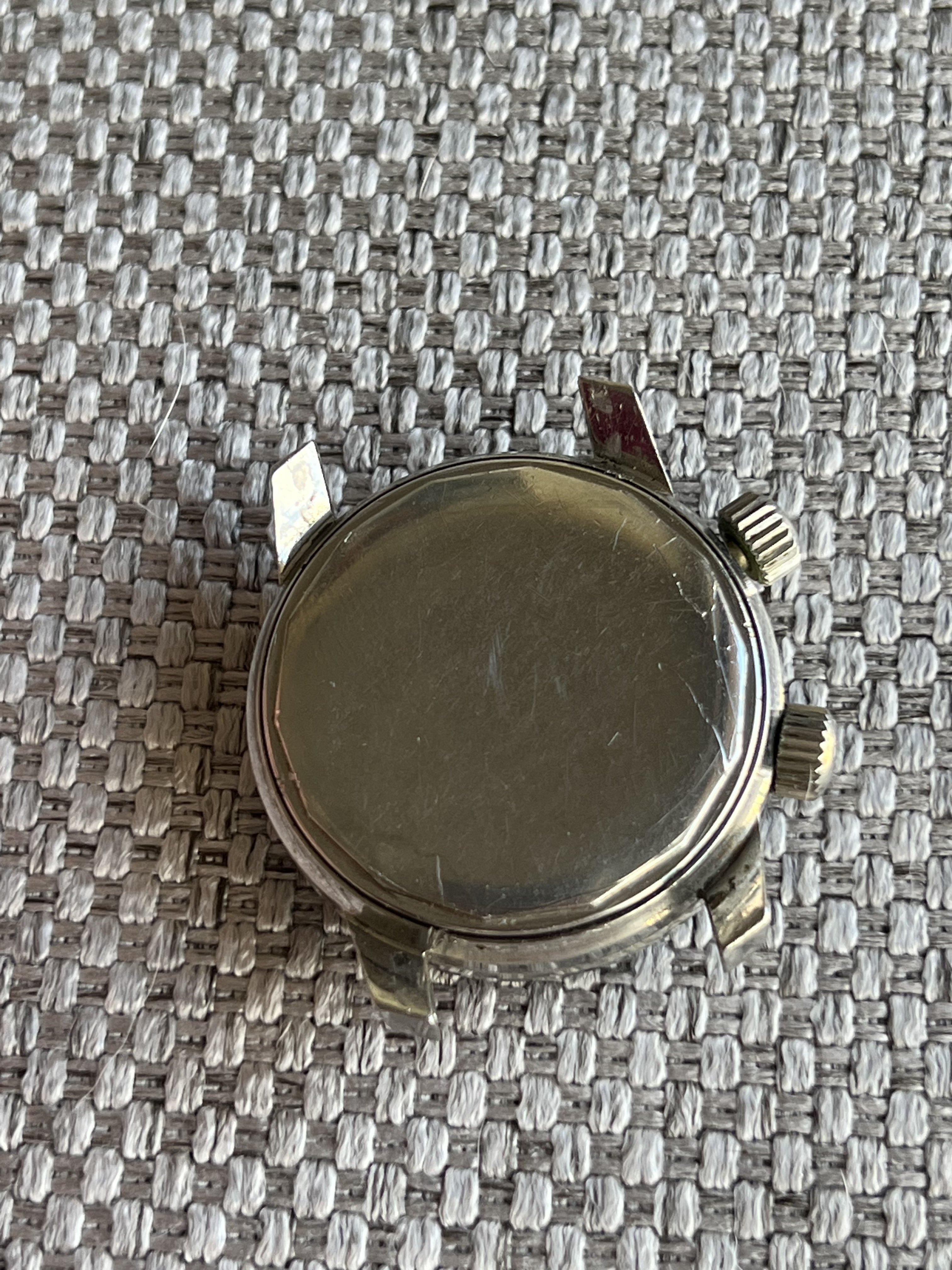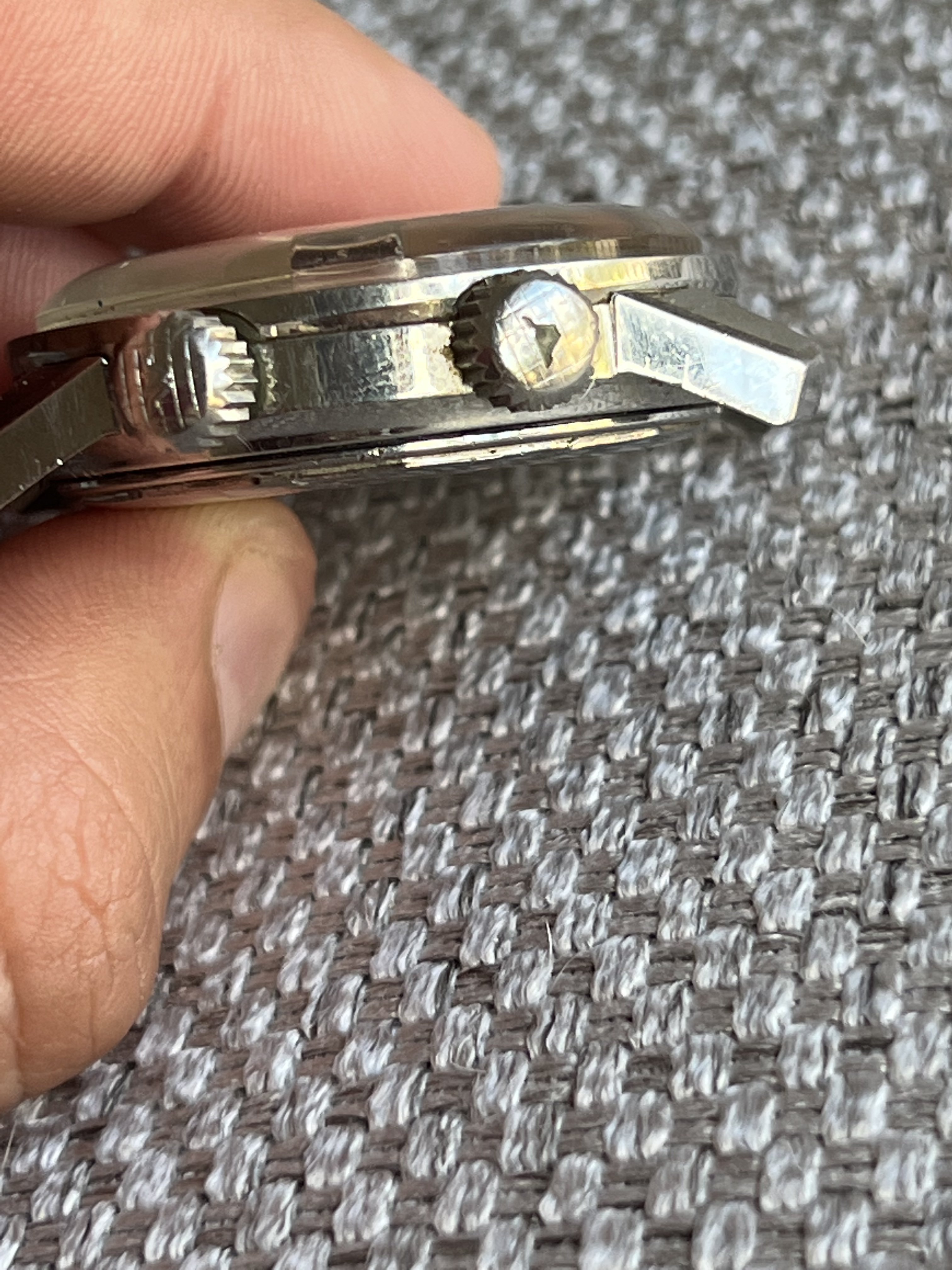 Case: looks to be unpolished as it still retains original finish. Crowns are also correct for the watch. I tried taking a picture to show the blemish in one of the crowns.