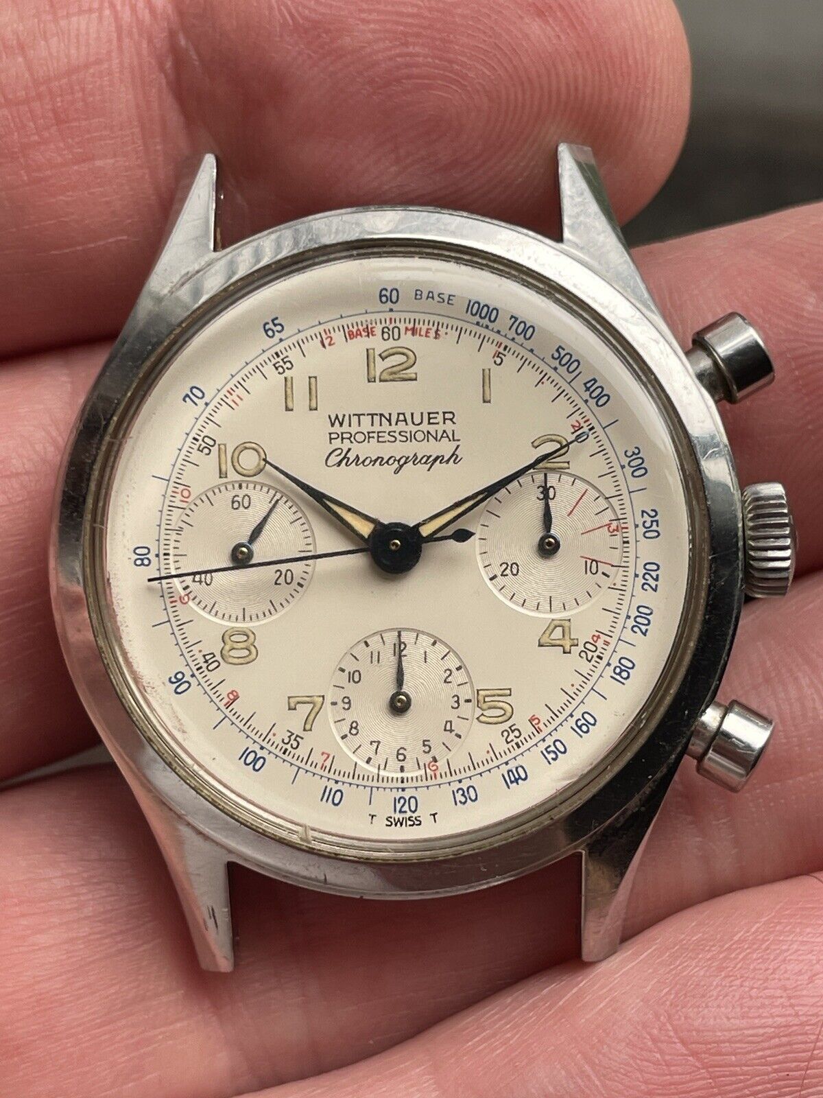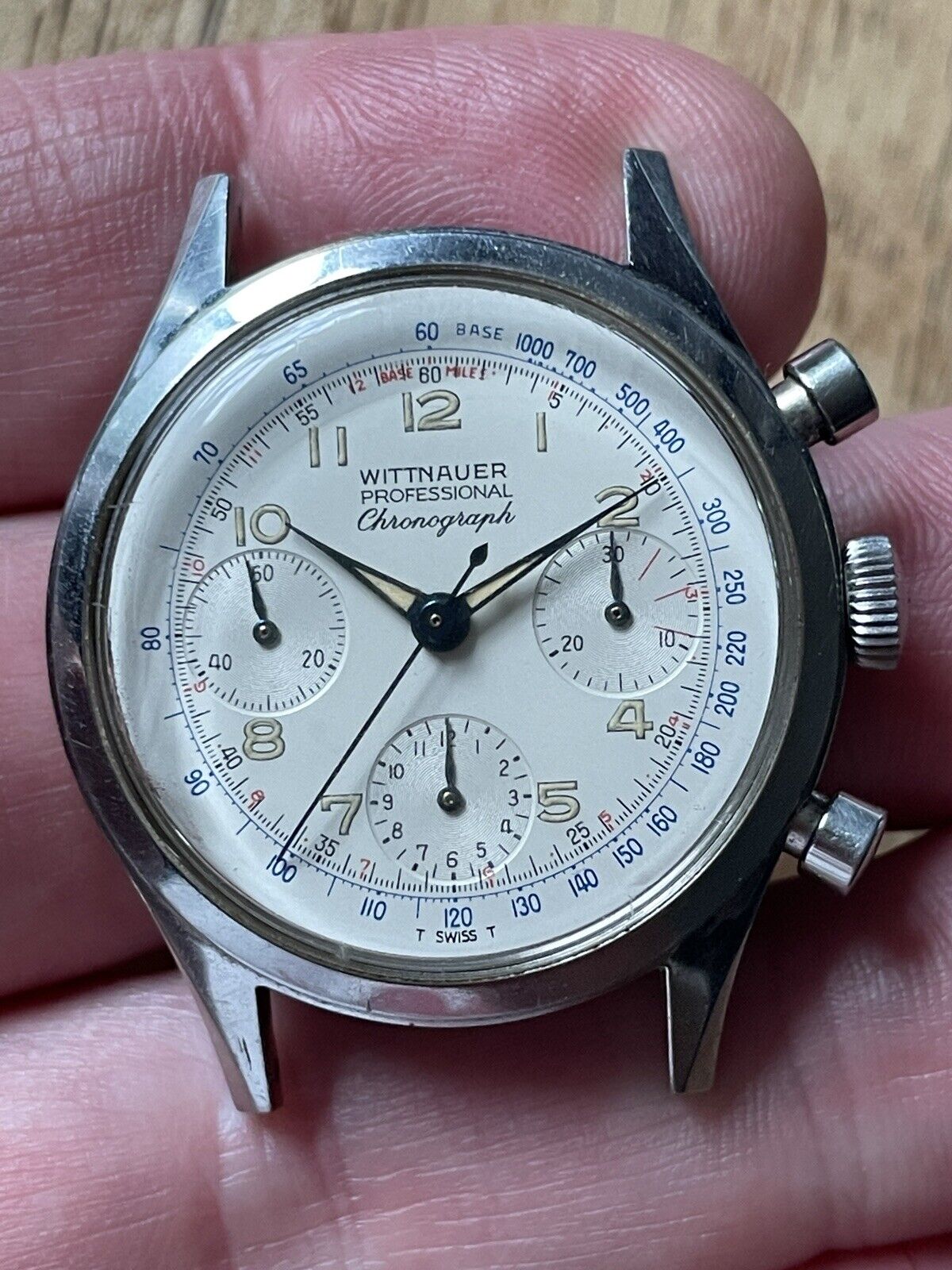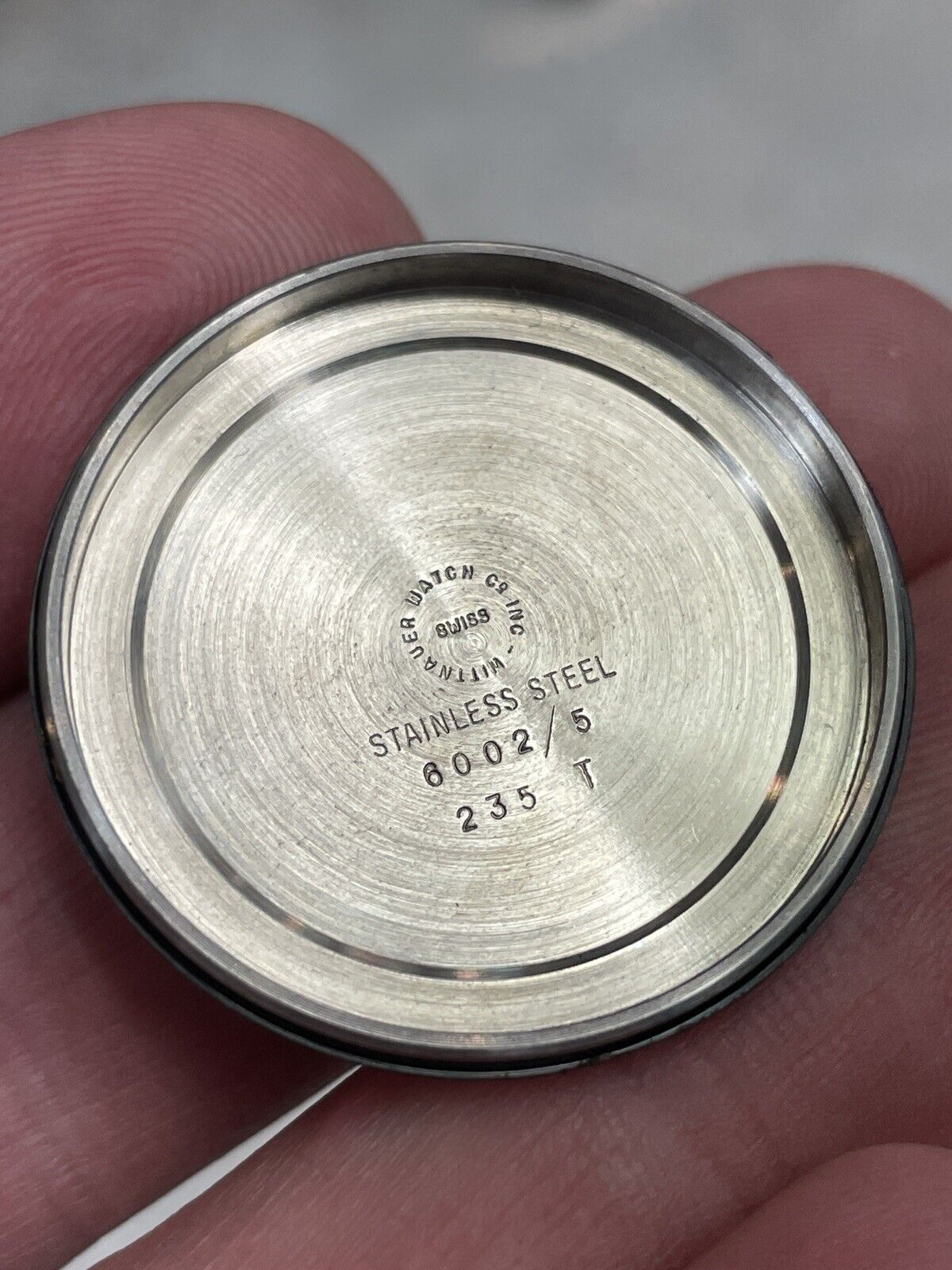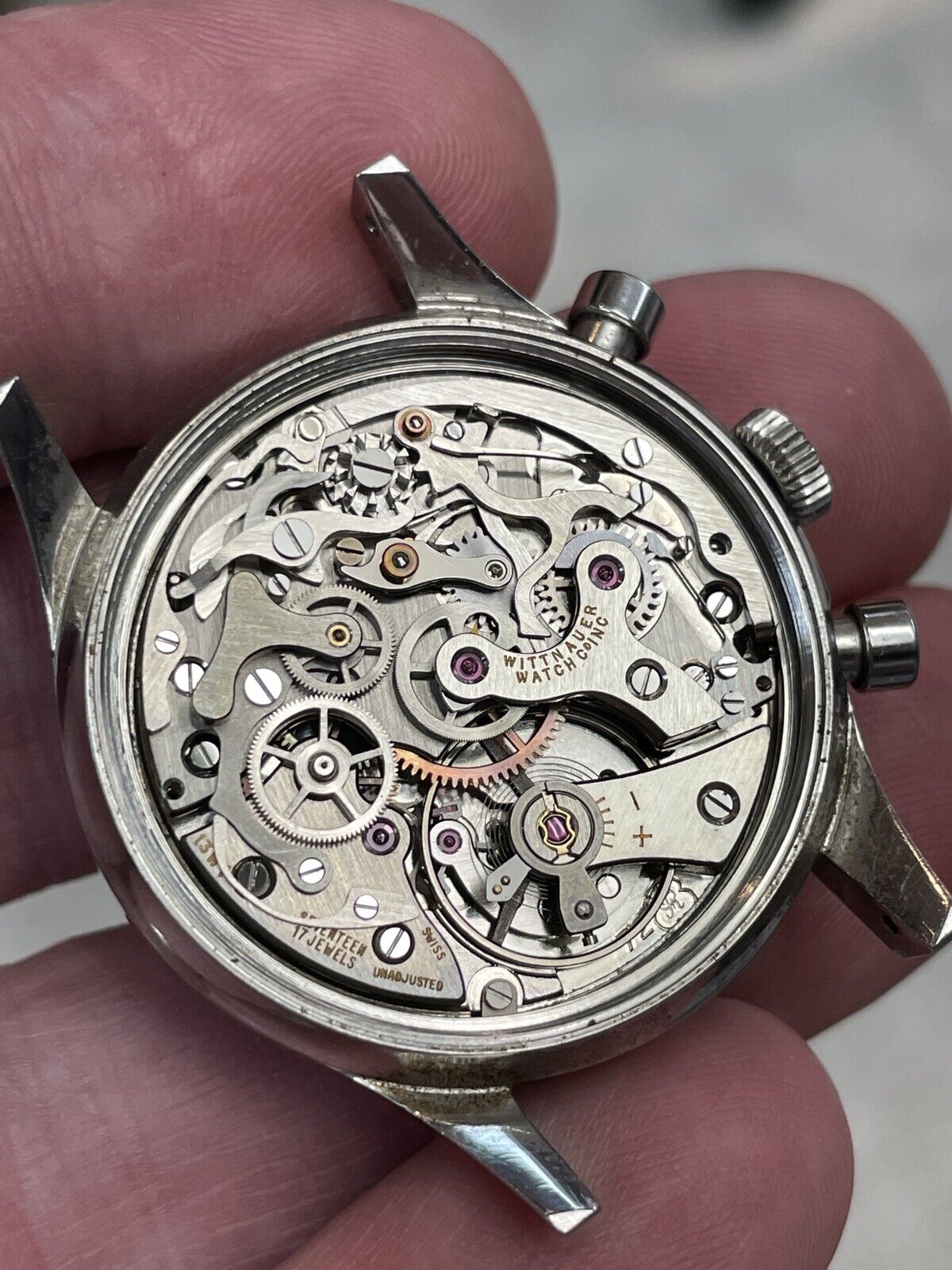 MVMT: The Valjoux 72 is running perfectly, the chrono starts/stops/resets as it should, and the timekeeping is very accurate. That said: the movement is clearly untouched and I believe I was the first to open the caseback since it left the factory 50+ years ago. This should be serviced for regular wear but, again, it's currently running very well.