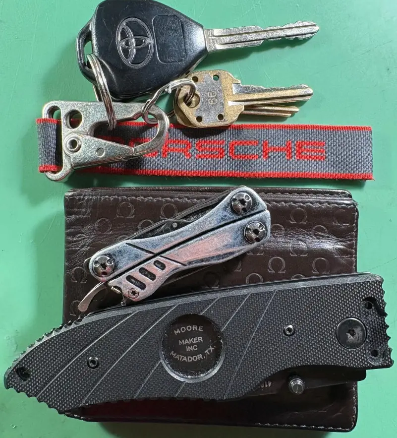 Phone is a Google Pixel 9 Pro, excellent phone so far. Keys are on an older model Orbitkey, black leather with stainless hardware. Glasses I have no idea the model, sunnies are Ray-Ban Wayfarers though. Watch... well. And hat is just a baseball cap where appropriate, has a unit patch from a previous contract on it.