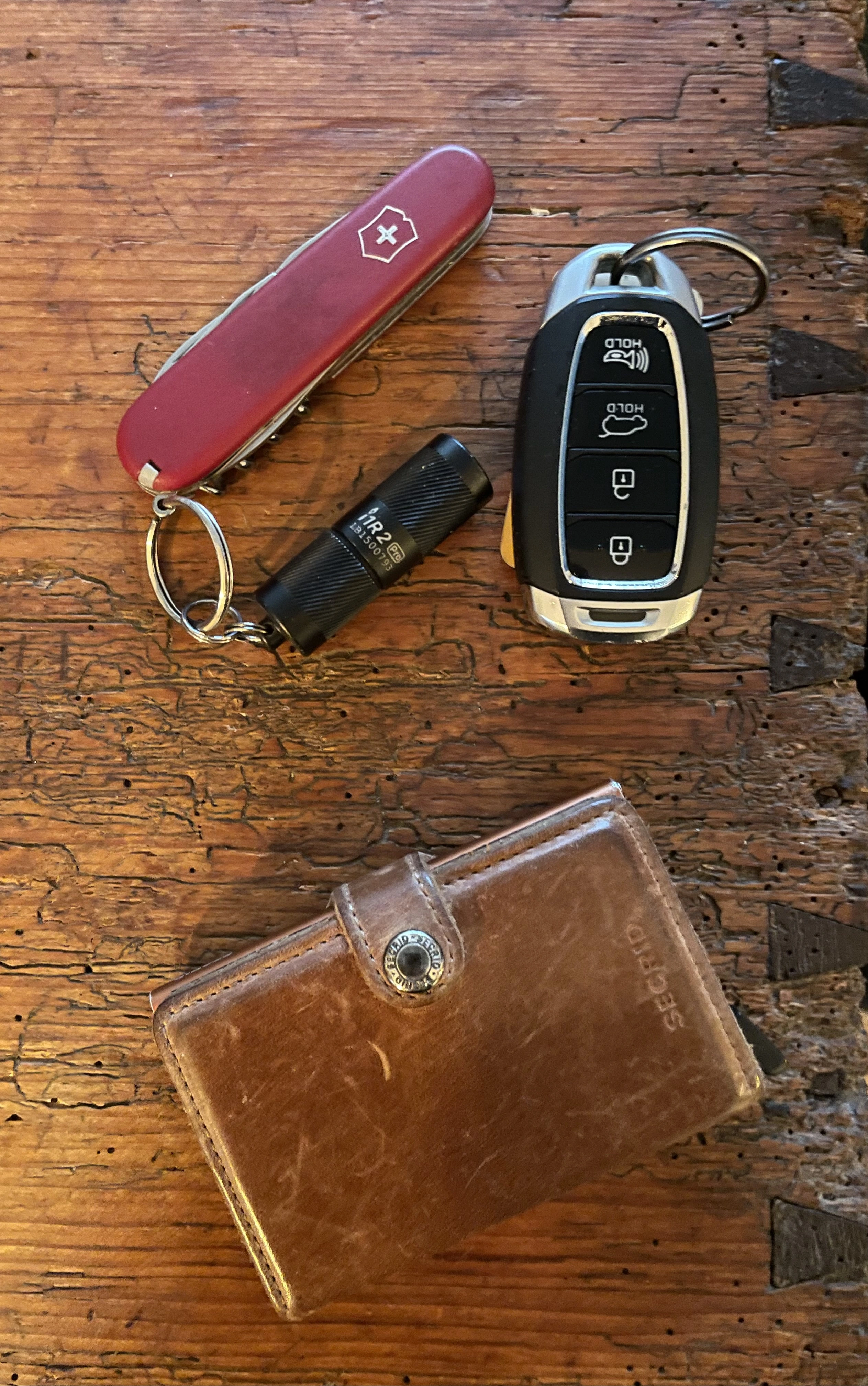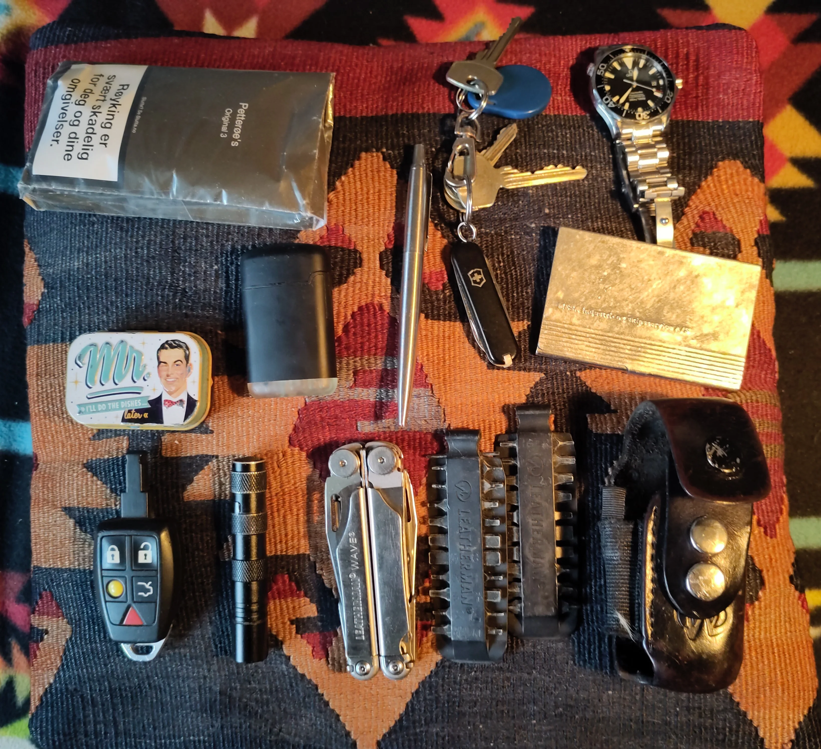 Every morning I leave the house I repeat the mantra "Phone, keys, glasses, watch, hat" so I guess that's my EDC these days. 😜
