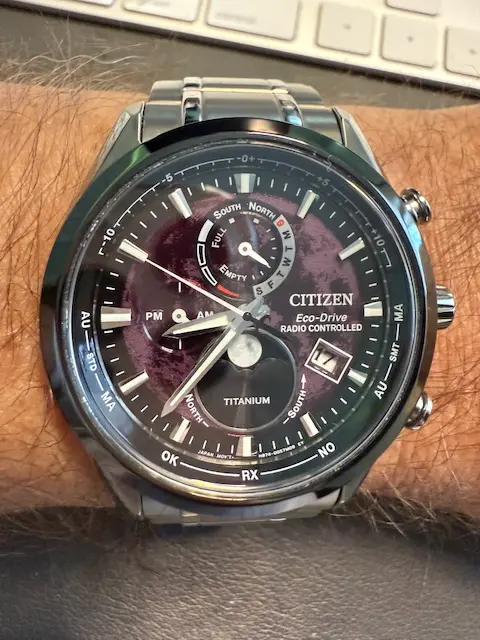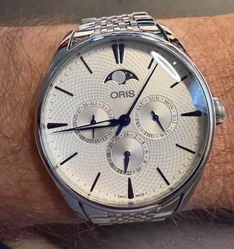 I've trotted out the Oris Artelier for the occasion. I keep this in a winder because if you've ever set one, the moonphase complication is not on a pusher so you can spin the crown 29 days if you have to. All of the other complications, day, date, and 2nd time have a pusher.