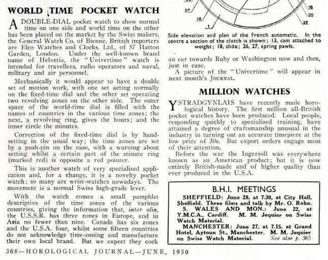 Here is an article from the same time as this patent, from the Horological Journal of June 1950, with an article about a universal time pocket watch from Helvetia. Wish I could find something like that!