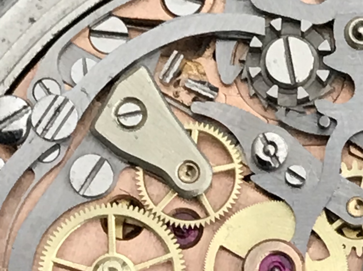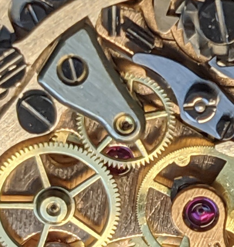 When I look at the movement through a 25x lens I can see the coupling yoke moving the coupling wheel into the chrono runner but the coupling wheel slows/stops occasionally, leading to the hand problem. The small second hand gear seems to turn smoothly so I'm wondering if the coupling wheel is loose in the yoke and/or wobbly? Is there meant to me a jewel holding in the coupling wheel as when I look closely to the center of the coupling wheel shaft (top of) all I see are what looks like 3 weld/braise dots.