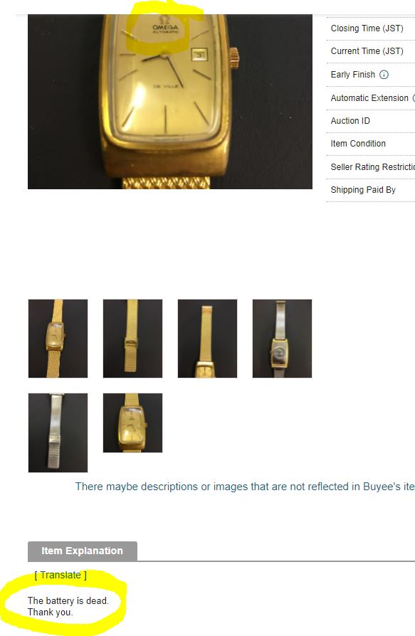 ·The Japanese listing is translated perfectly. It says the battery is dead. It also says they won't send the watch outside of Japan, but I guess the Buyee broker handles all that.