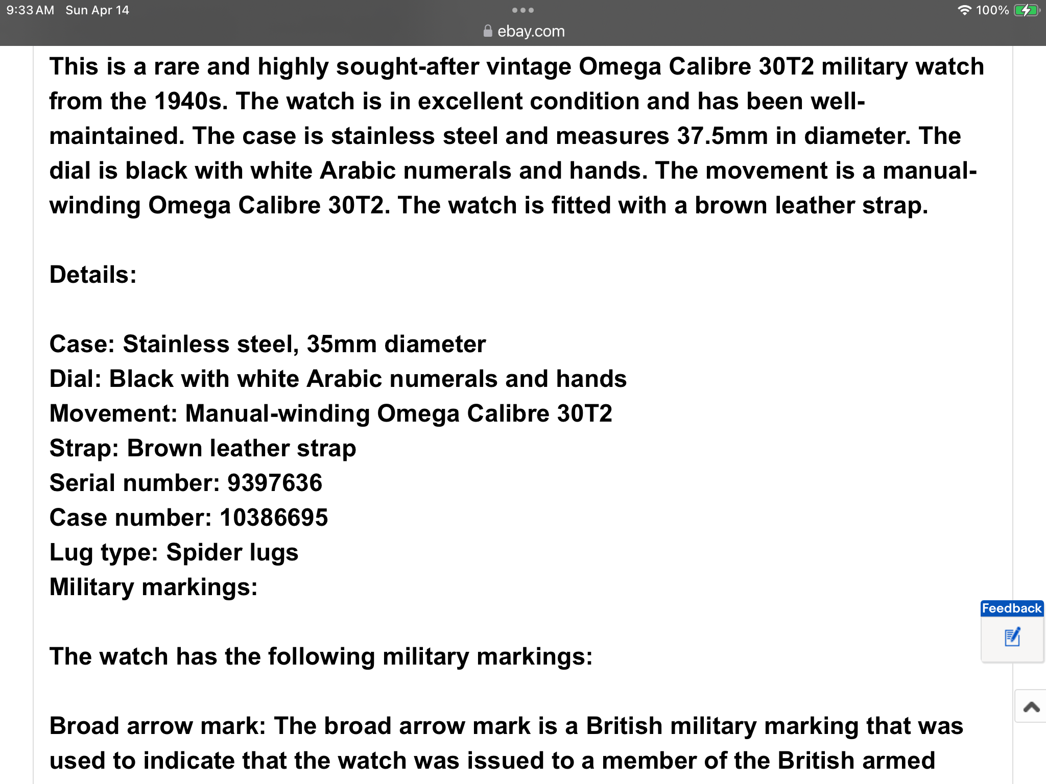 Posts 2,554 Likes 3,668 Pvt-Public ·Apr 14, 2024 https://www.ebay.com/itm/134979619373?_trkparms=amclksrc=ITM&aid=1110006&algo=HOMESPLICE.SIM&ao=1&asc=260662&meid=4d27be6cfb0c49ddbf027ce3928ad8e4&pid=101875&rk=1&rkt=4&sd=303816414571&itm=134979619373&pmt=1&noa=0&pg=2332490&algv=SimplAMLv11WebTrimmedV3MskuWithLambda85KnnRecallV1V2V4ItemNrtInQueryAndCassiniVisualRankerAndBertRecallWithVMEV3CPCAutoWithCassiniEmbRecallManual&brand=OMEGA&_trksid=p2332490.c101875.m1851&itmprp=cksum:1349796193734d27be6cfb0c49ddbf027ce3928ad8e4|enc:AQAJAAABgLSVkHmTL63bebovD9RfpraPWbY9f4anjbziTIaEIOVXg2DWhVLks3Lfqff9vxxfjIh4XEXusIehlT2iEH8%2BCxXNySMxlDIQJ3g86%2Bx3AAIAq9gznqdGSR72ksP41kjzPN1reUbVsJuld0S4i4qXlQfTmkMeIJTCXTM8mLpr7ju2fMvruDu87ZX%2B4bShOvD%2B4i%2FZd8I1iT6L%2FOCT7AkCopmiKVuMP9SwiBBCJQXPRUzqKIc1k4cv7XLhfUIvoPyLQpEc0p4AKsxcMTyLeAhKuF%2F5wE%2F7FVfx13wwkQpqmhl1RDILCZKJhm9VjOGR7eL3hBDV0SMLwmEW5UyaaBb5Vpbsac5tC6OmJrQWYtnExaZoAH5kVqrGT4jwFvJ0%2Flocf6iDC7st7JqduCfKRfqwviysZPBsxQ73jpa7rKiPqWx%2B4wyHiz%2F8pzTxmEFxeyum1ppF7pmu%2Bt4lMYV0WPIAOWoqkjY0pabOM7WUHQAtUa27a7aZlVGLtsyx8d44BxX95Q%3D%3D|ampid😜L_CLK|clp:2332490&itmmeta=01HVEC8YKTDSWDHRFDD1FEQDN5 I don’t see anything vaguely military about this. Not the Black dial with white Arabic markers, broad arrow, nor the dial that is is excellent condition. This website may earn commission from Ebay sales.