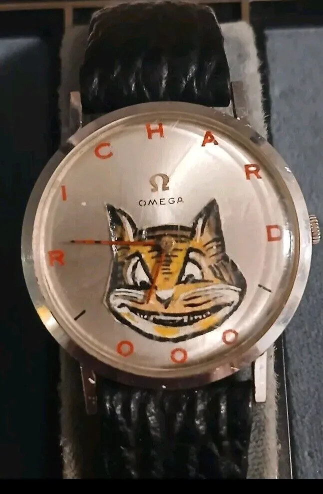 This is a solid contender, 14K solid white gold, with a custom cat dial that says RICHARD OOO on it.