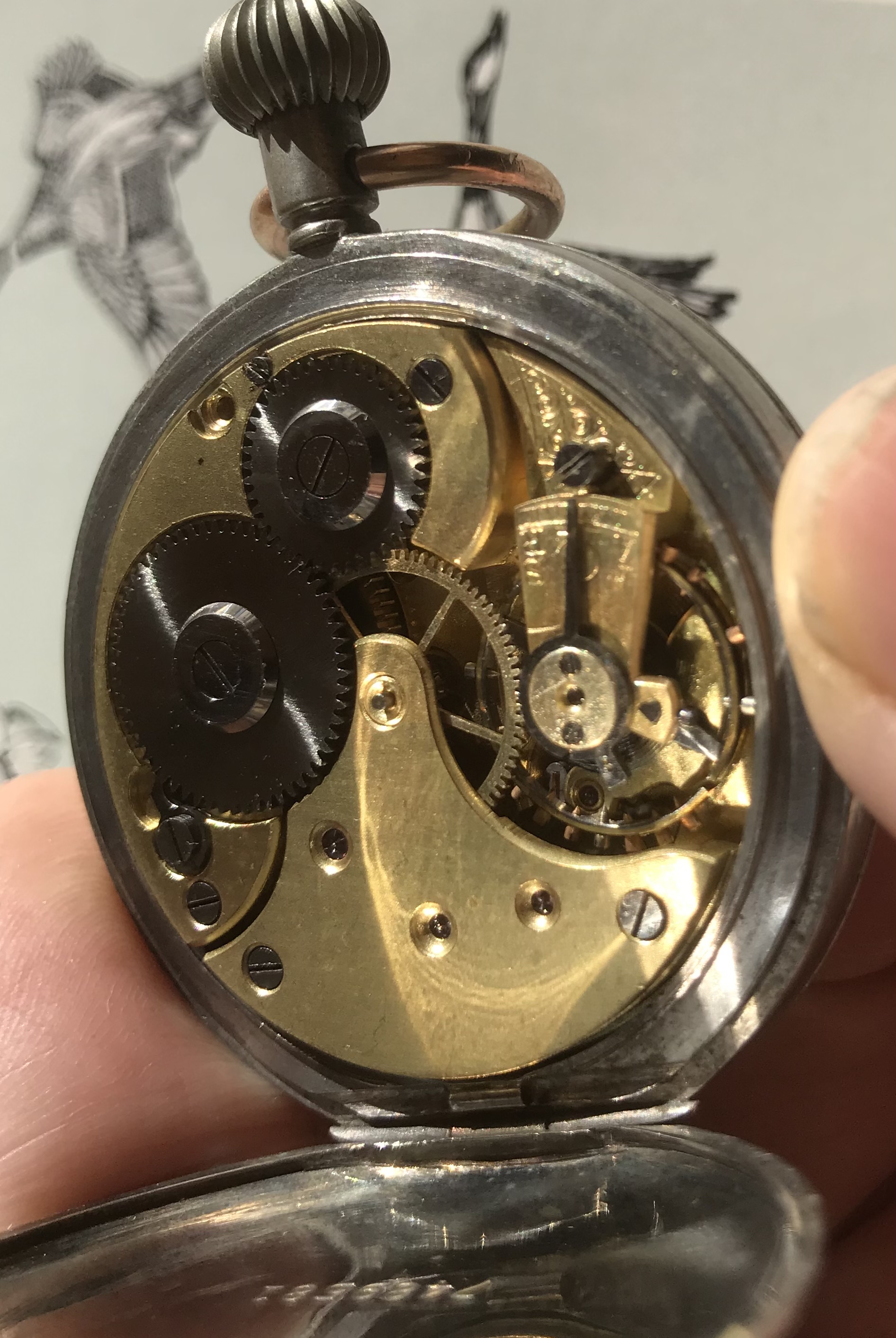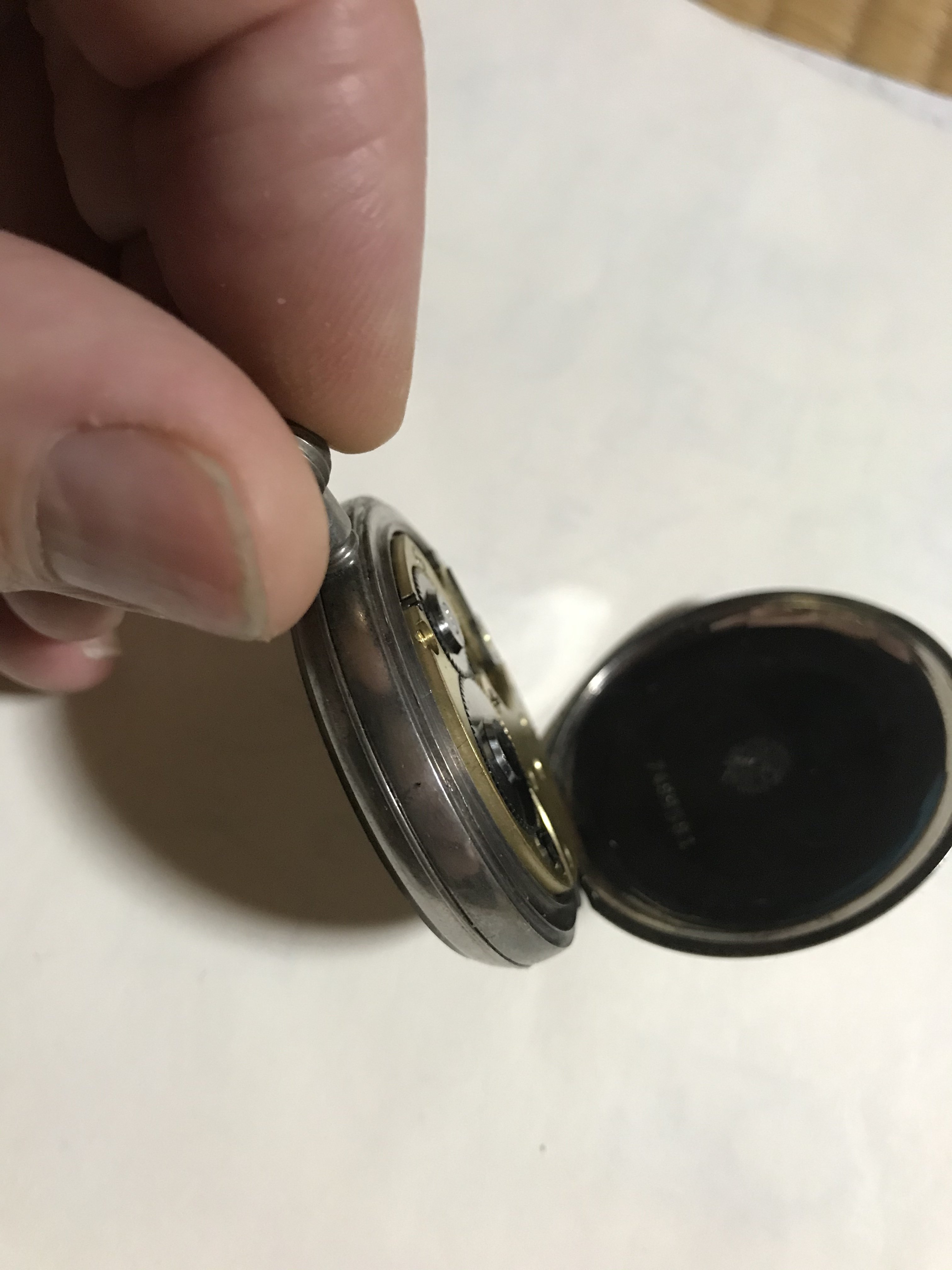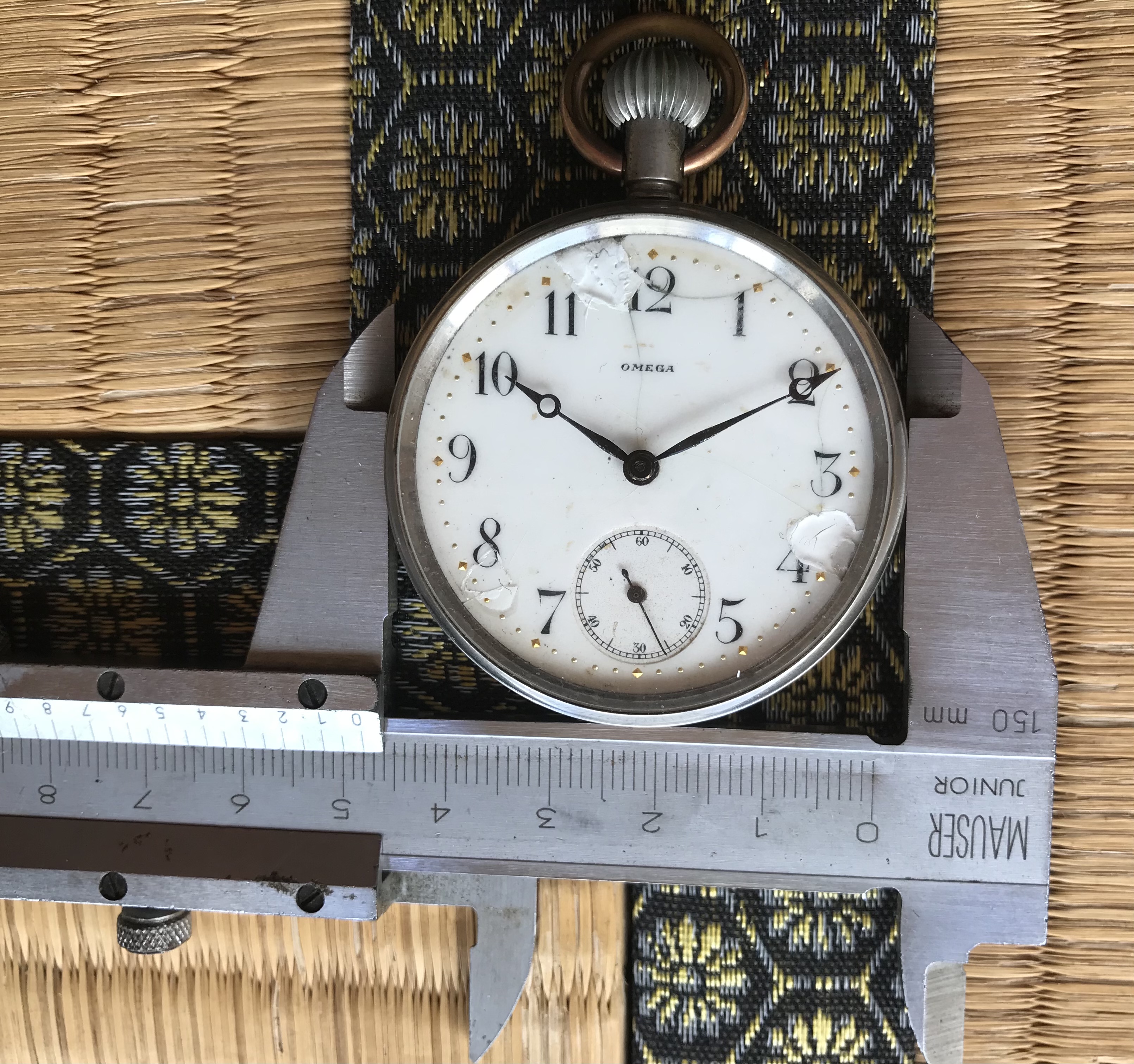 They had two watches, this pocketwatch and another Omega wristwatch with wire lugs with a diameter for the watch belt of about 8mm (?!). Both in a very sad state, no or broken glas, parts missing, non running. Owner told me they are