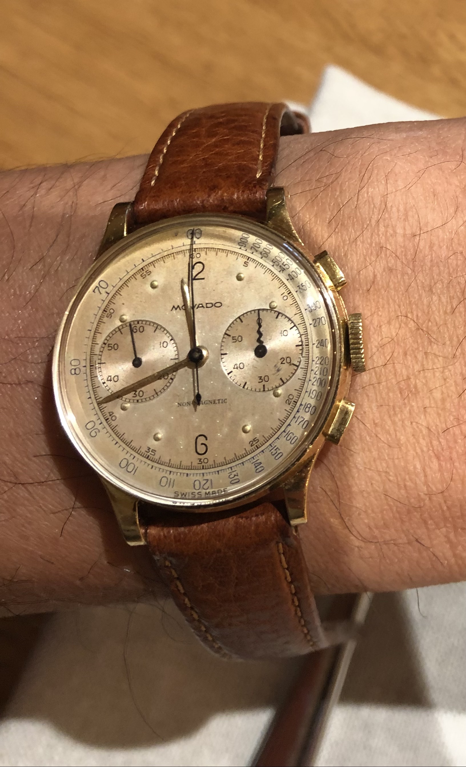 I'm offered this M90 in a solid gold case. The case looks reasonably sharp and the dial has some patina, but fairly evenly spread. The movement has just recently been serviced by a watchmaker that I also personally know. The asking price is CHF 2800, which I thought was fair when I thought it was a 34mm watch, but it turns out to be 32mm in size.