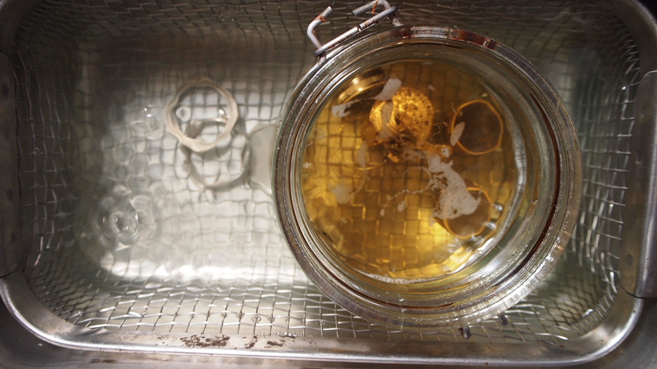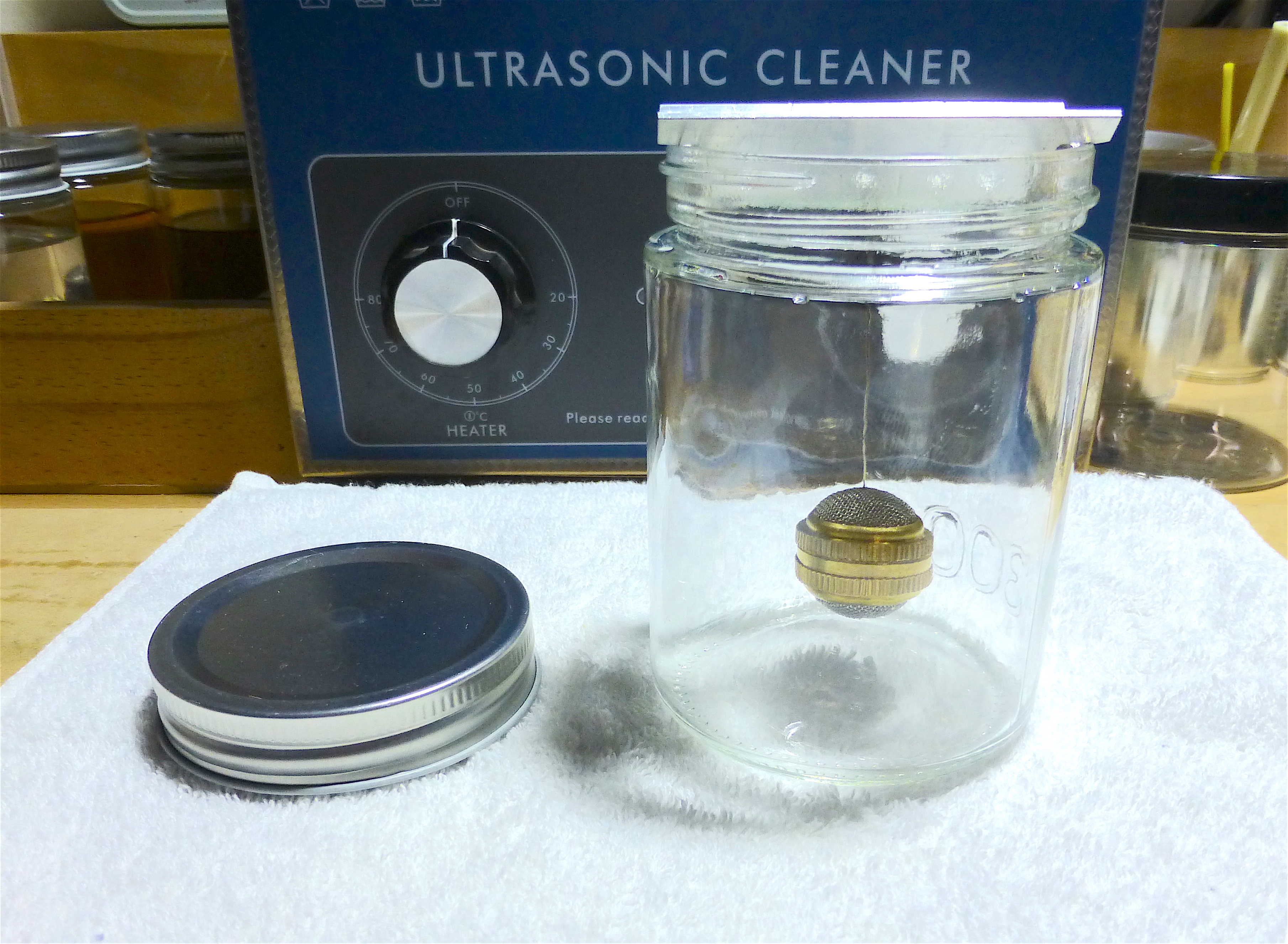 You can get away with naphtha (benzine, white gas, coleman fuel, etc) but you should get proper cleaners (Be very careful if you use naphtha as it is quite flammable). I use L&R #111 Ultrasonic Watch Cleaning Solution - Ammoniated and L&R Ultrasonic Watch Rinsing Solution. They are based on Stoddard Solvent with various additives for enhanced cleaning in an ultrasonic. The picture Canuck posted above is the right idea for a hobbyists ultrasonic; the thinner the glass the better. Kimax beakers are recommended although a bit expensive in lots of 12.