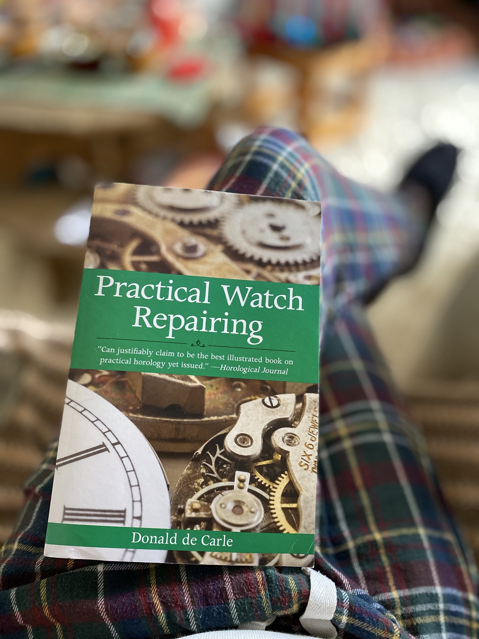 Get one or more cleaning baskets, about the size of a large thimble with a screen on each end for the little parts. A larger basket that just fits the glass makes it easier to drain and dry the parts; a hair dryer or heat lamp does the trick (again the flammability caution on naphtha). Get pegwood for pegging the bushings and pithwood for cleaning pivots; you can read about both in de Carle. I have his Practical Watch Repairing and as Archer says, it goes into the basics pretty well but many parts are dated.