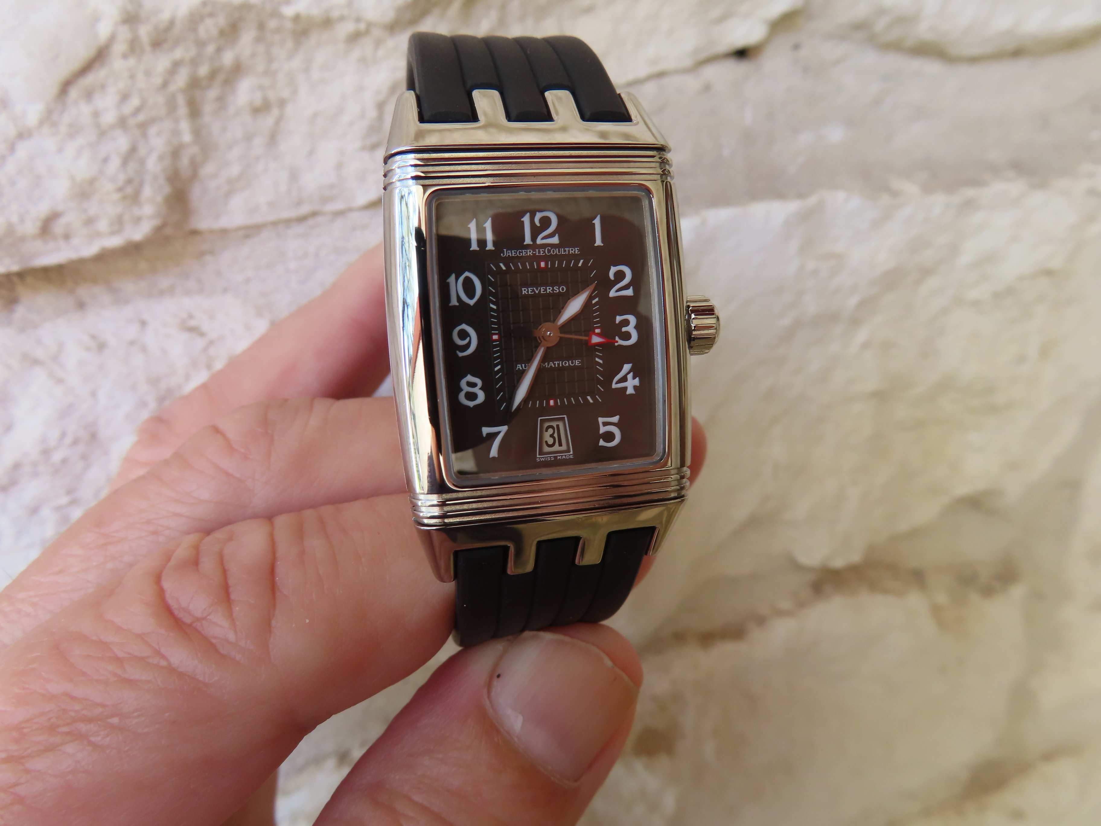 I bought my wife a Reverso Gran' Sport in 2001 and had it engraved by JC Randall who was JLC's authorized American engraver (now retired), but she stopped wearing it a few years ago so I thought it was about time to get it overhauled and put back in good condition. It was a pretty seamless service from JLC in Dallas, you put in the serial number on their system and it comes back with the estimated cost. They even include insured FedEx shipping both ways. Total cost was $650 (plus state tax) and took about eight weeks, a fair price and turnaround in today's world. They did a really good job and they cleaned up the case as it had acquired a fair about of scratches over the years.