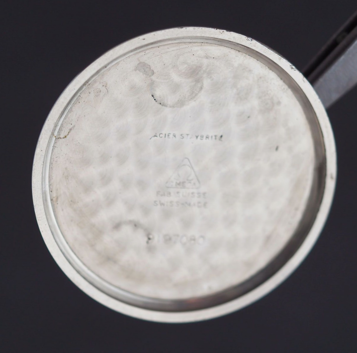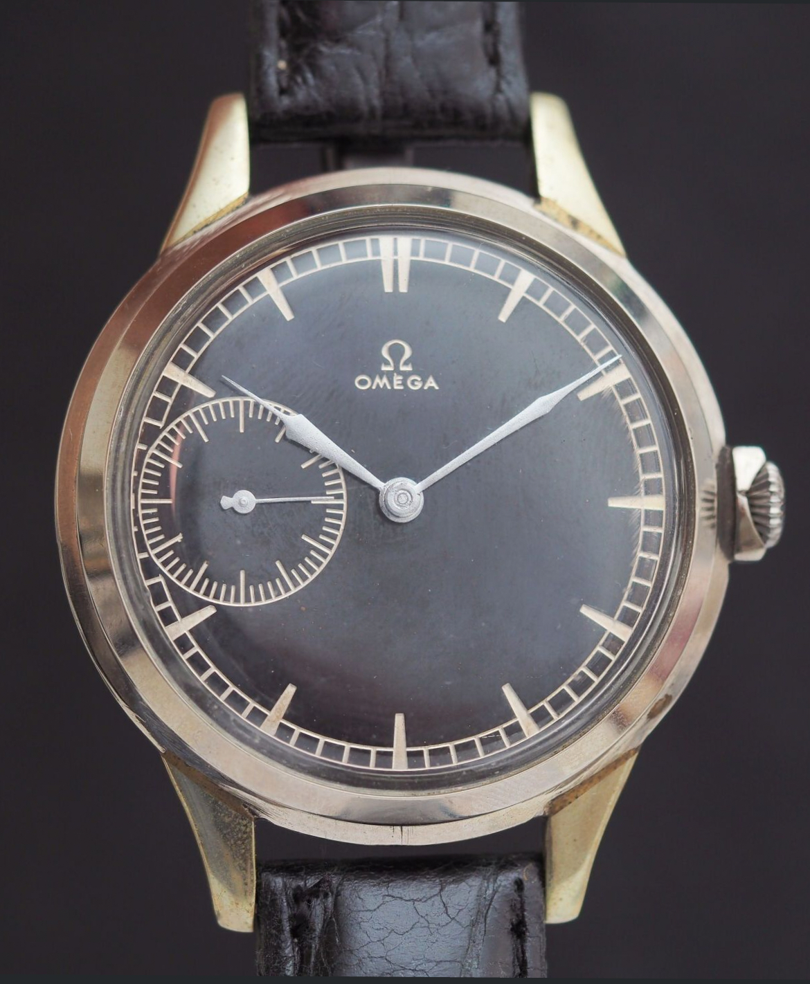 Black dial (repainted). Index sticks. Small second at 9am.