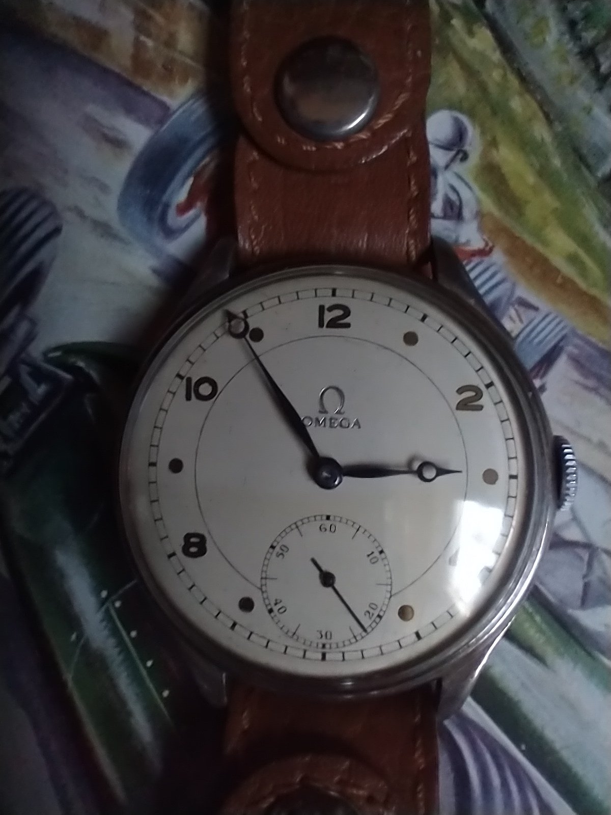 I presumed that as I had never heard of a wristwatch this old of such a modern size it would be a re-cased pocket watch movement. I have gleaned some information about it over the years, including the existence of pocket watch movements with the subdial at 3 o'clock. I still think that it is a re-case, or maybe lugs were added to the original case which has a patina that suggests it could easily be contemporary to the watch. It looks to be nickel-plated steel.