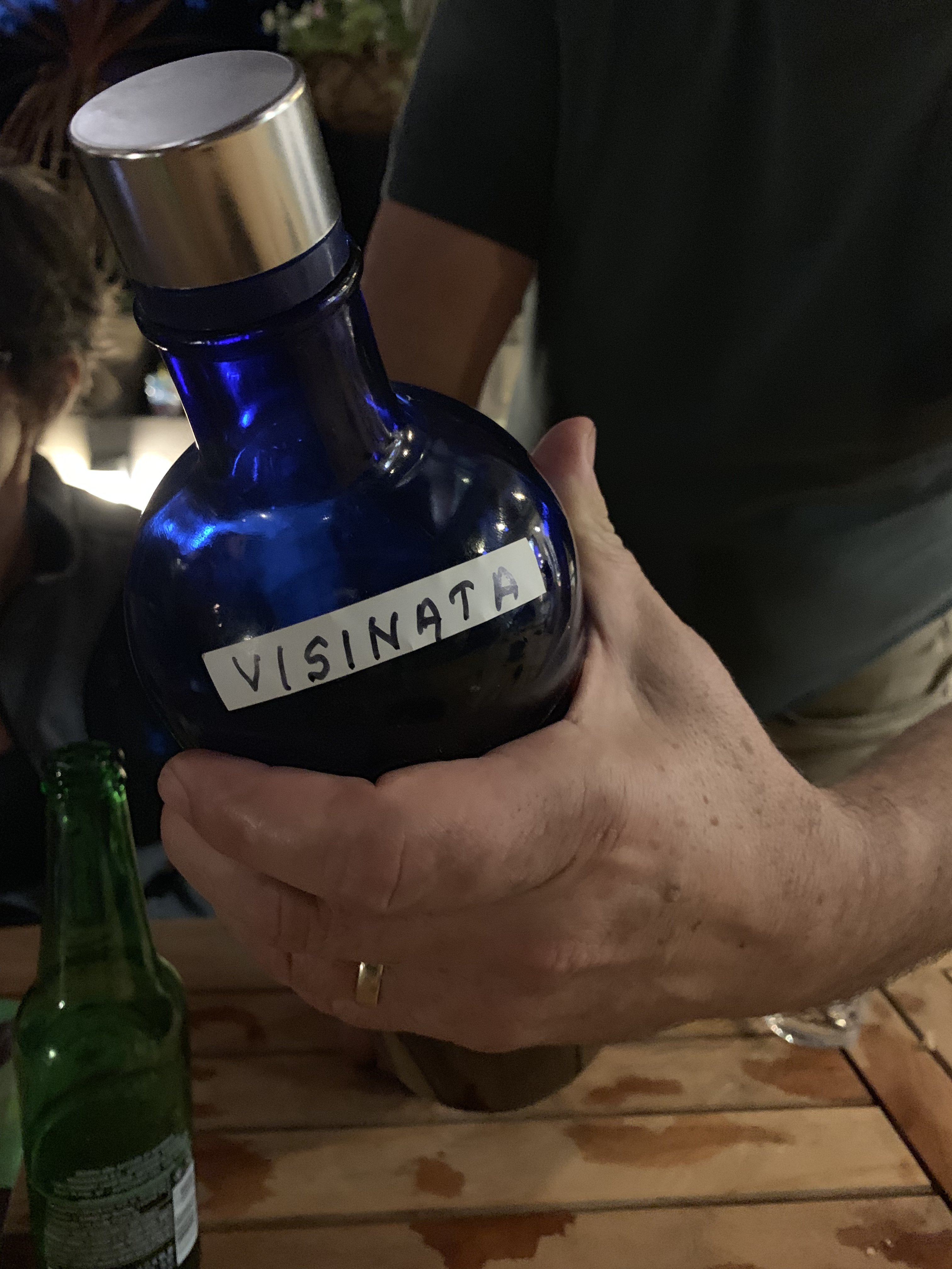 We ate well, but drank even better. Romanians know their fruit liquors, and because many are simply not sold here in the US, are good at moonshining. We had three kinds of homemade plum brandy, and a sour cherry liquor they call Visinata--. Wicked stuff, one of them, called Tuica, could have stripped layers of paint off a picnic table--but the plum brandy labeled (with a piece of masking tape) "Plum Tails" was pretty good--it may have been mislabeled, it tasted more like Calvados or Applejack.