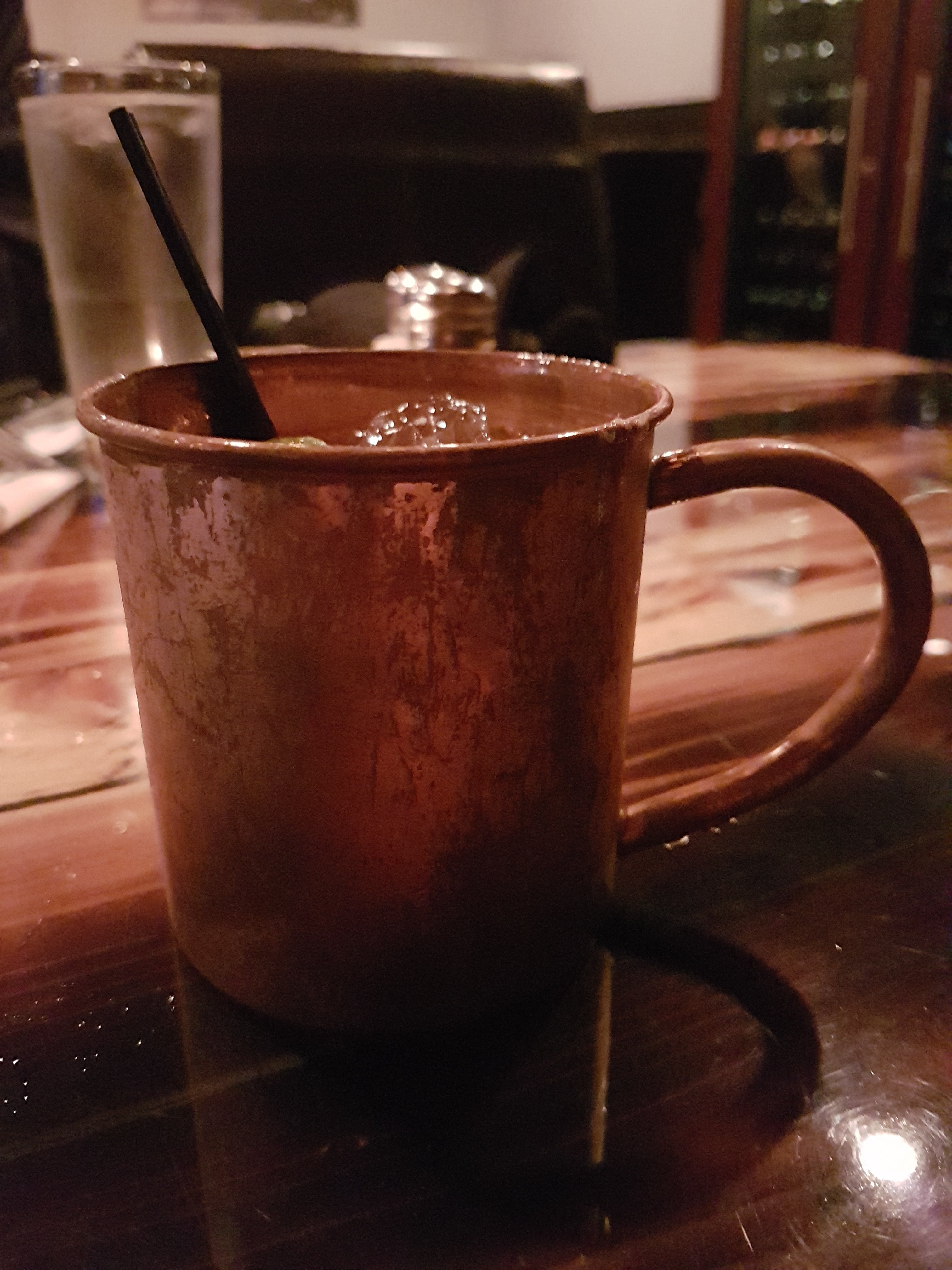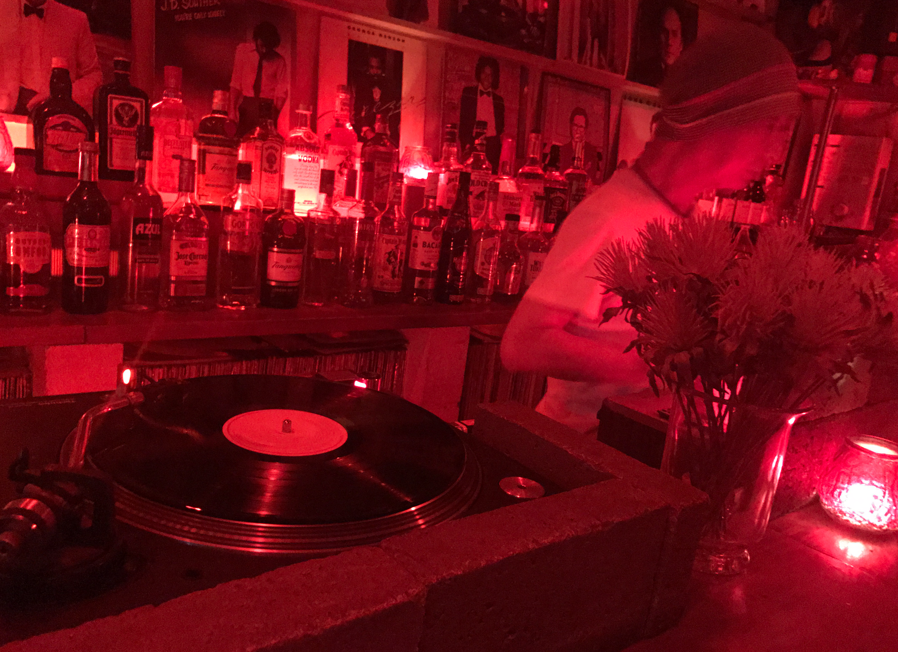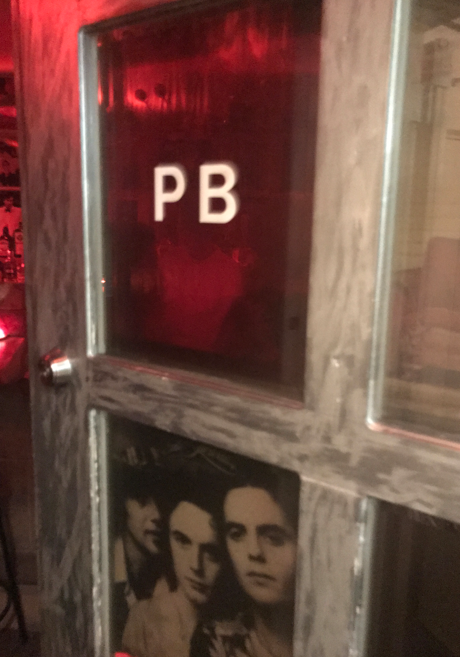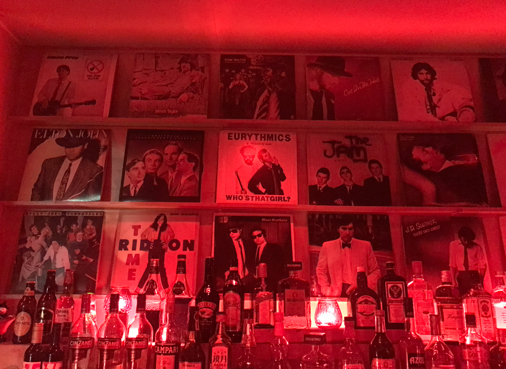 That night's music playlist was all over the back wall. My friend said, "I think tonight's theme is men with coats and jackets" 馃槣