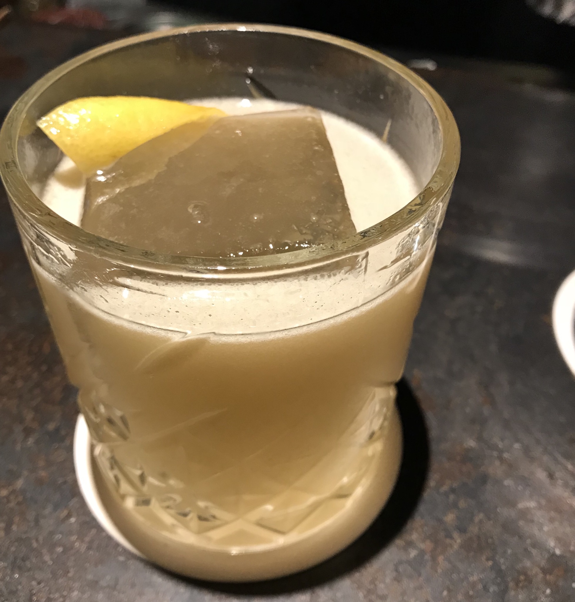 Mustard infused Whiskey, ginger syrup, and lemon.