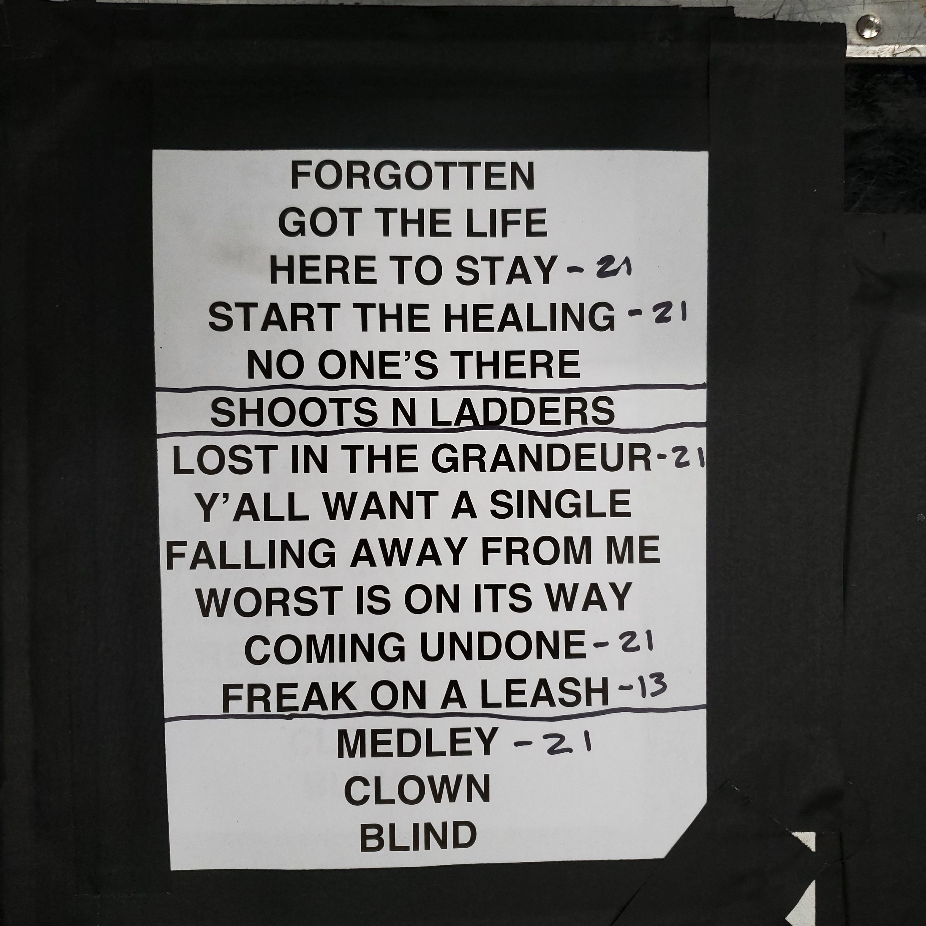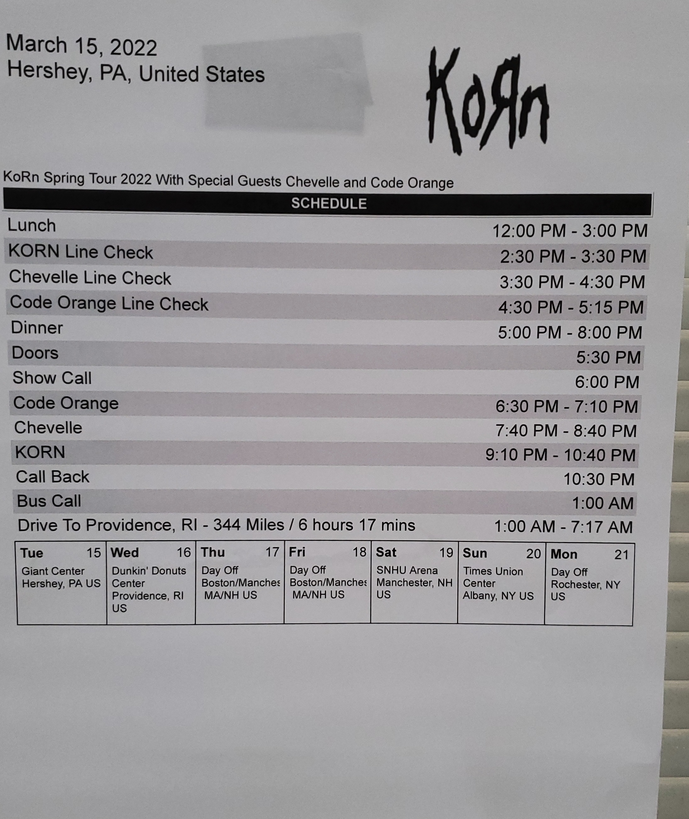 Korn. Giant Center. Hershey PA. USA. Ear bleeding, can't hear tomorrow, double muff headset doesn’t help loud. Nice crew...they tried. No winners only survivors. Art for money.