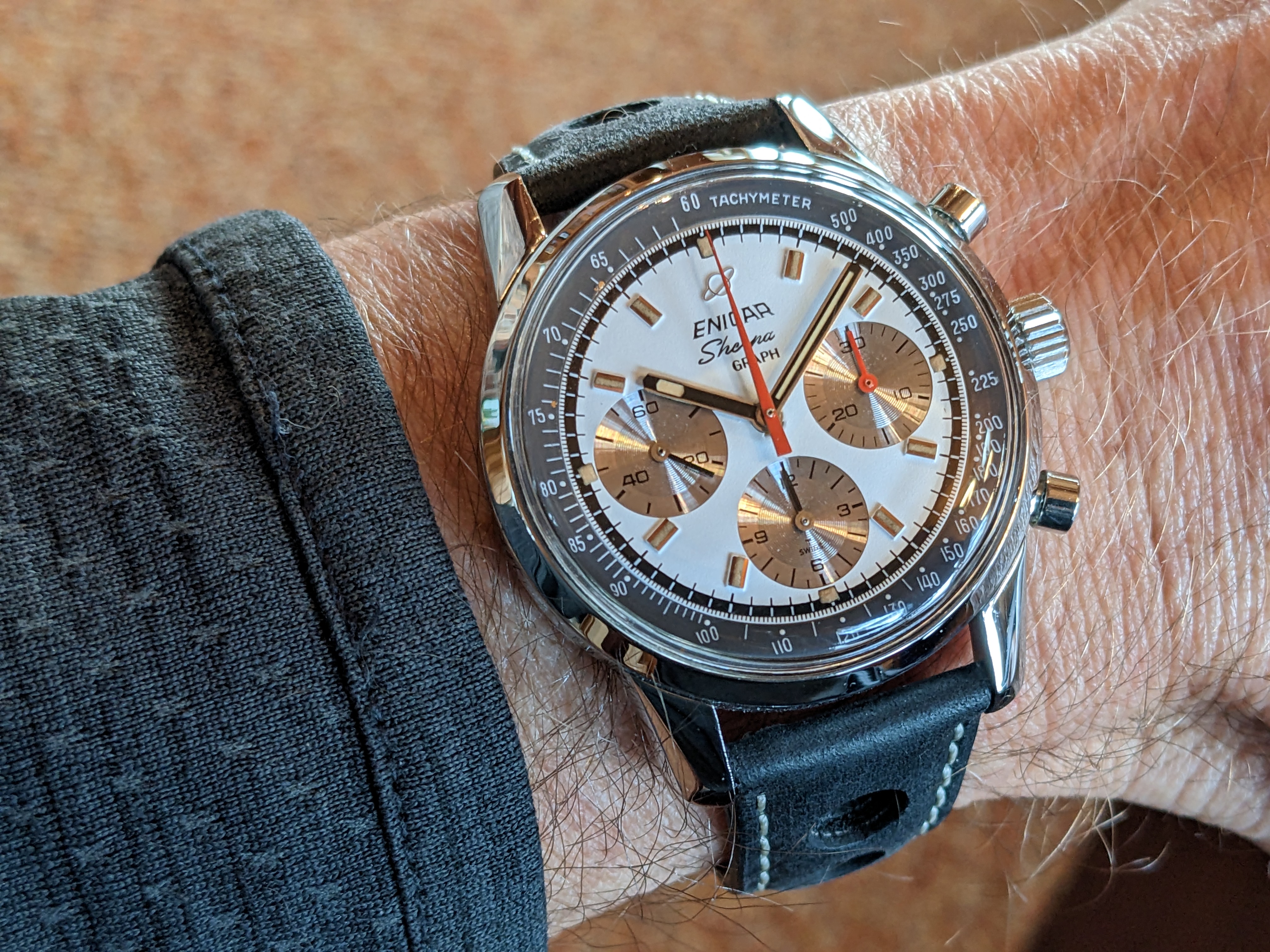 Posts 428 Likes 5,636 Gopher ·Dec 26, 2022 Another Enicar Sherpa Graph Mark IV. This one a rare white-dial version (with V72) from 1968-69.
