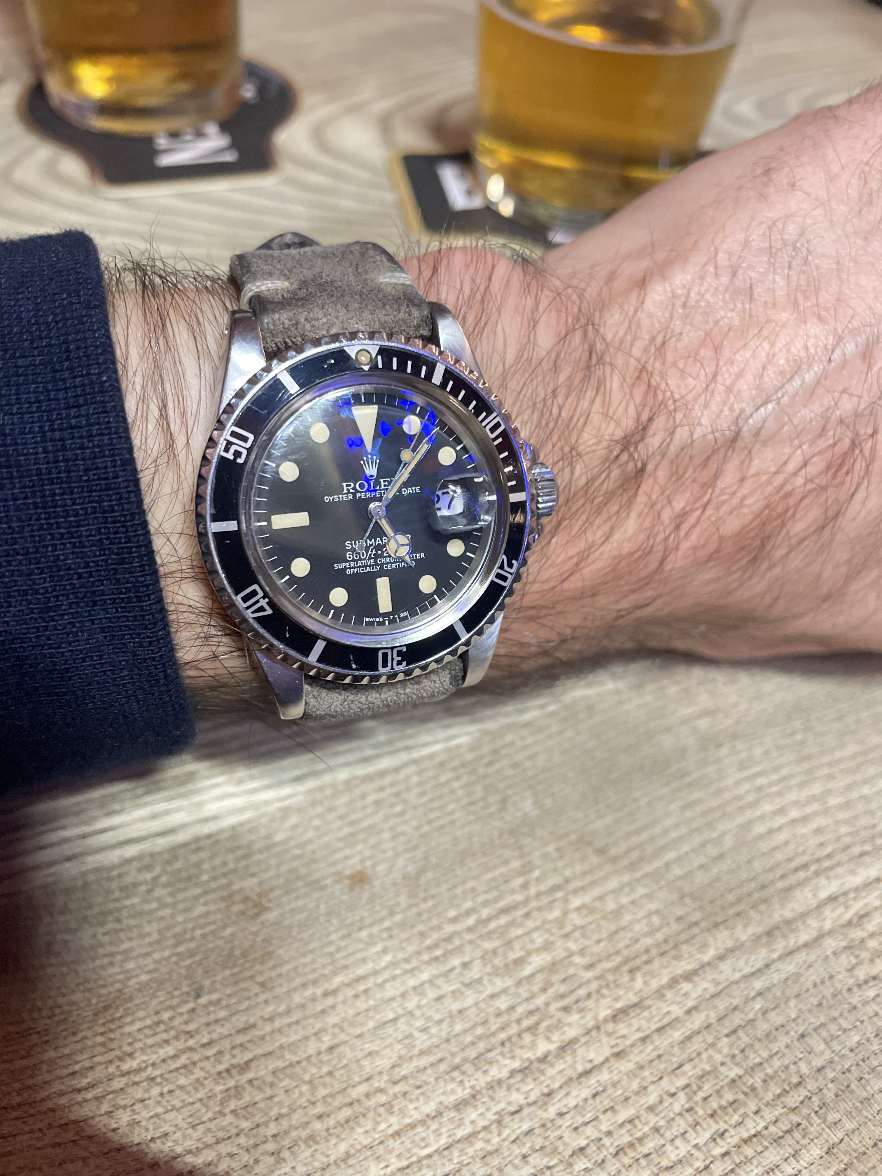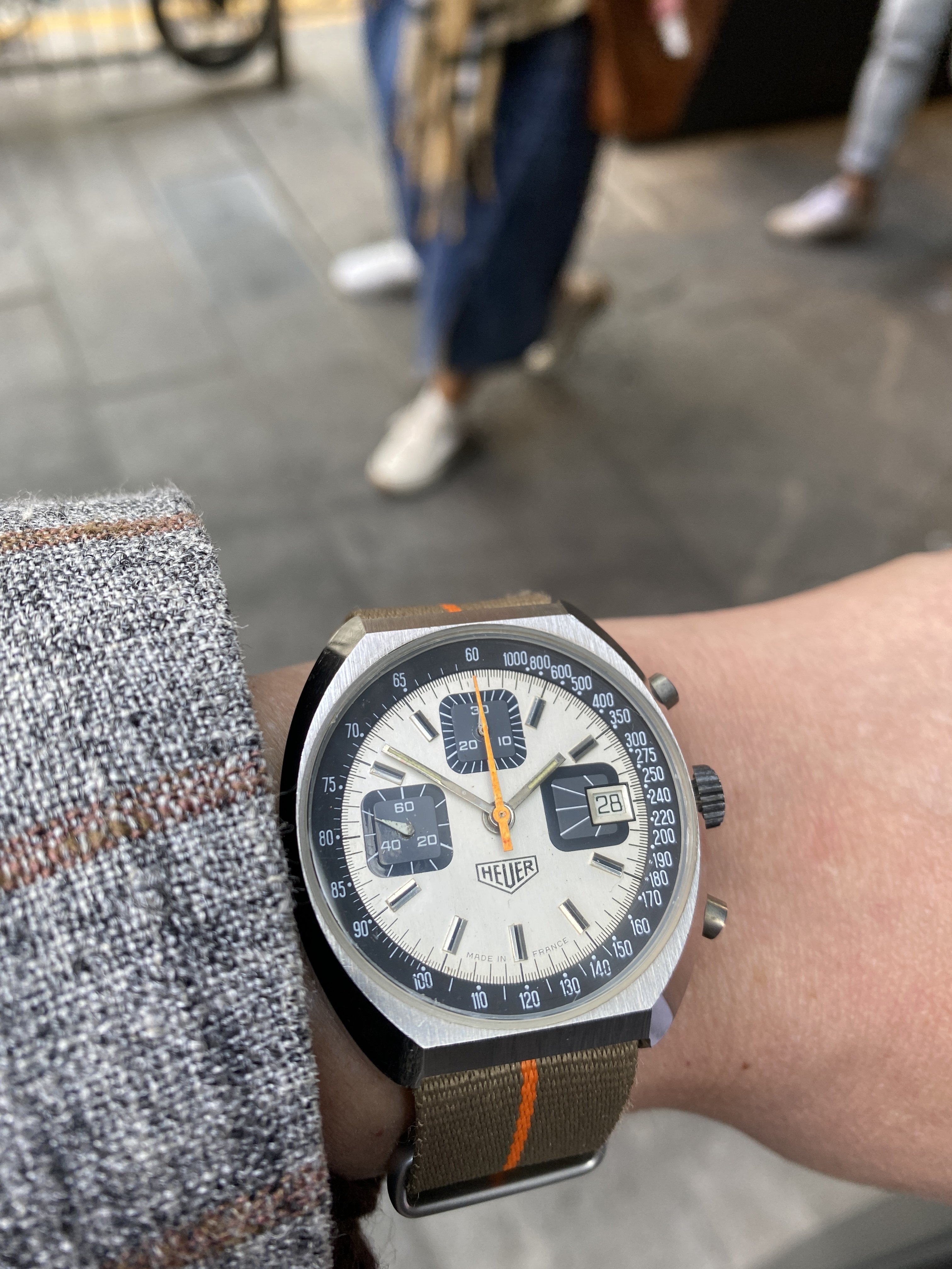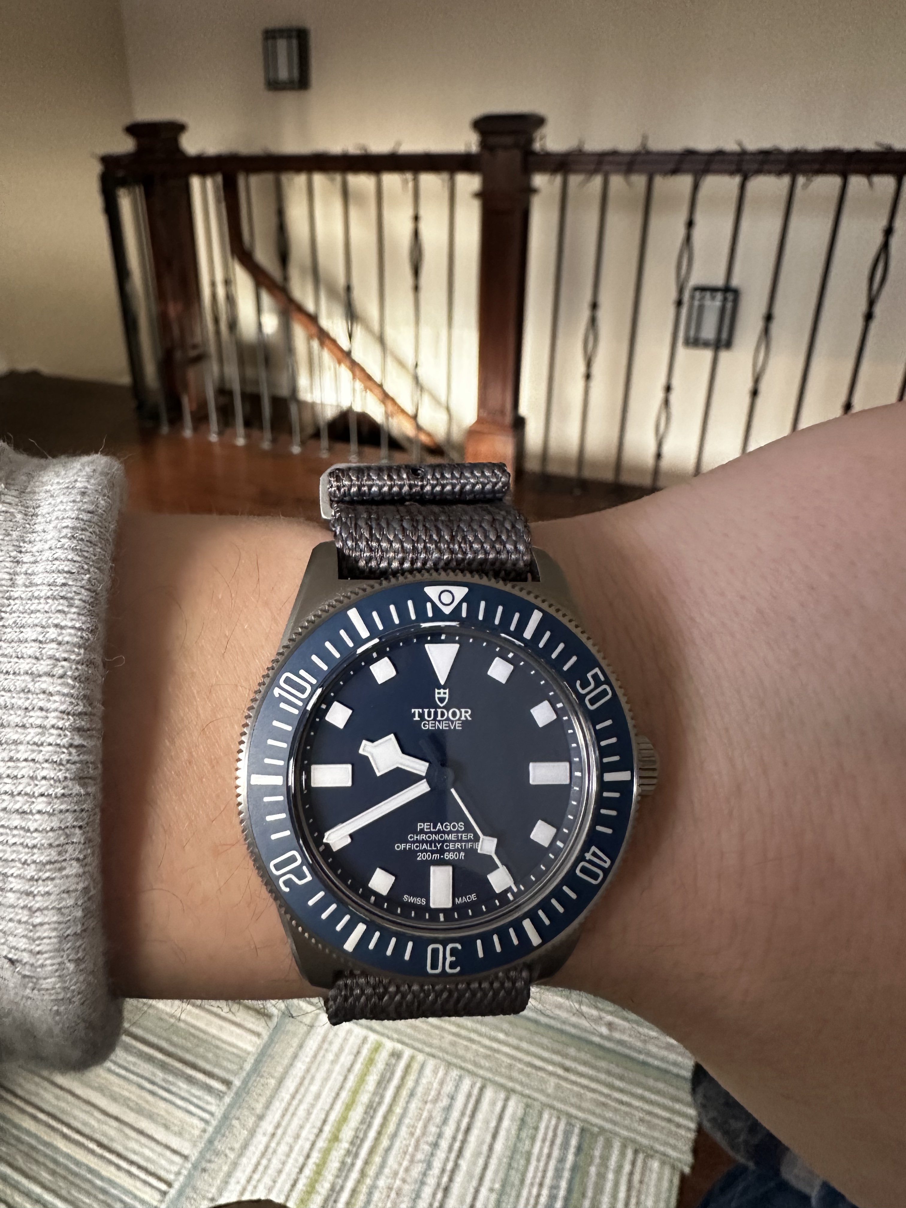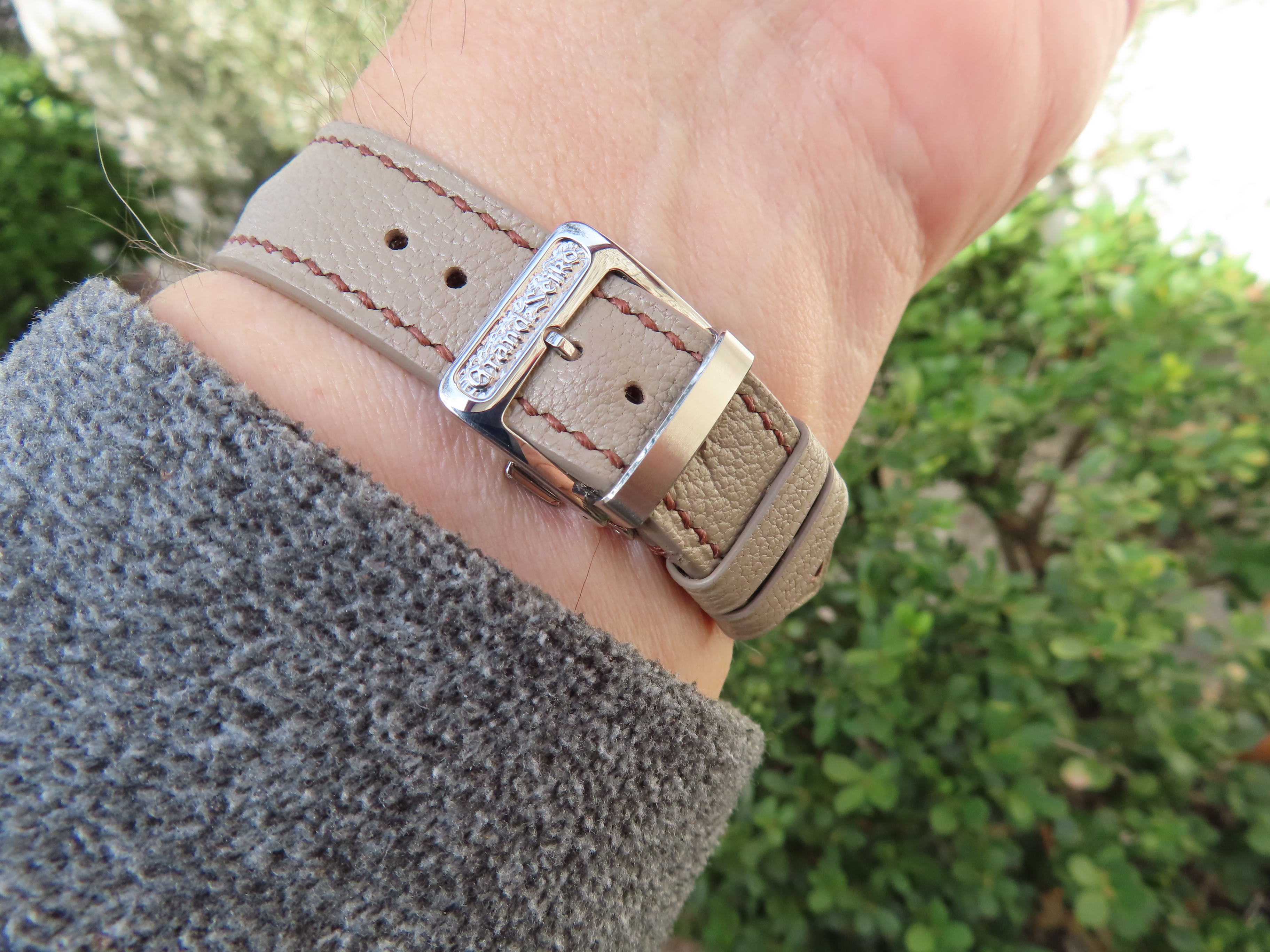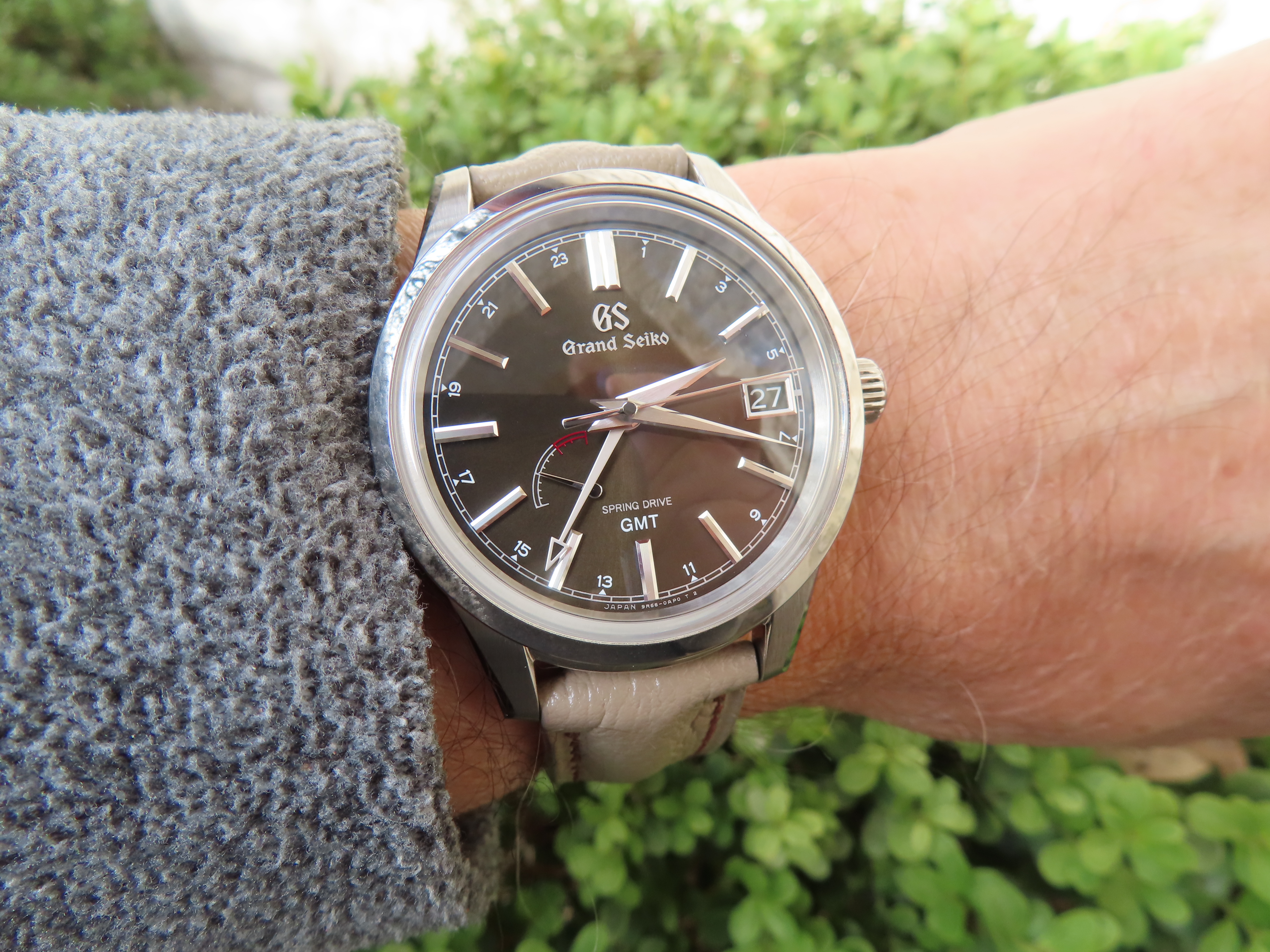 Non-Swiss today, a Grand Seiko Spring Drive GMT. This watch has a chocolate sun ray dial, Seiko puts it on a black croc strap which never seemed right to me to I ordered a padded beige Genteel calf strap with brown stiching to bring it all together. Uncanny accuracy with these watches and the GMT function is easy to use when travelling.