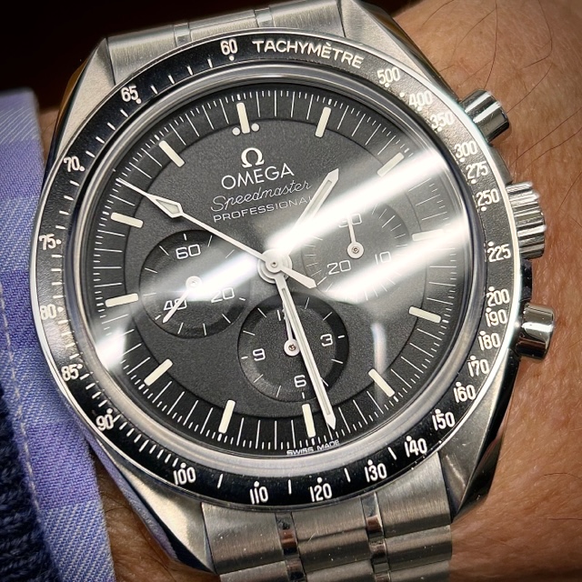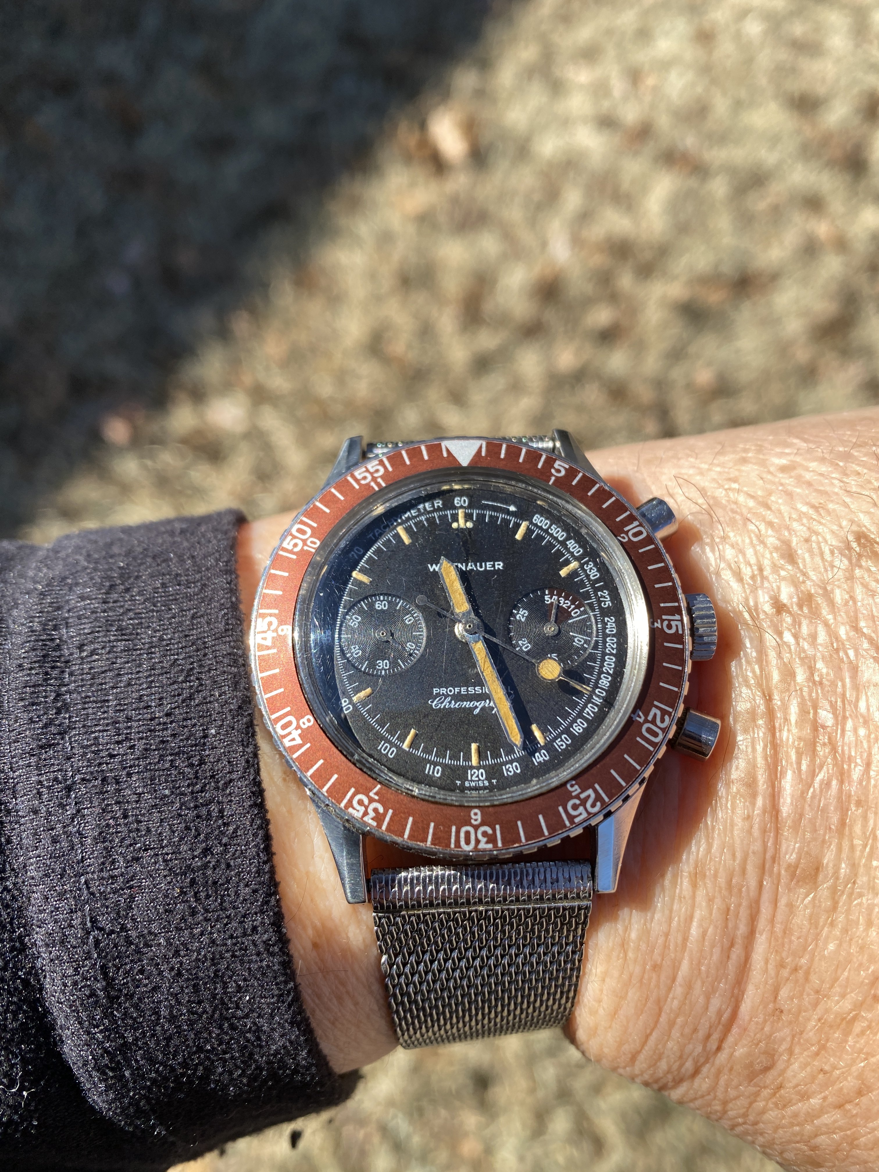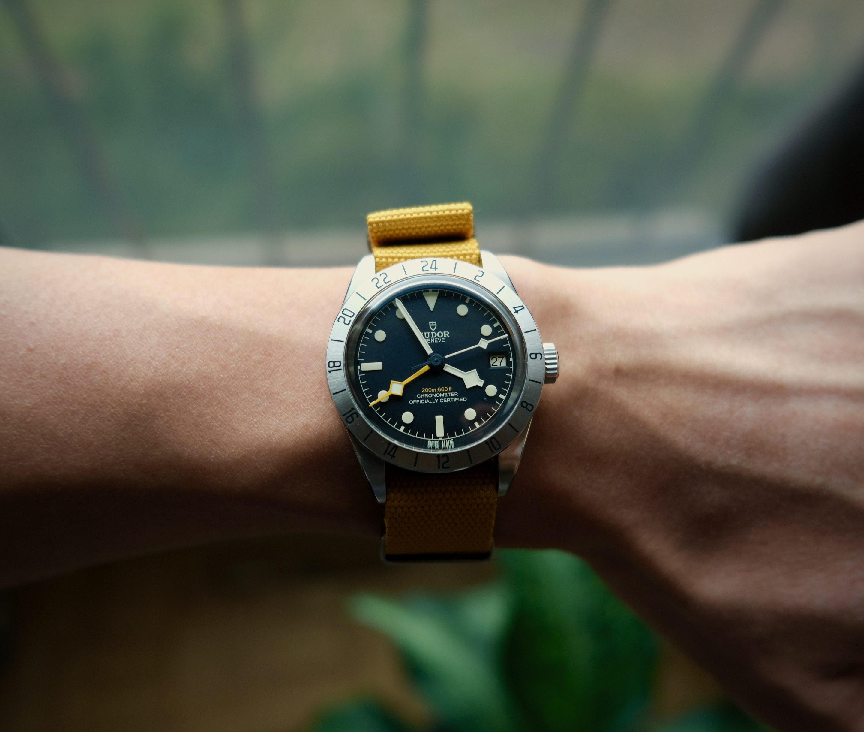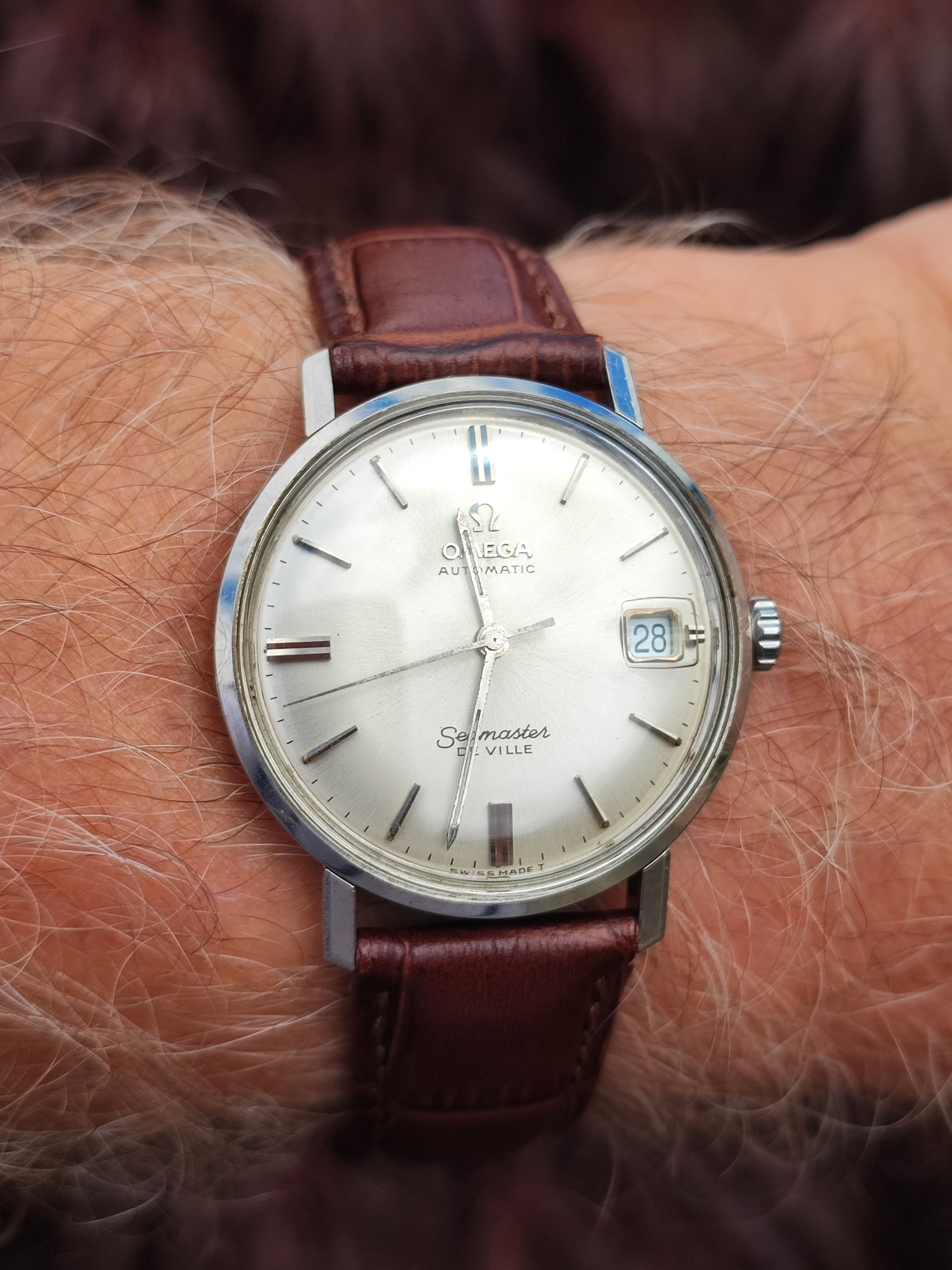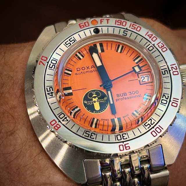 Non-Swiss today, a Grand Seiko Spring Drive GMT. This watch has a chocolate sun ray dial, Seiko puts it on a black croc strap which never seemed right to me to I ordered a padded beige Genteel calf strap with brown stiching to bring it all together. Uncanny accuracy with these watches and the GMT function is easy to use when travelling.