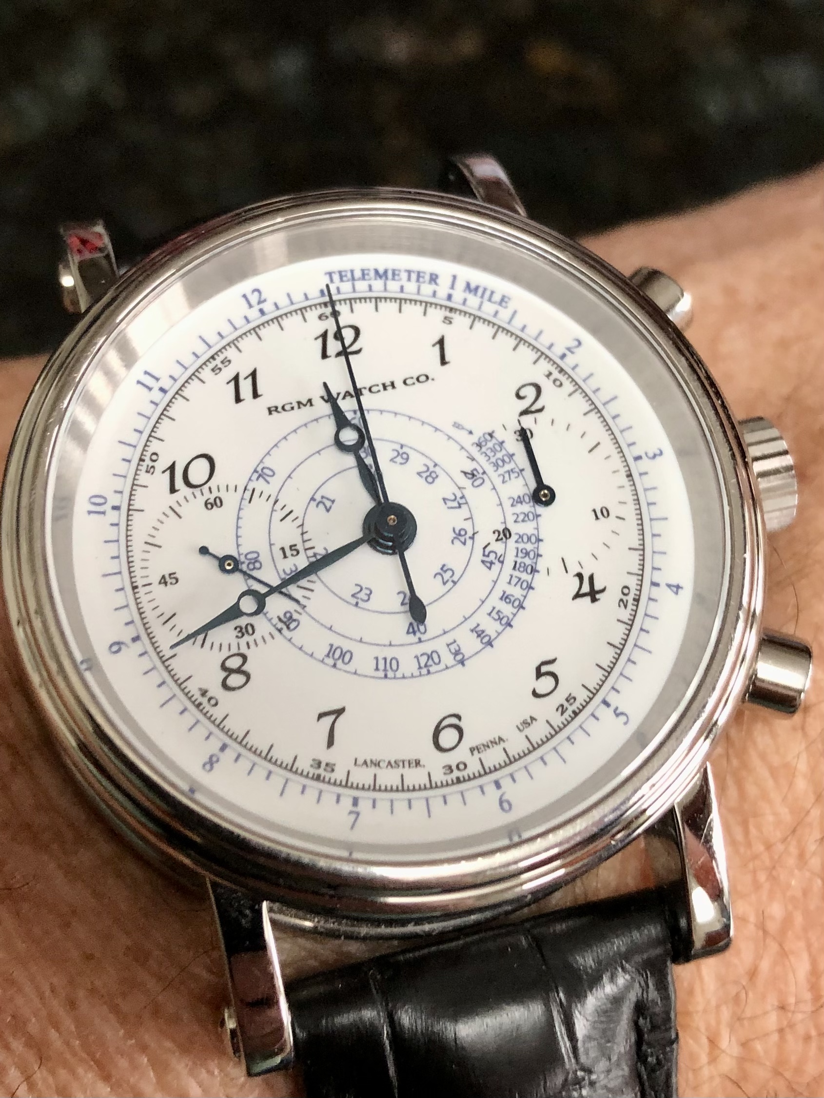 Posts 13,724 Likes 53,551 Larry S ·Jan 4, 2023·Color Commentator for the Hyperbole. RGM 455 with custom grand feu dial on black alligator.
