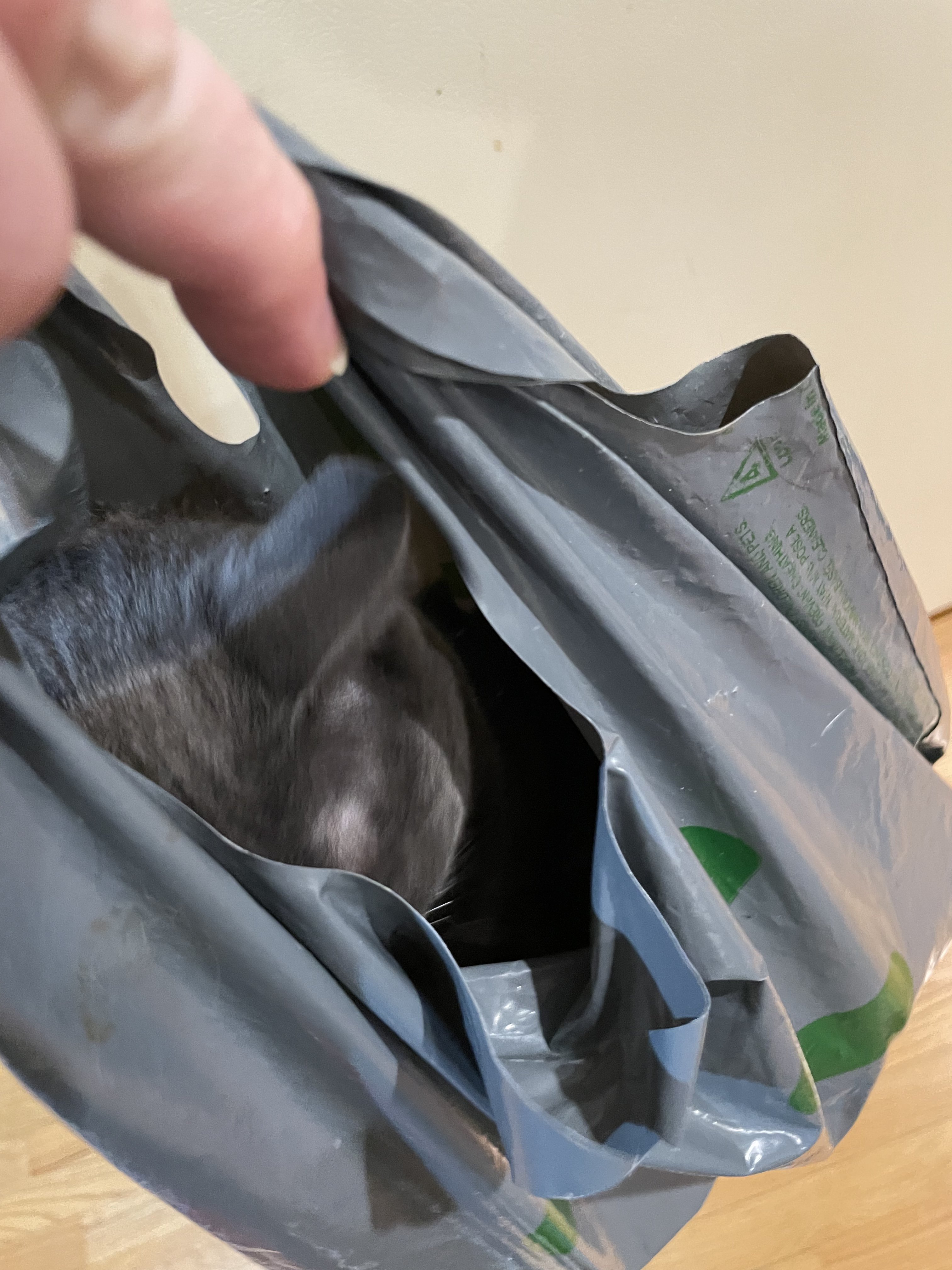 Damn left around 7a this AM just getting home. I did the grocery shopping after work as I have a busy one day off Rocky Raccon was happy to see me and hopped in the grocery bag. He really likes me walking around the house with him in a bag. I’m thinking a walk outside tomorrow and maybe eventually I can take him shopping with me.